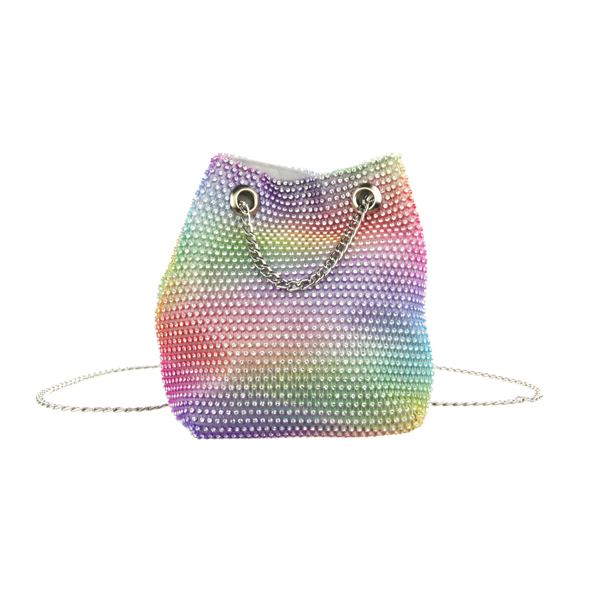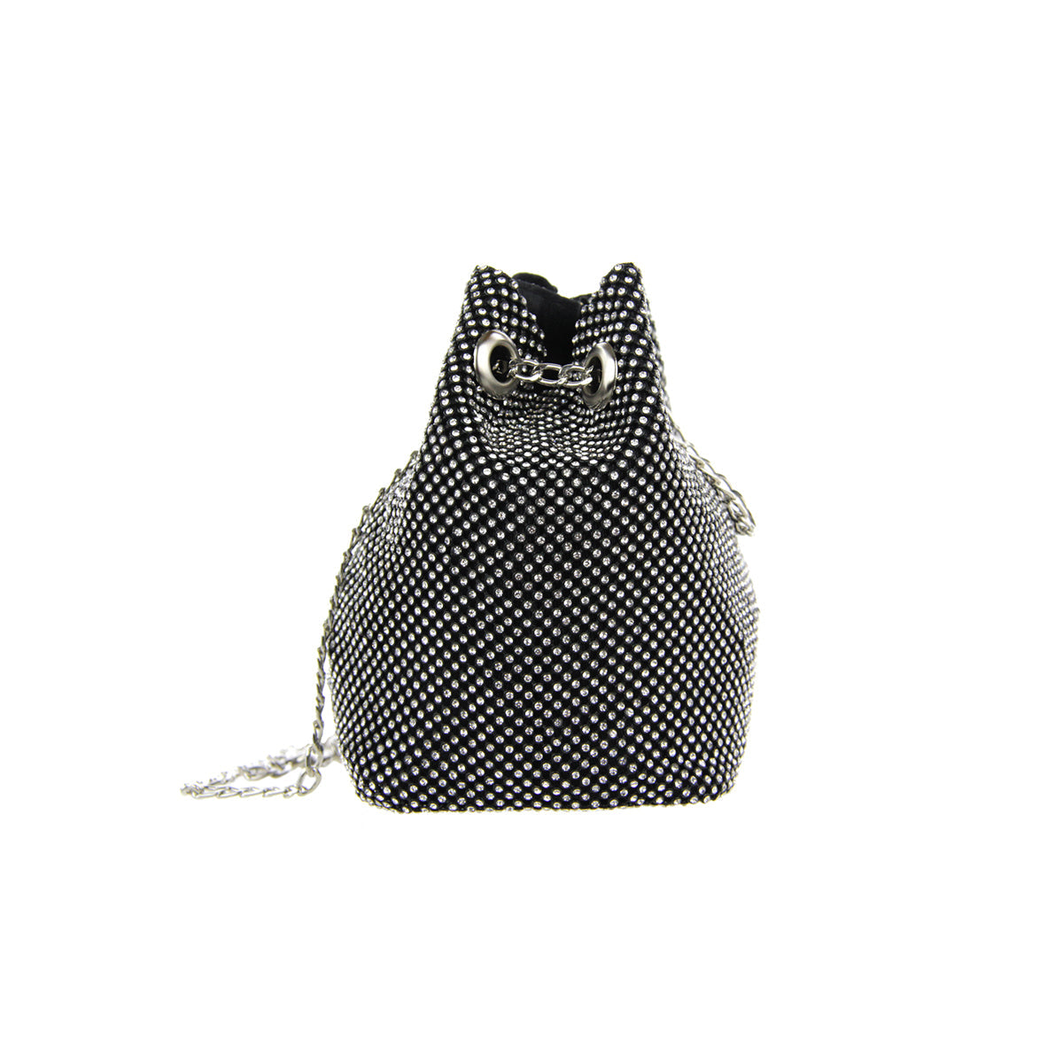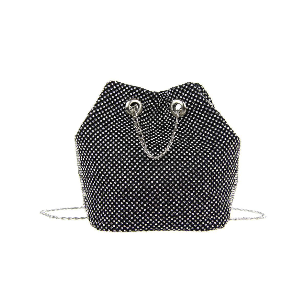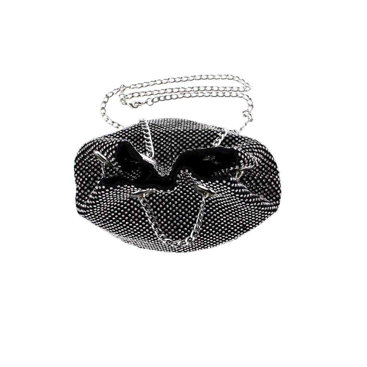 The Cami Phone Crossbody is perfect for an night out! Can fit an iPhone 11Pro Max, as seen in top view photo. The Cami features mesh rhinestones all over, chain strap, and magnetic snap.