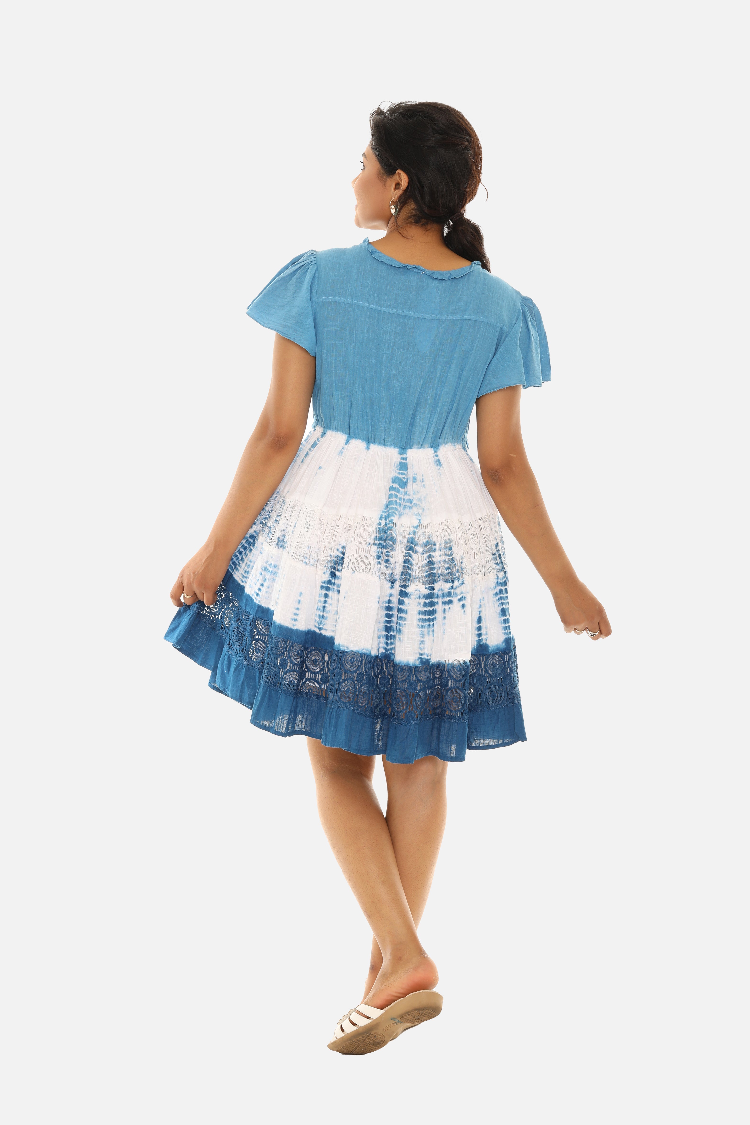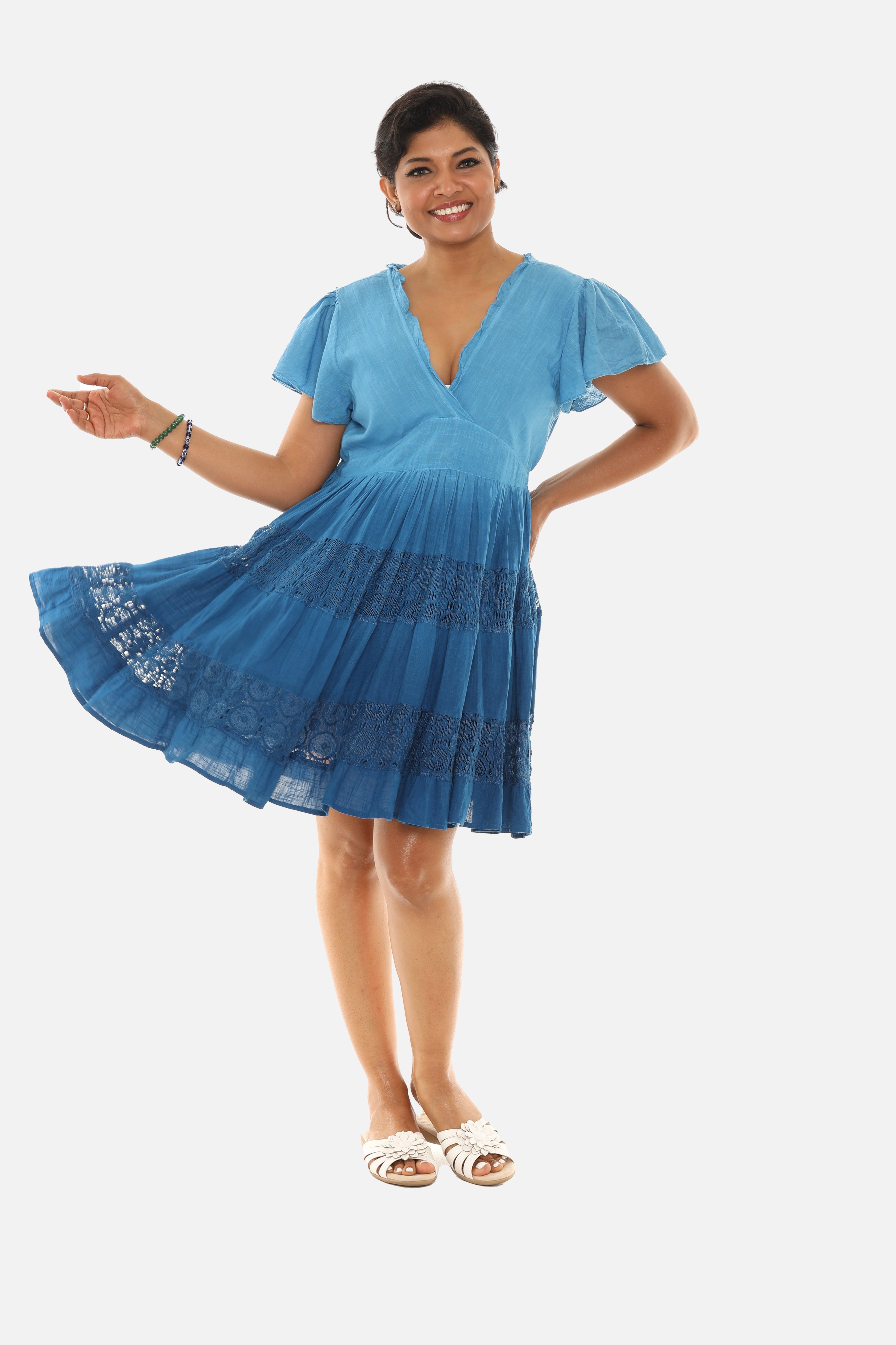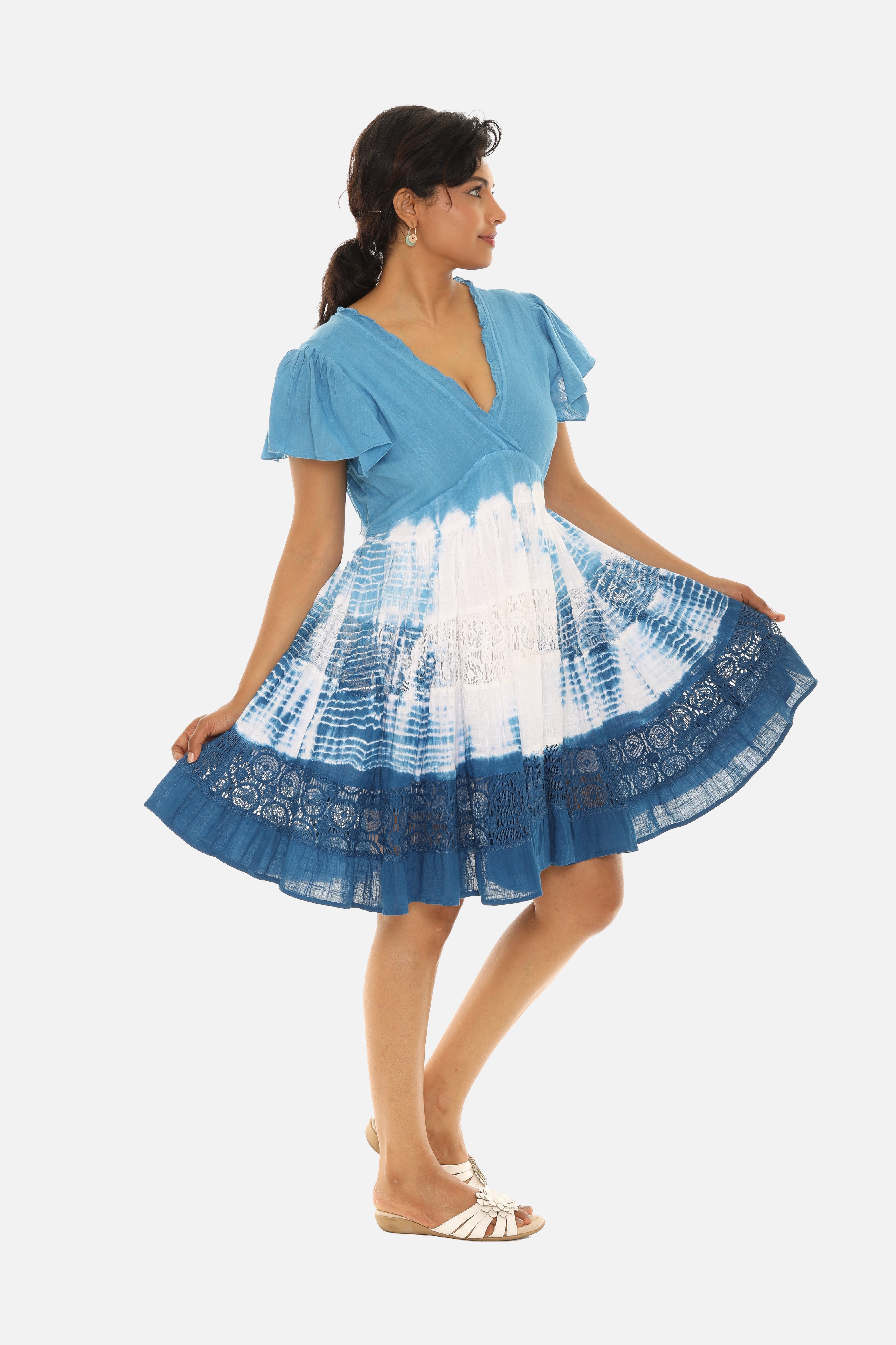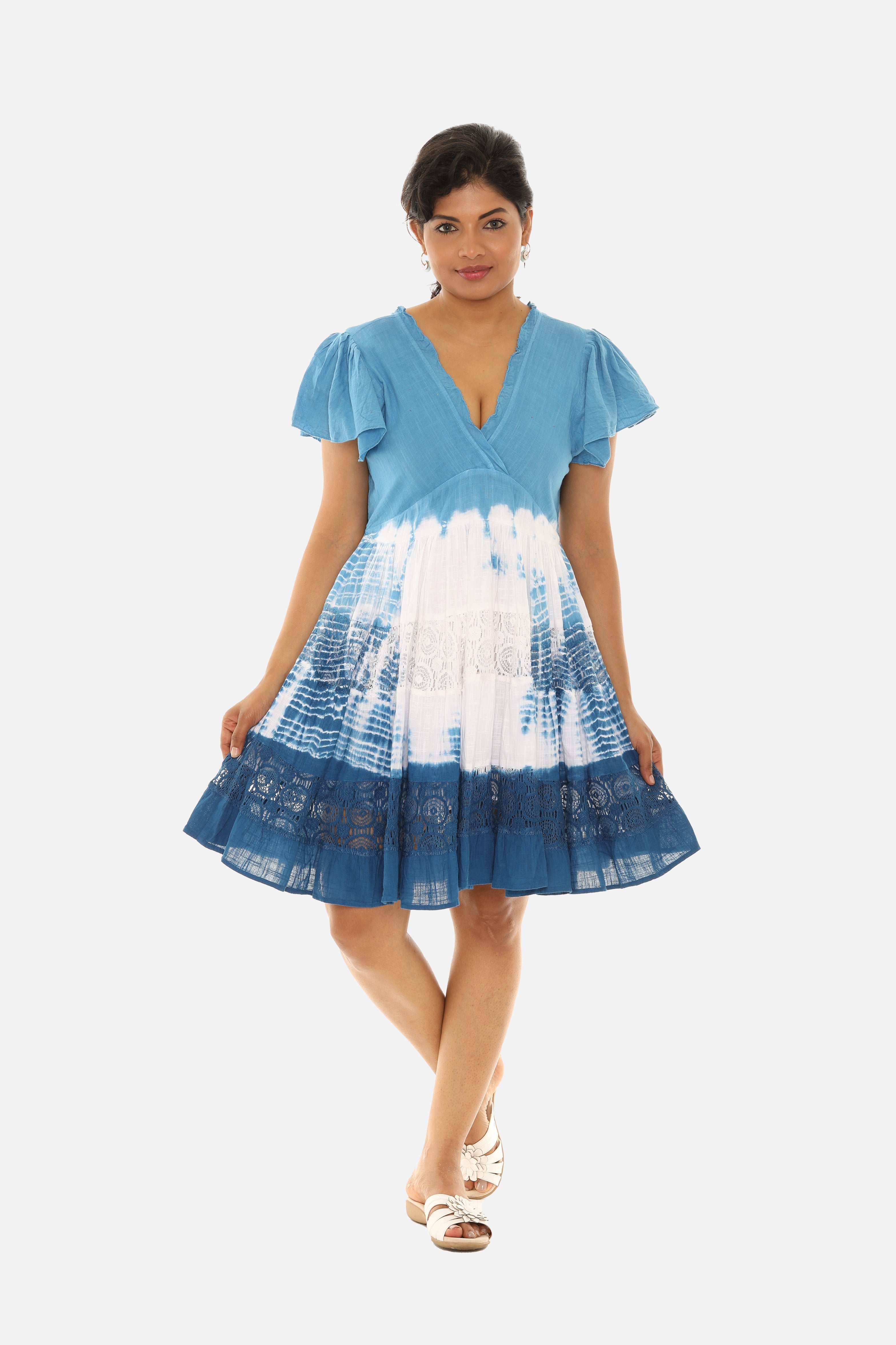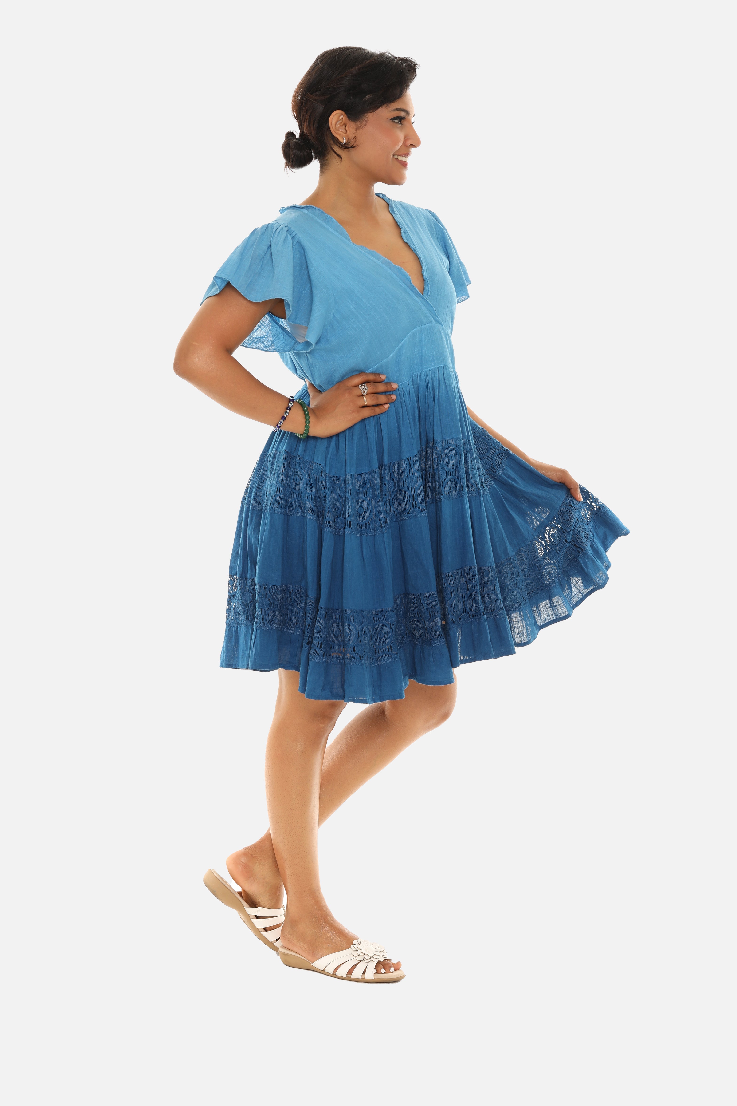 Tonal empire-waist dress featuring flutter sleeves and a v-neckline. Eyelet lace panels on the skirt.