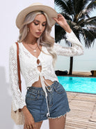Openwork Drawstring V-Neck Long Sleeve Cover-Up