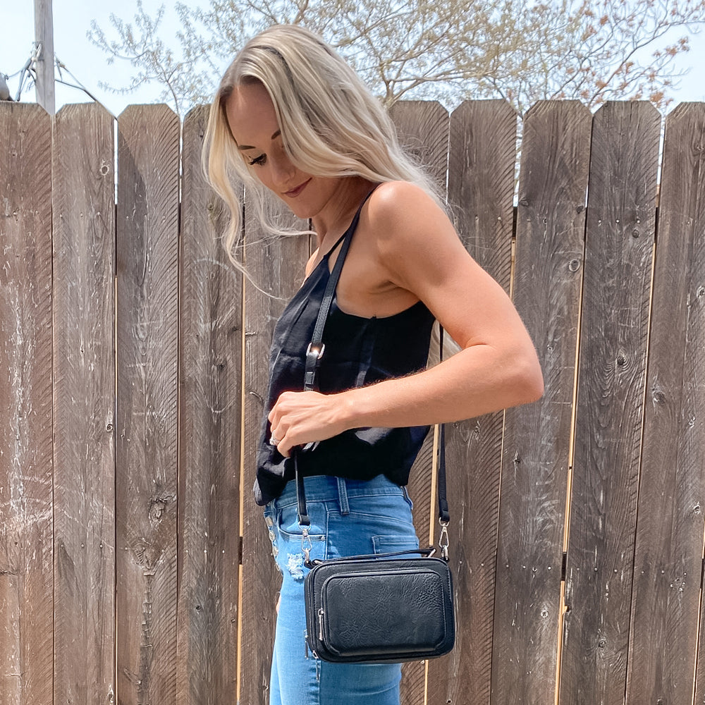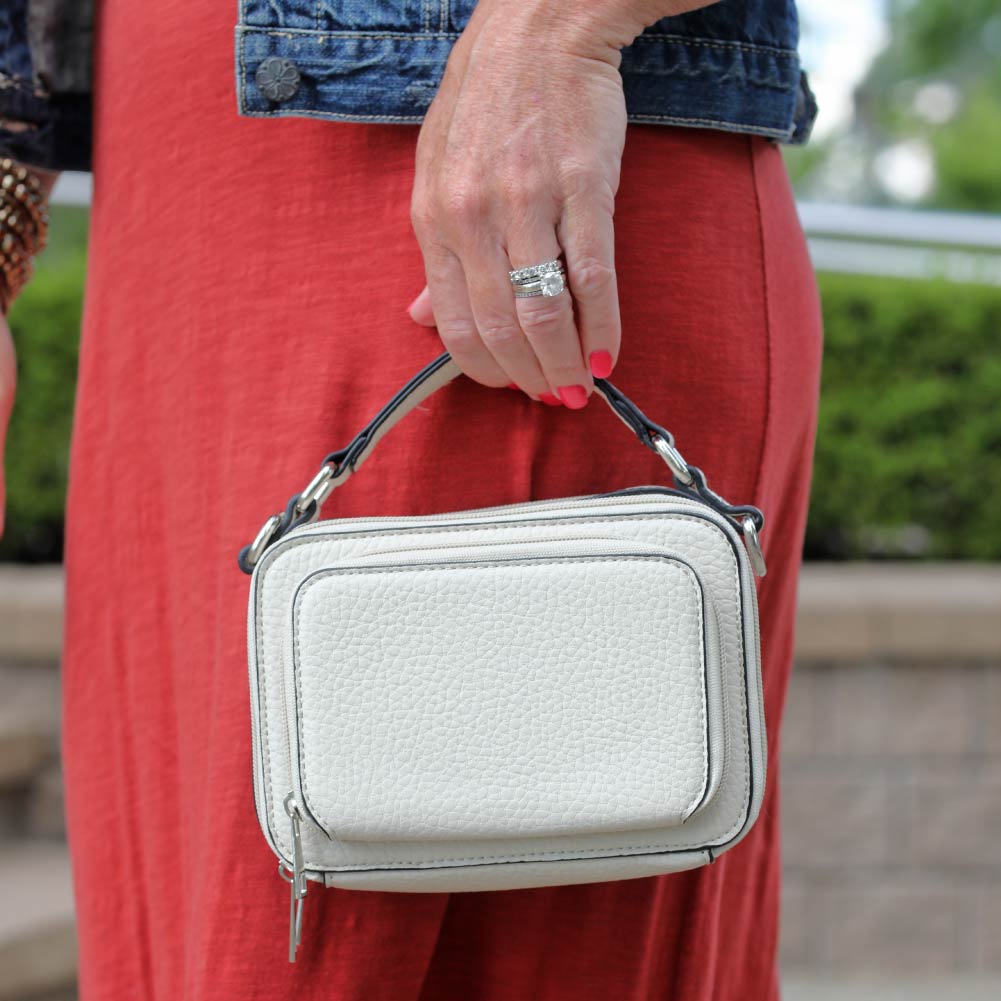 - 47” detachable, adjustable vegan leather strap (color matches bag)