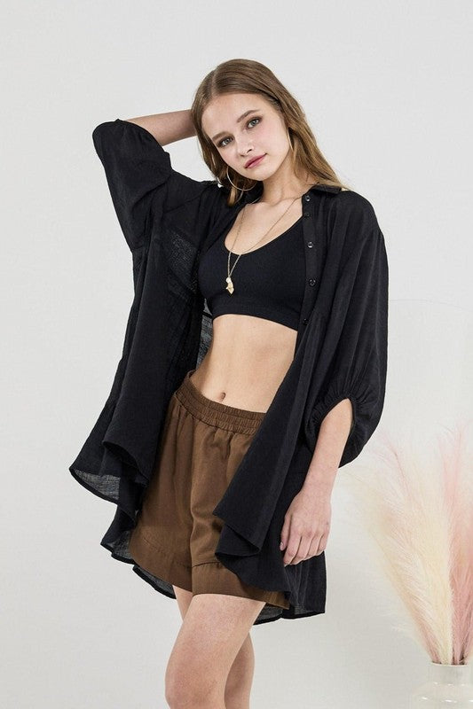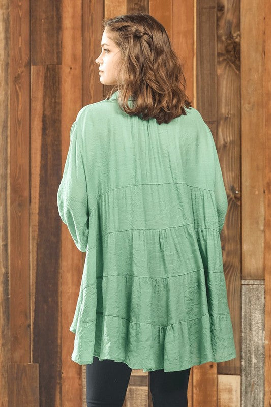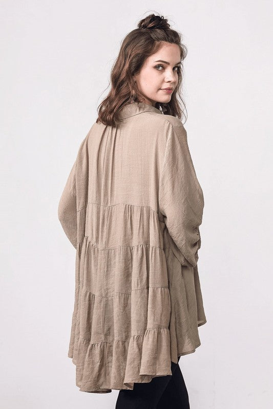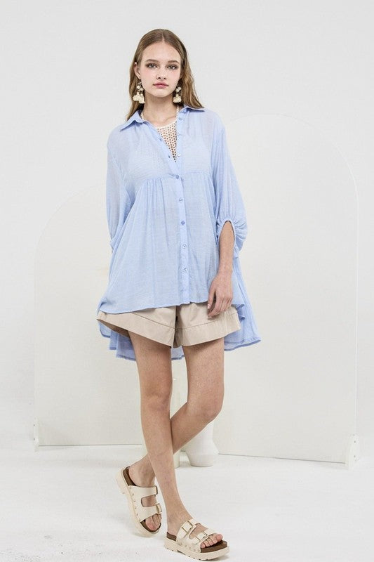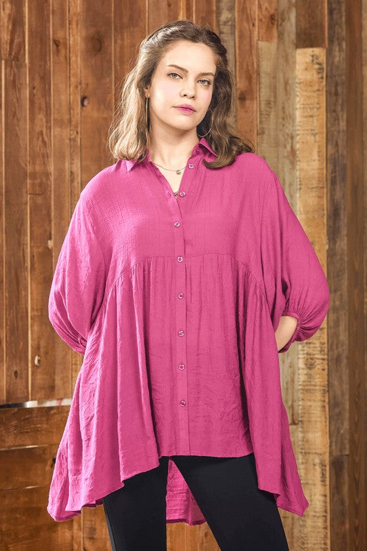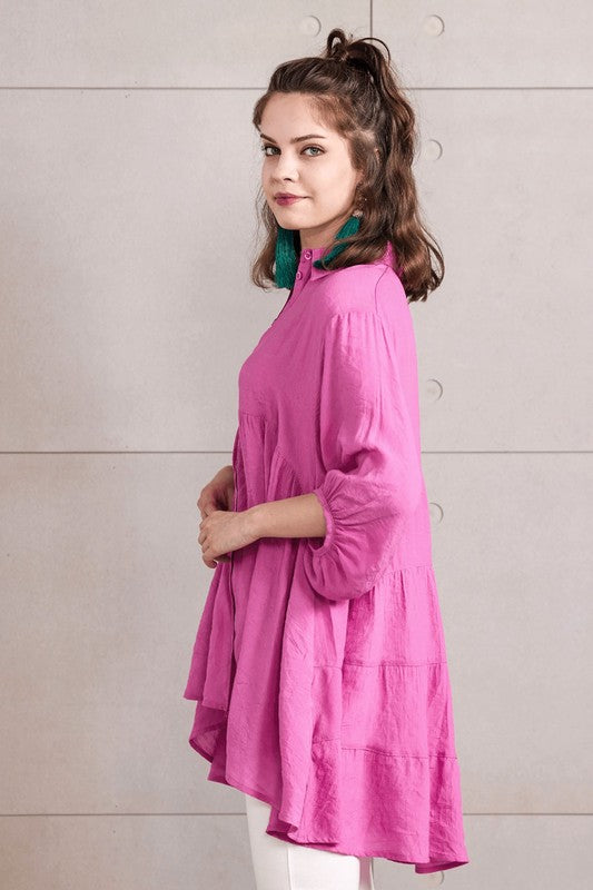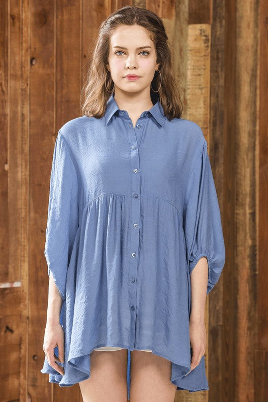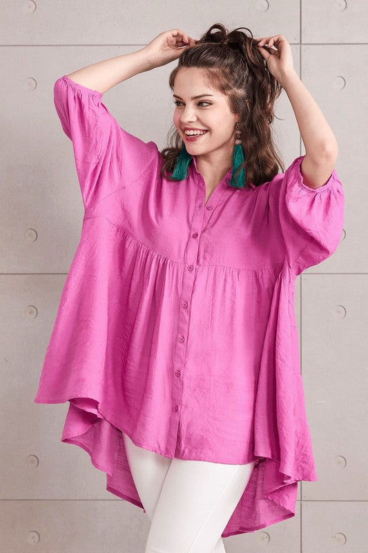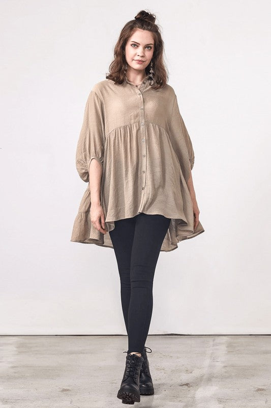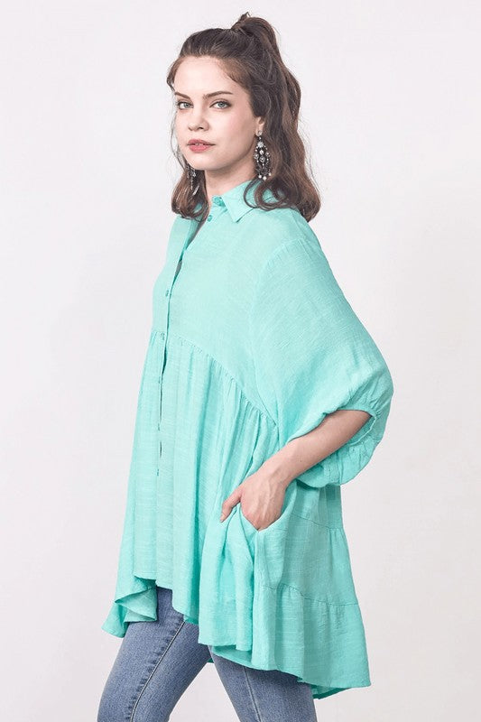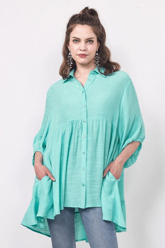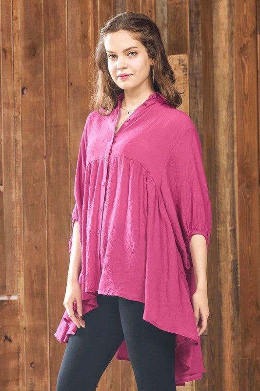 This tunic features a collared neckline, 3/4 bubble sleeves, and a functional button-down front detail with a babydoll fit. Plus, the high-low ruffle hem flares wonderfully, which creates a feminine look.