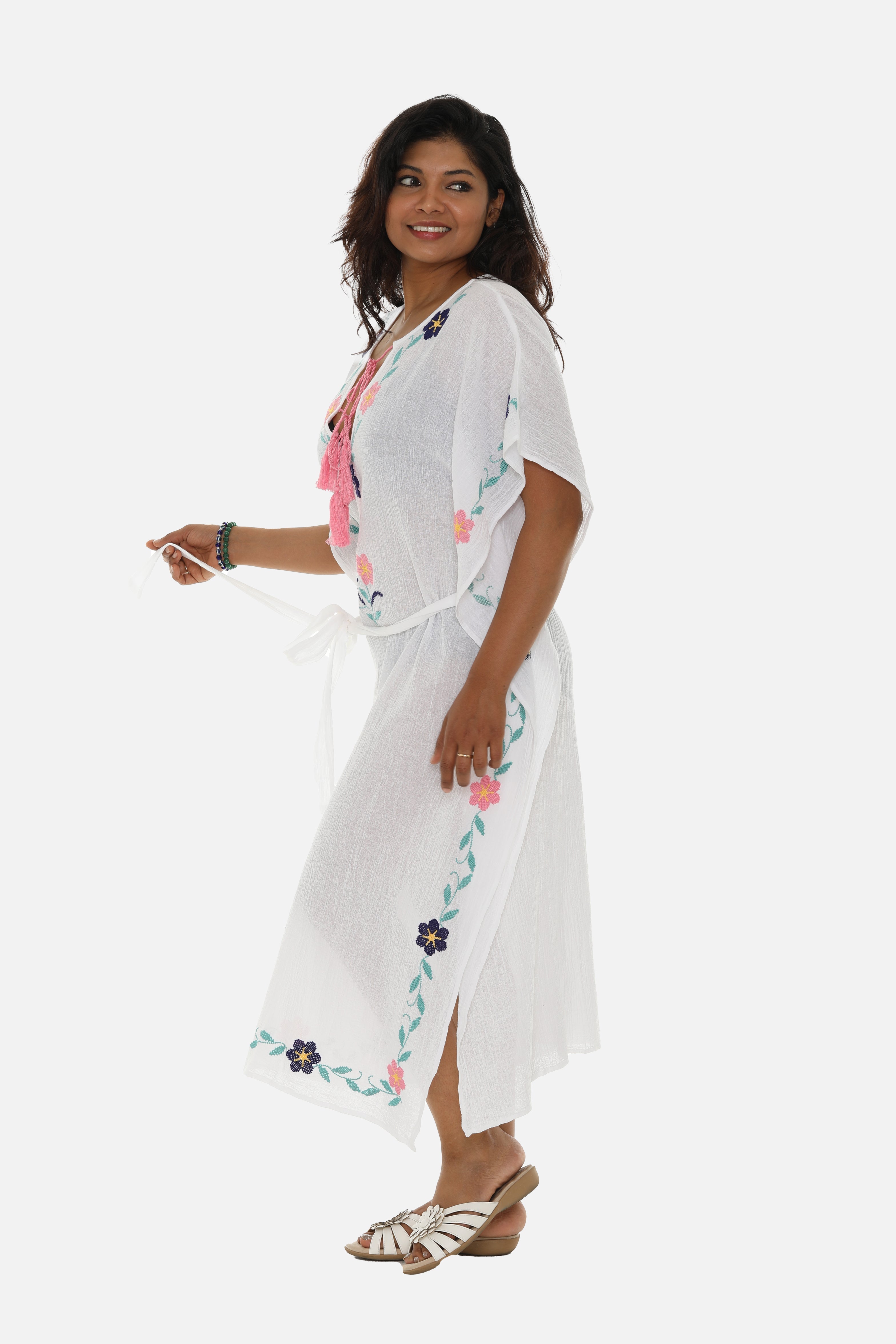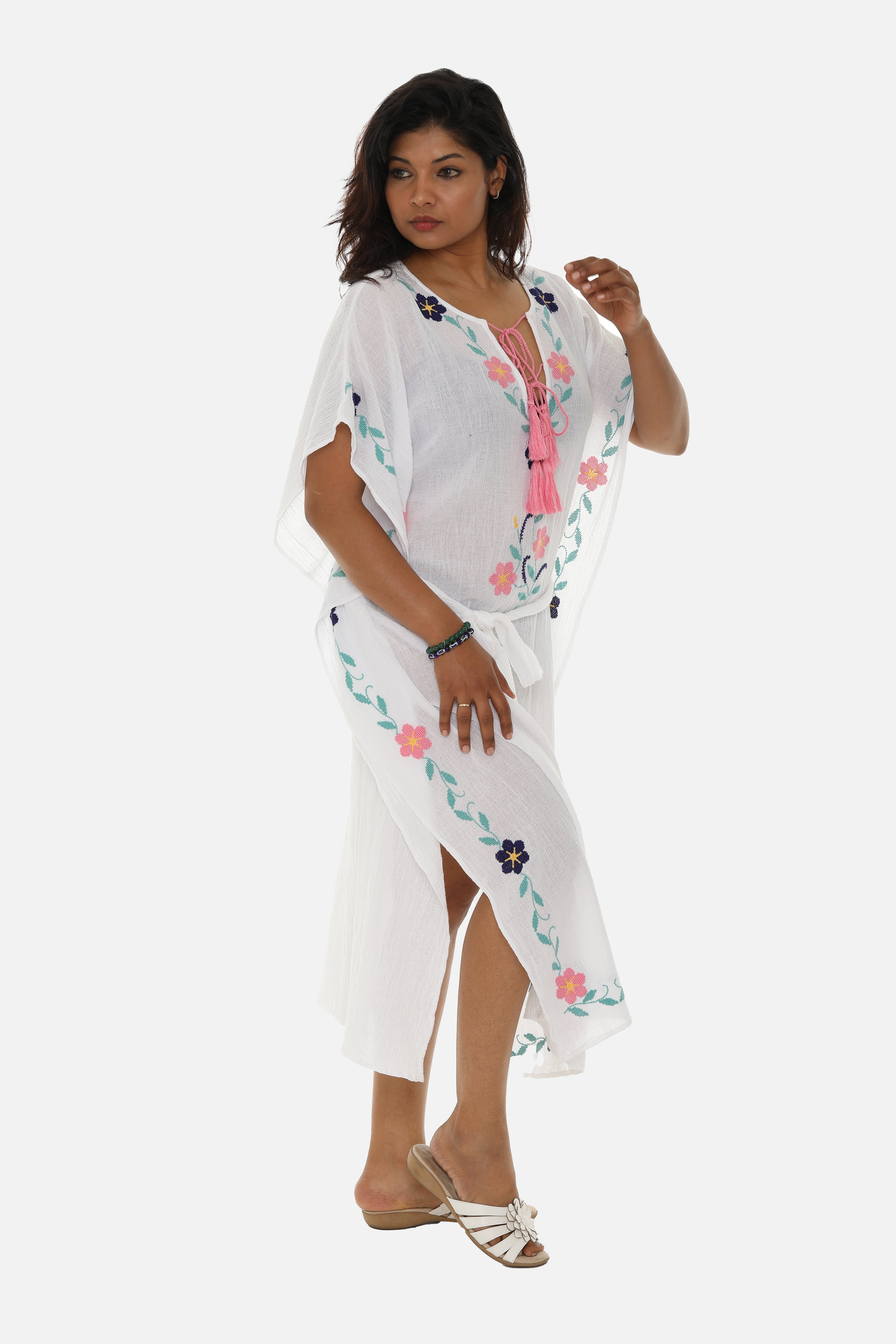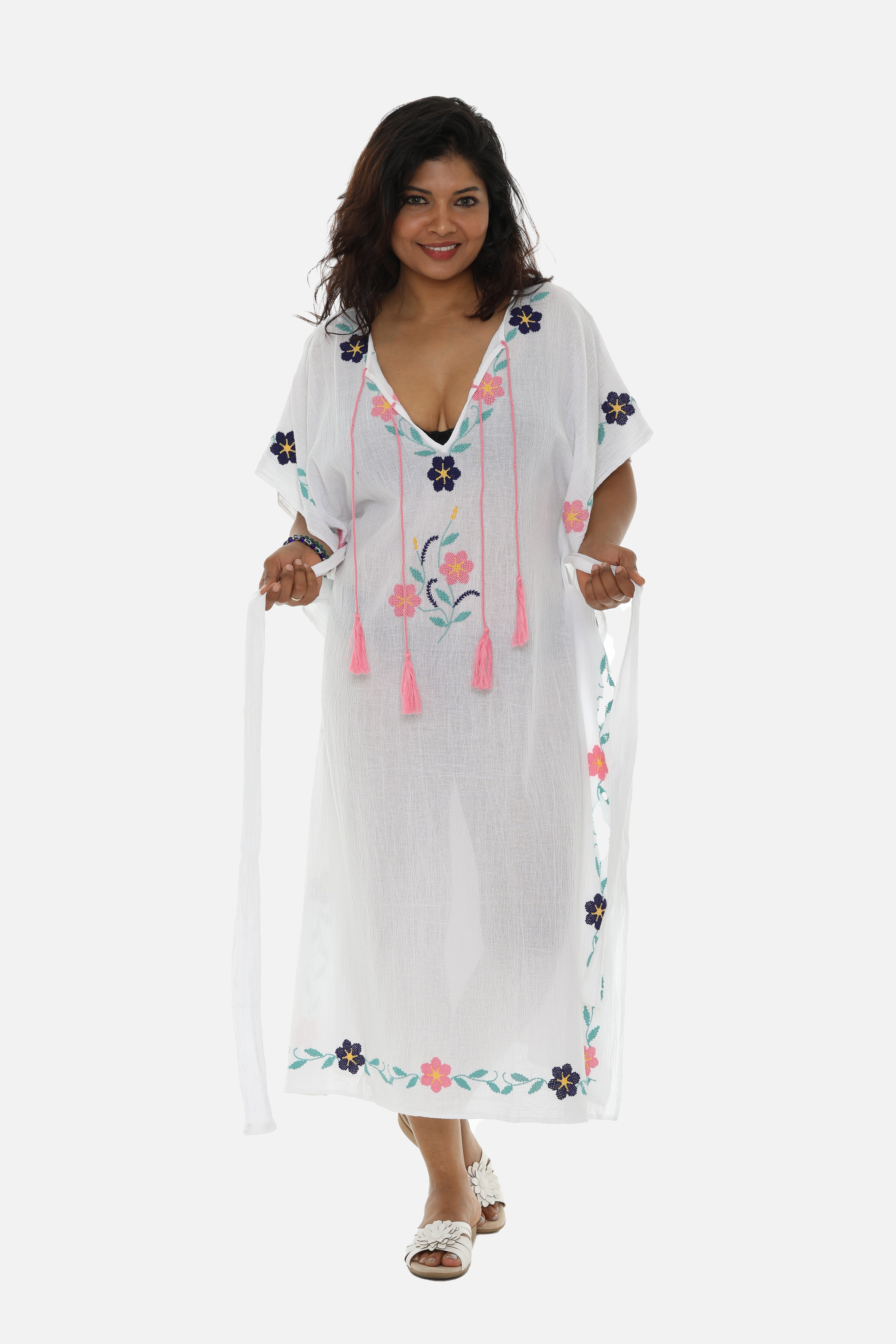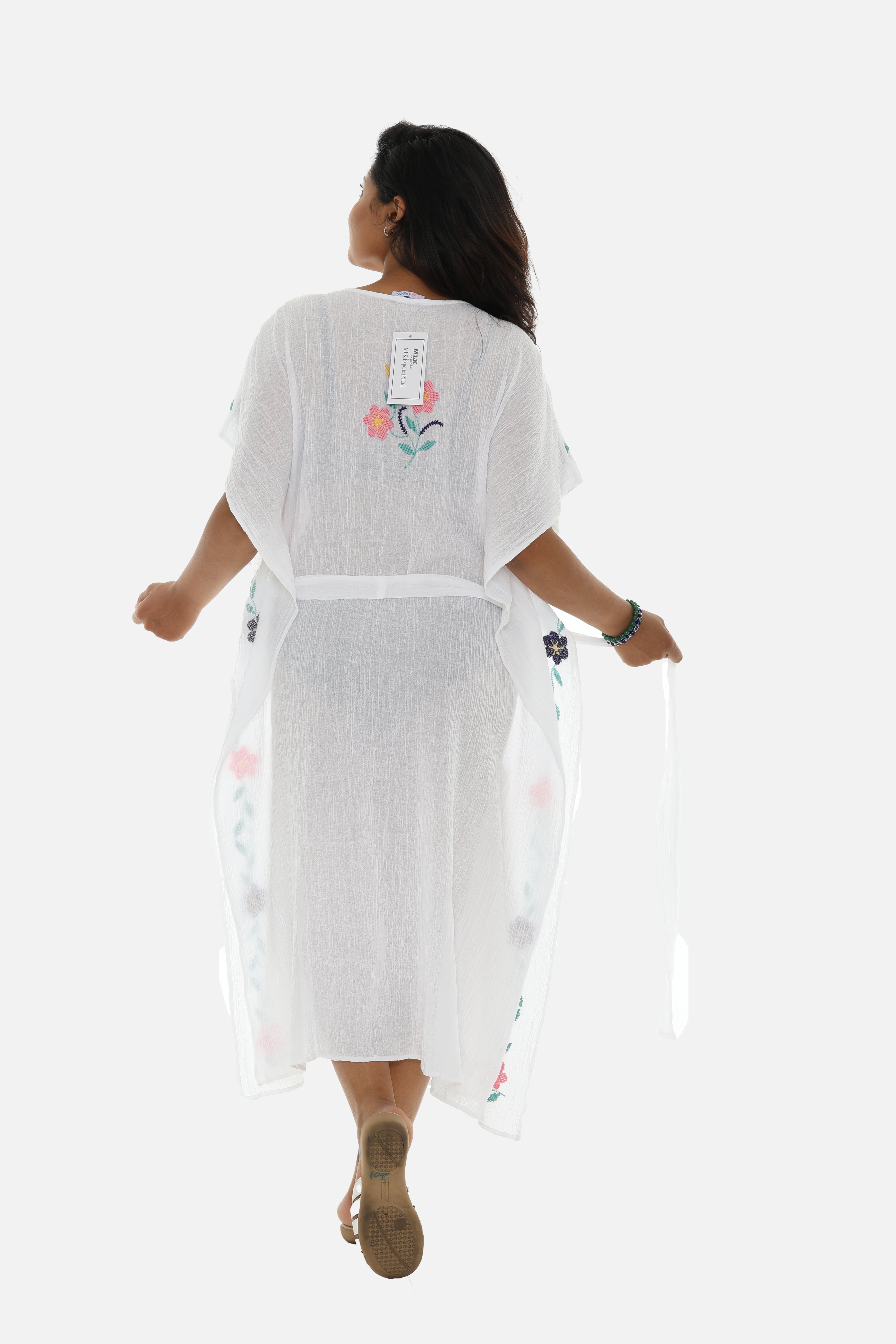 This Kaftan is as delicate and feminine as a midsummer night's dream. The lovely caftan features intricately embroidered floral motifs in soft and feminine pastel hues. The hand-free sleeves and generous neckline complete this bohemian ensemble.