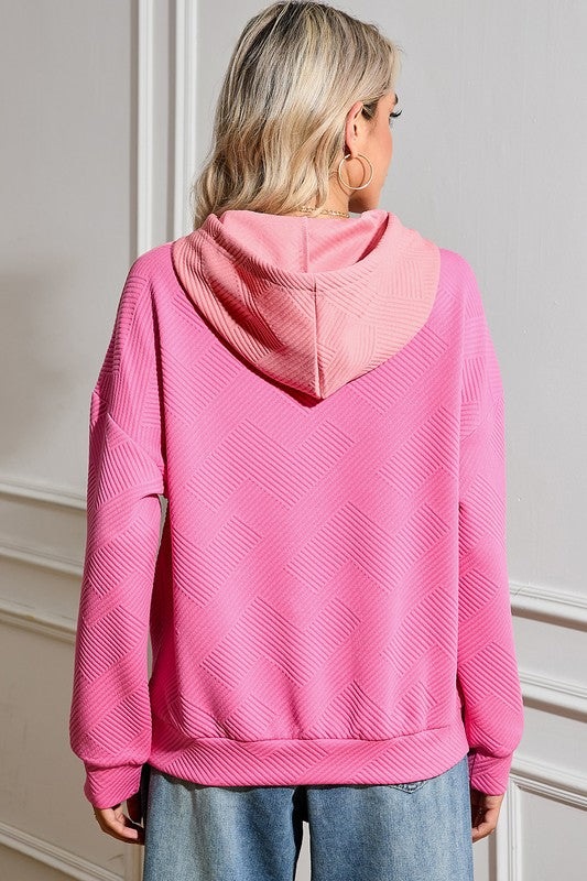 The unique Patchwork detailing adds a trendy touch to this cozy hoodie, making it a standout piece in your wardrobe. The Pink hue adds a pop of color that's both fun and stylish.