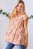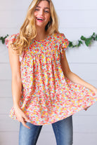 Make a statement with this peach and coral floral print tiered ruffle top with a back clasp keyhole. Designed with flutter sleeves and merrow stitching, this charming top with a linen feel is simply divine.