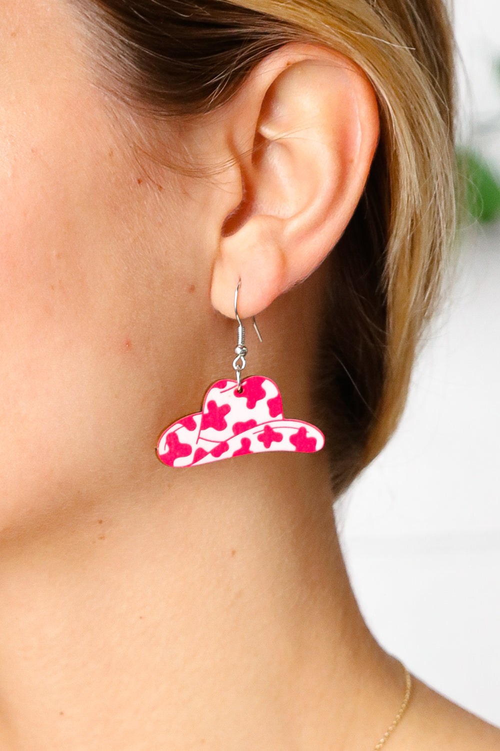 Add casual chic to your accessory ensemble with these pink wooden cow print hat earrings with a striking paint design. A must have for your summer closet!