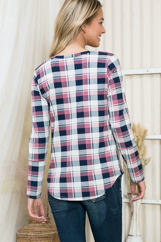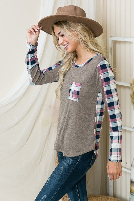 Knit Jersey plaid print contrast on light sweater knit. Front pocket detail crew neck.