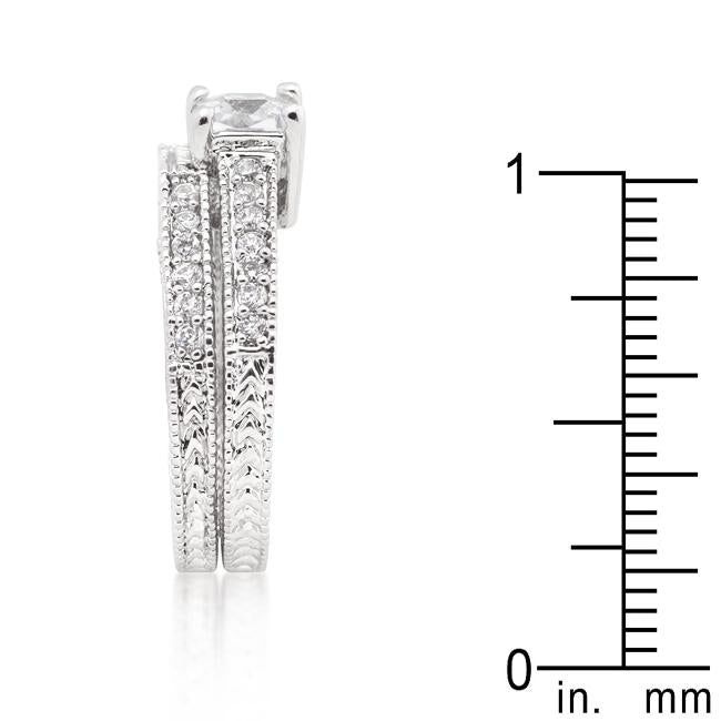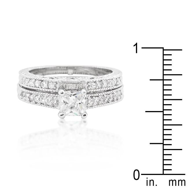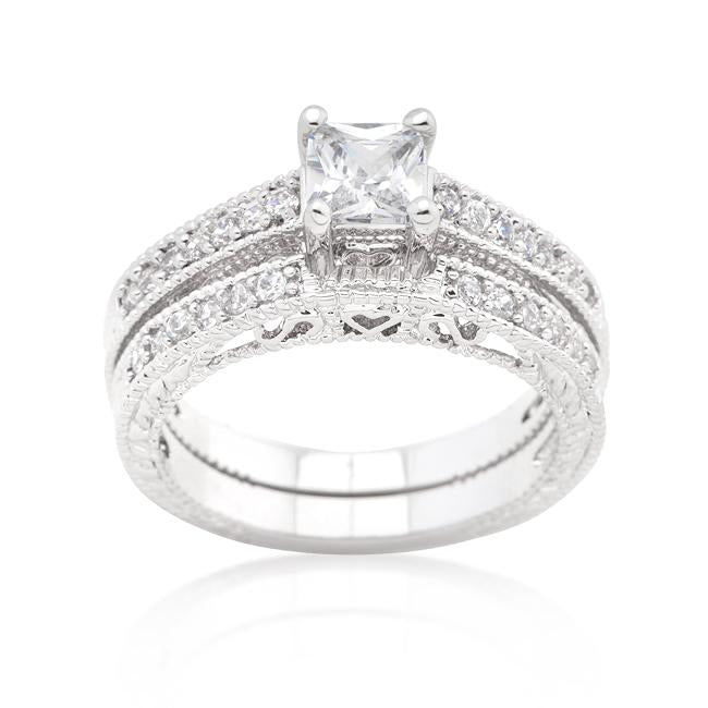 Delicately drawn designs surround this sets princess cut stone and round cut accents. Our genuine rhodium finish is achieved using an electroplating process that coats the item with heavy layers of rhodium a close cousin to platinum which gives our jewelry a platinum luster.
