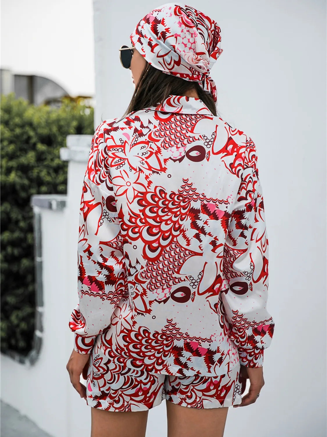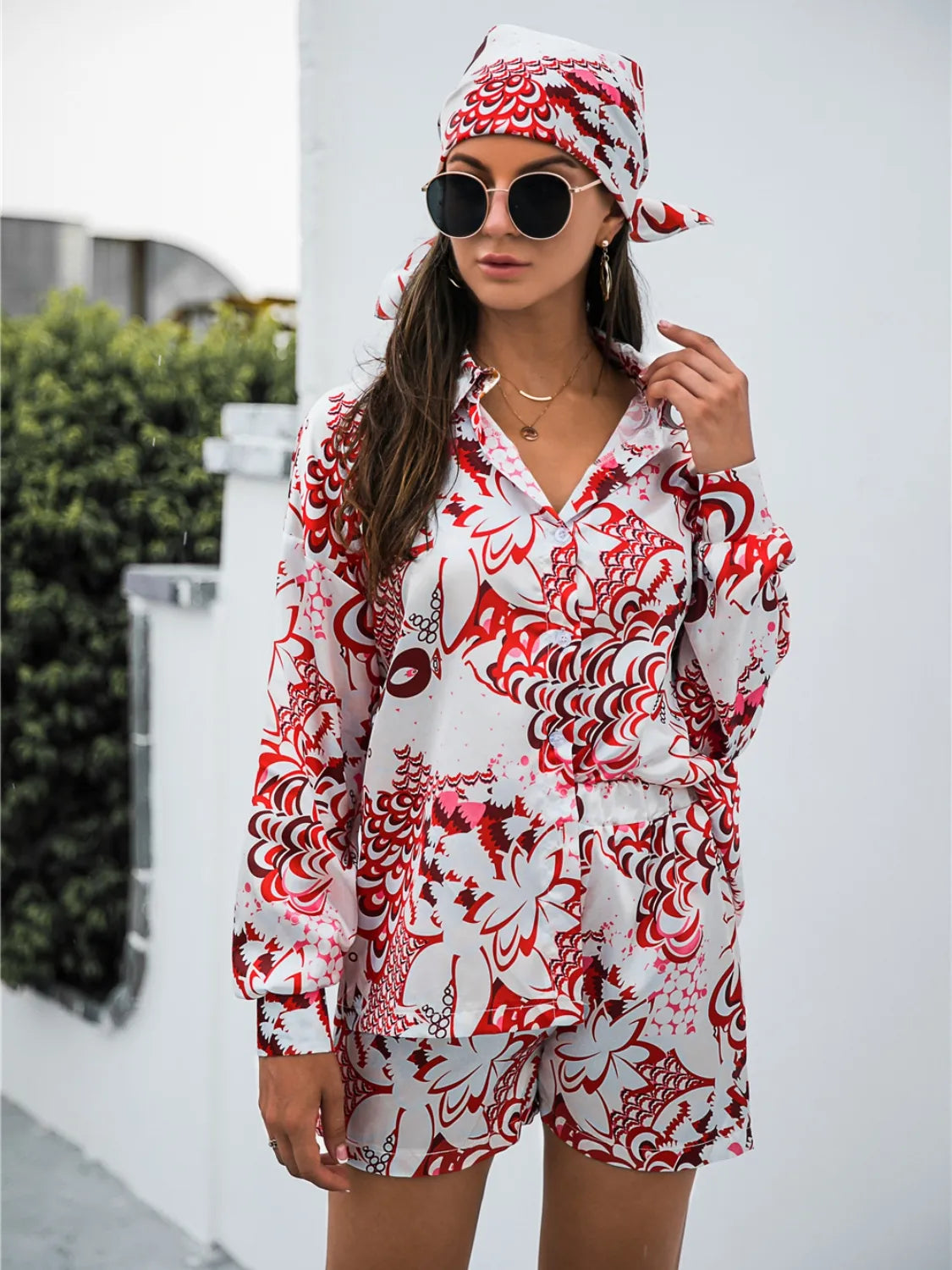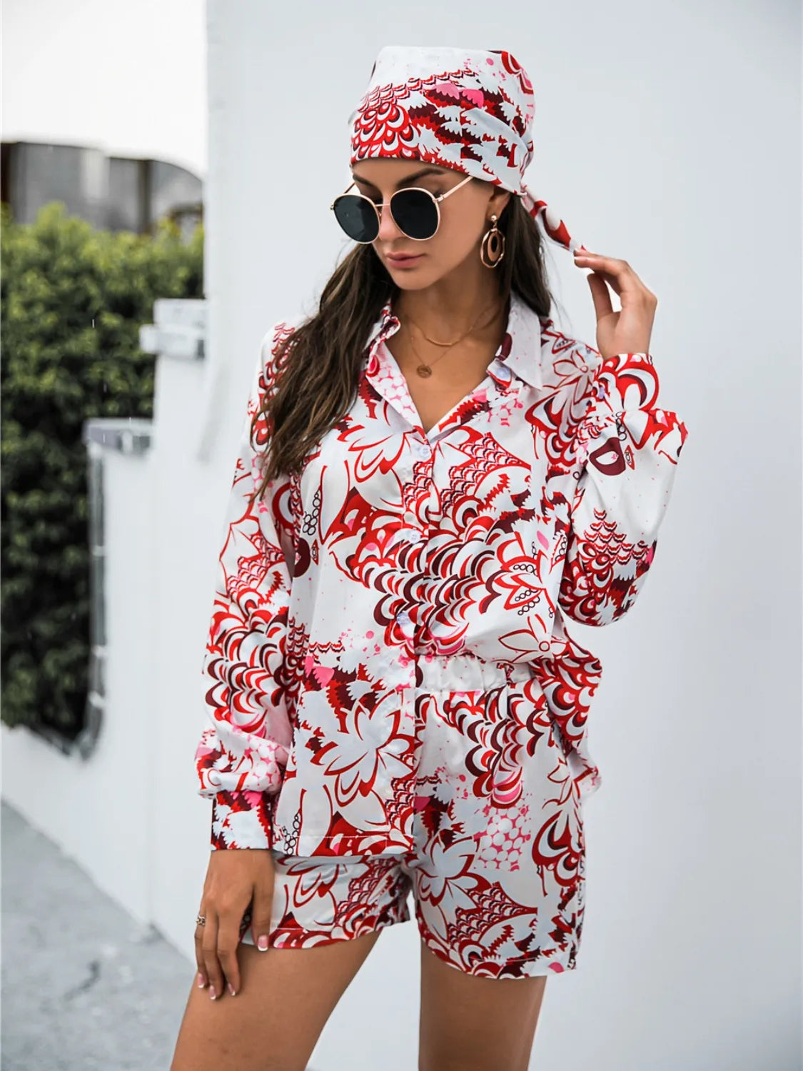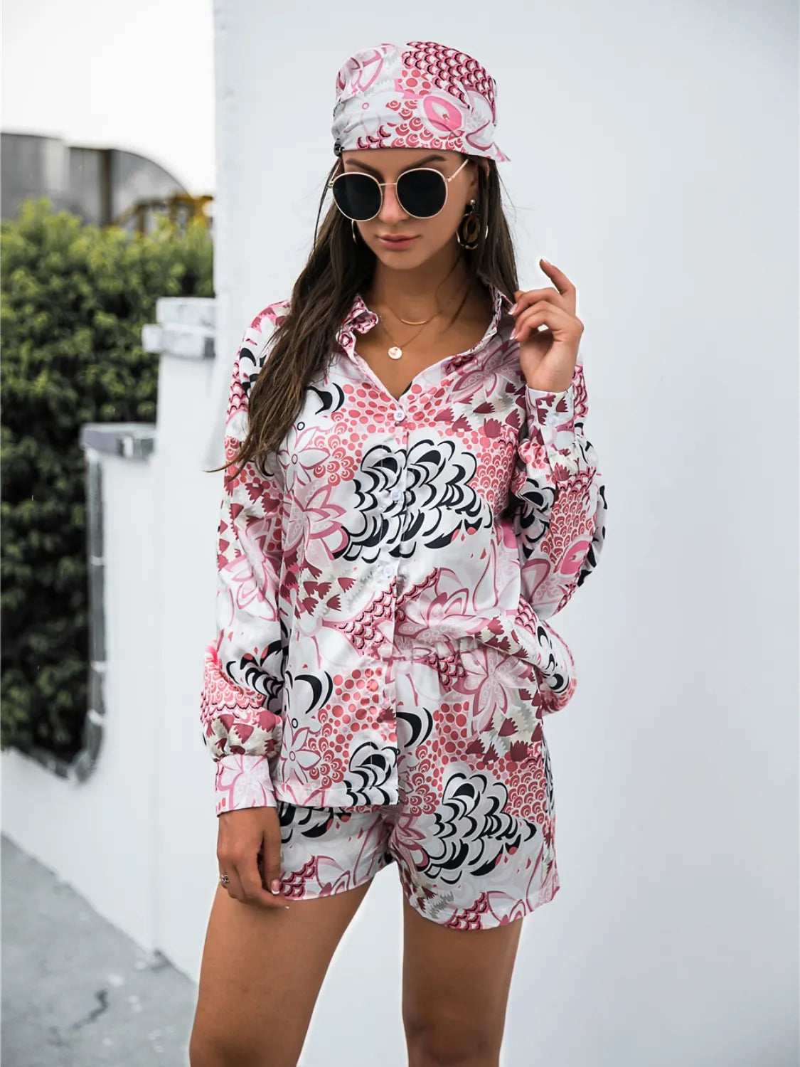 Printed Button Up Long Sleeve Shirt and Shorts Set