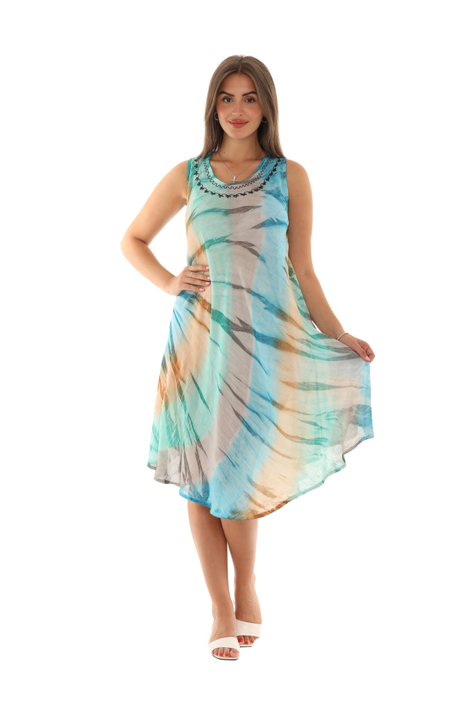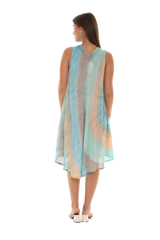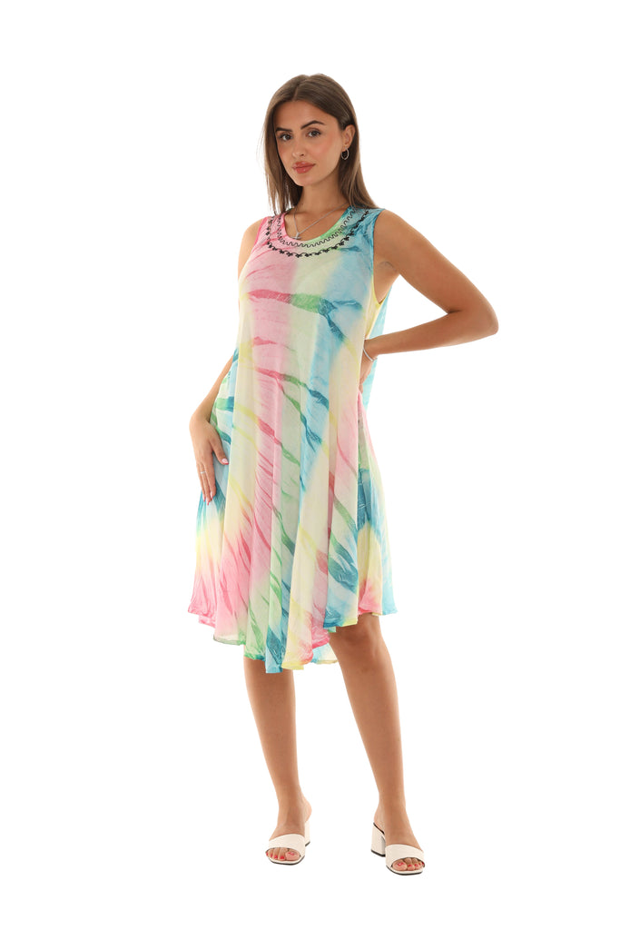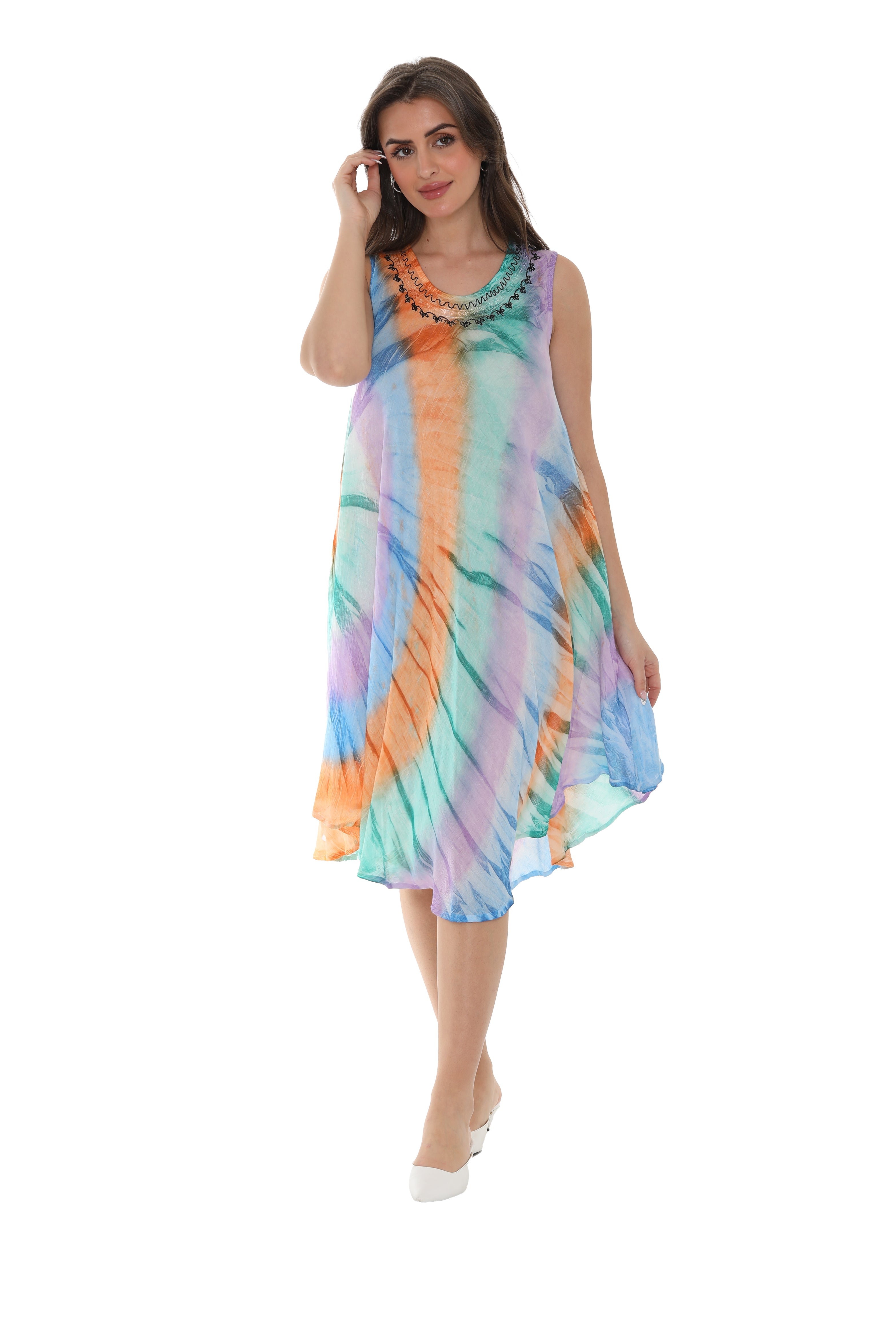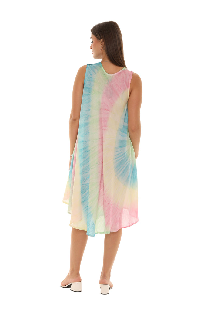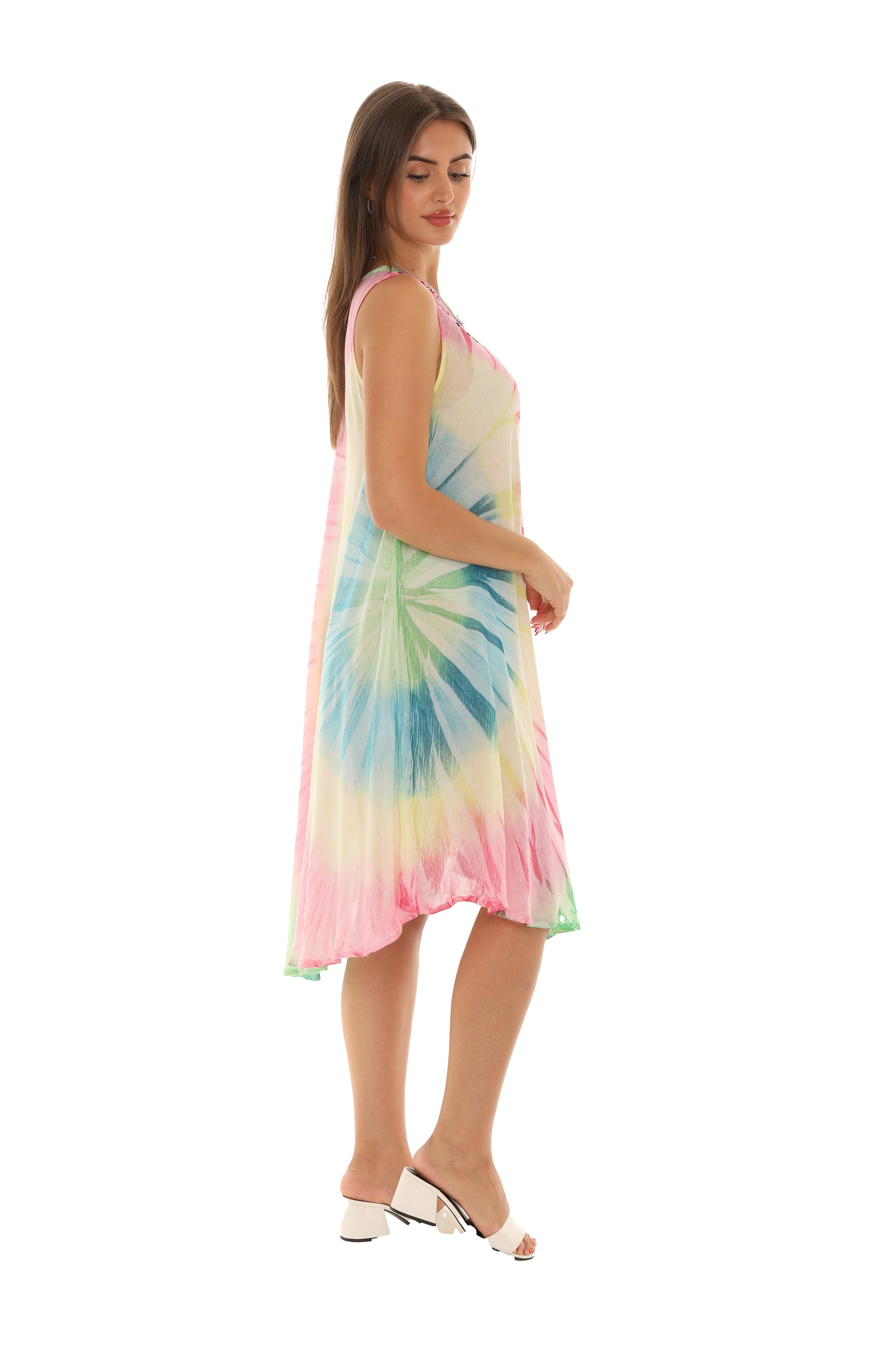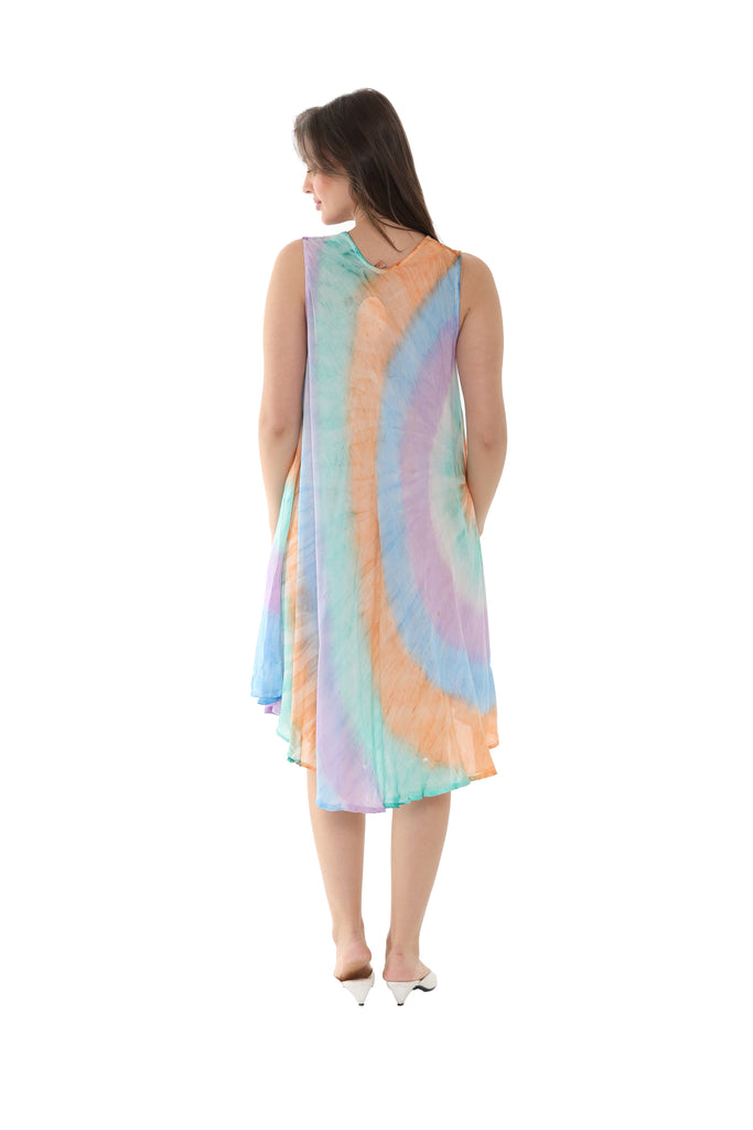 Enhance your wardrobe and lend a boho-chic vibe to your ensemble with this rainbow rays tie-dye shift dress boasting a breezy design.