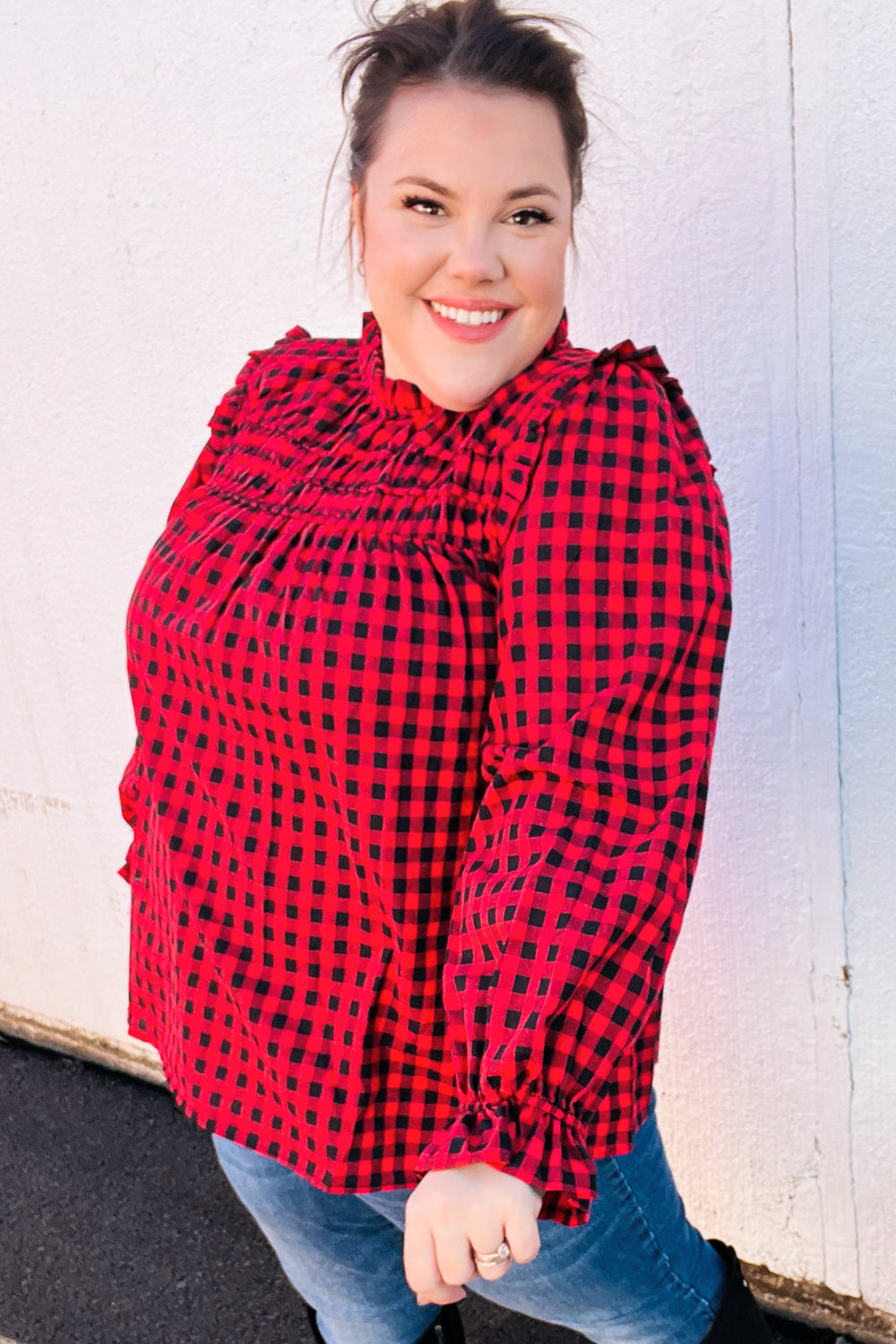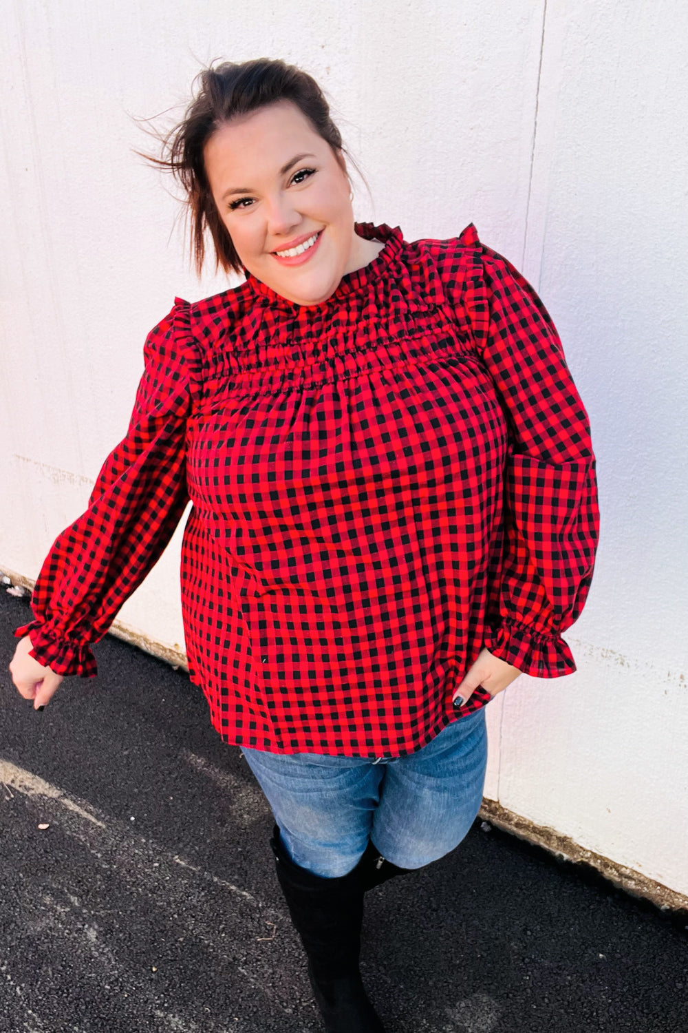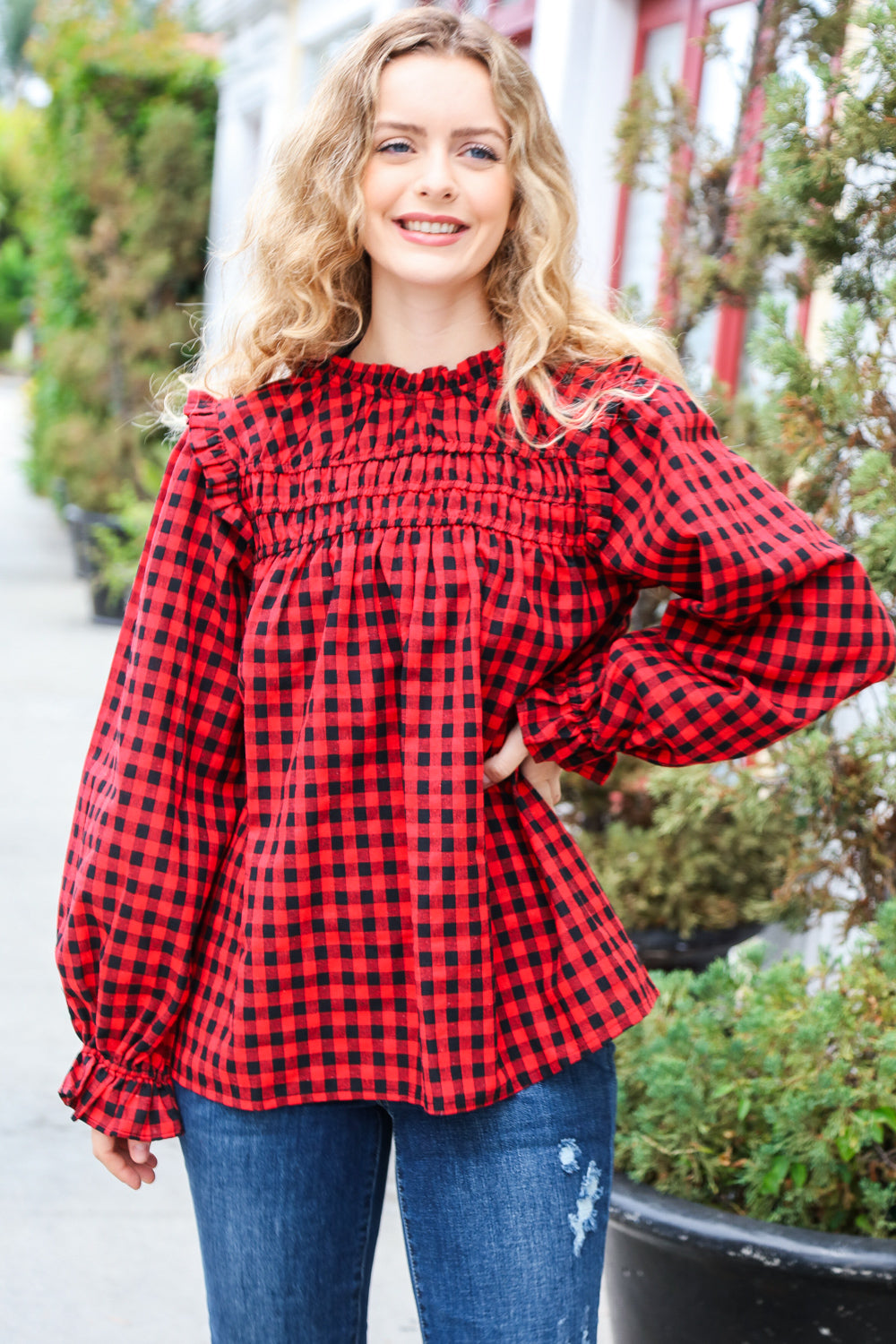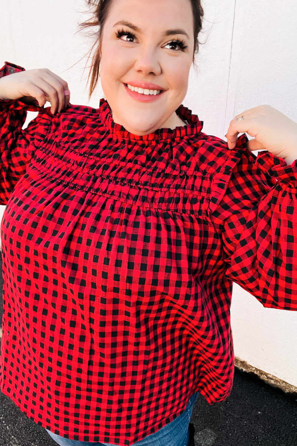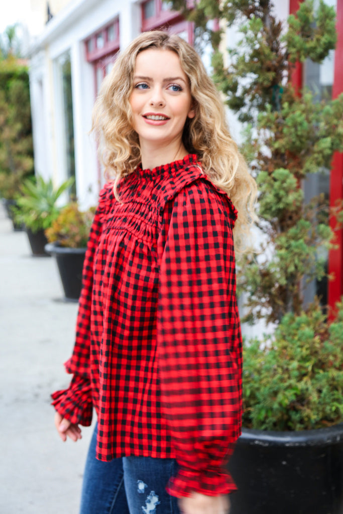 Don't Think Twice Gingham Shirred Mock Neck Frilled Top
