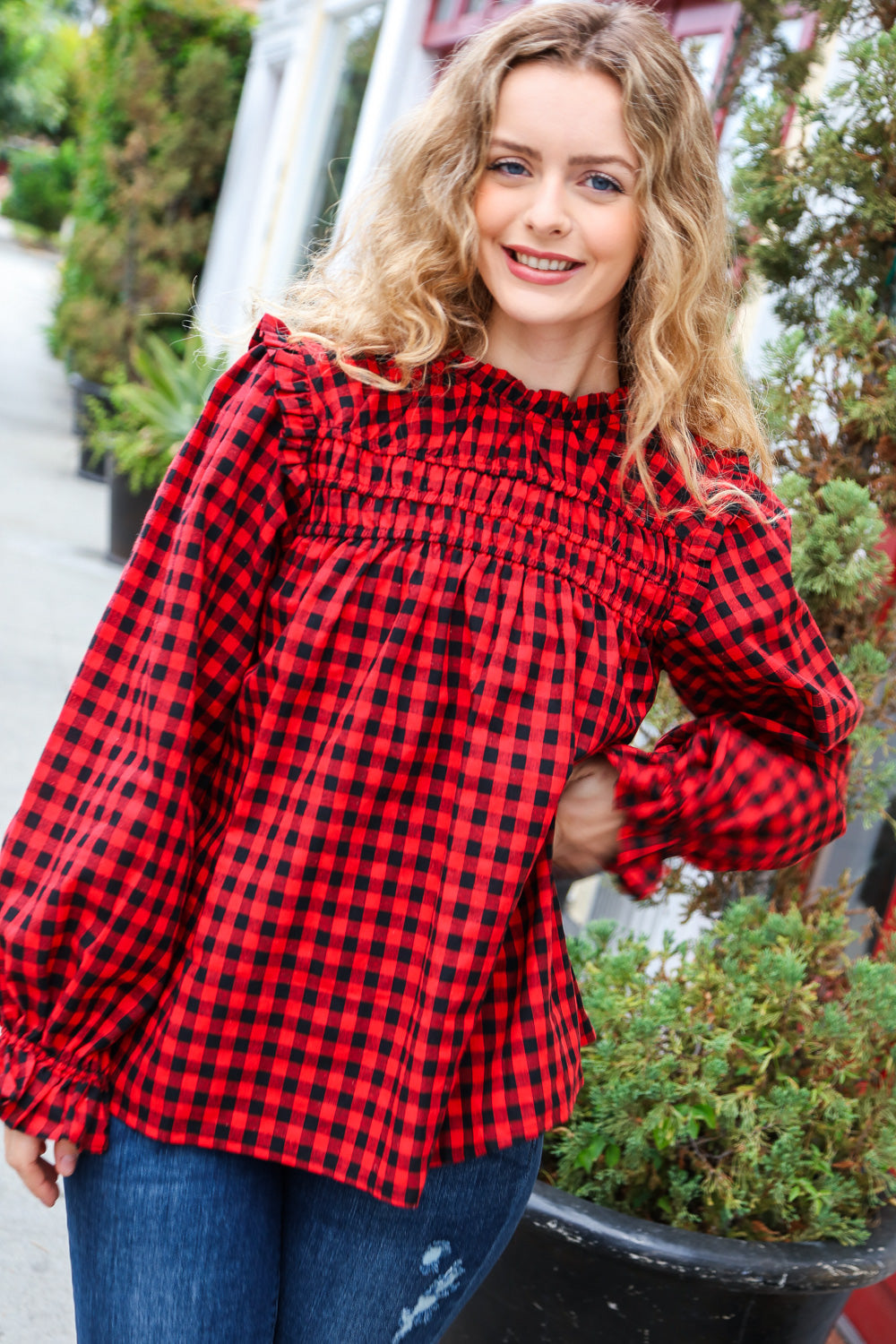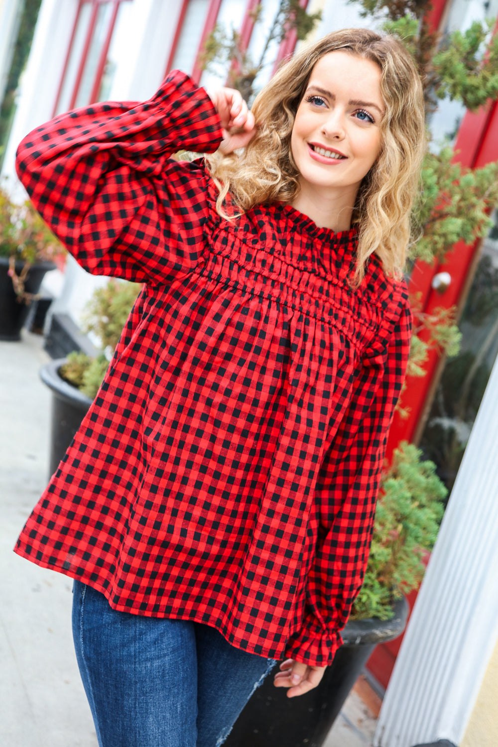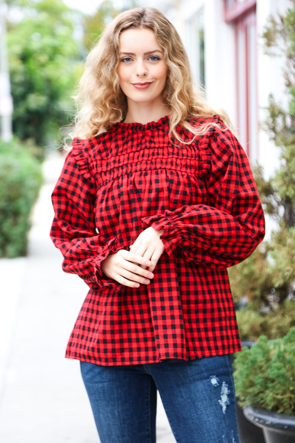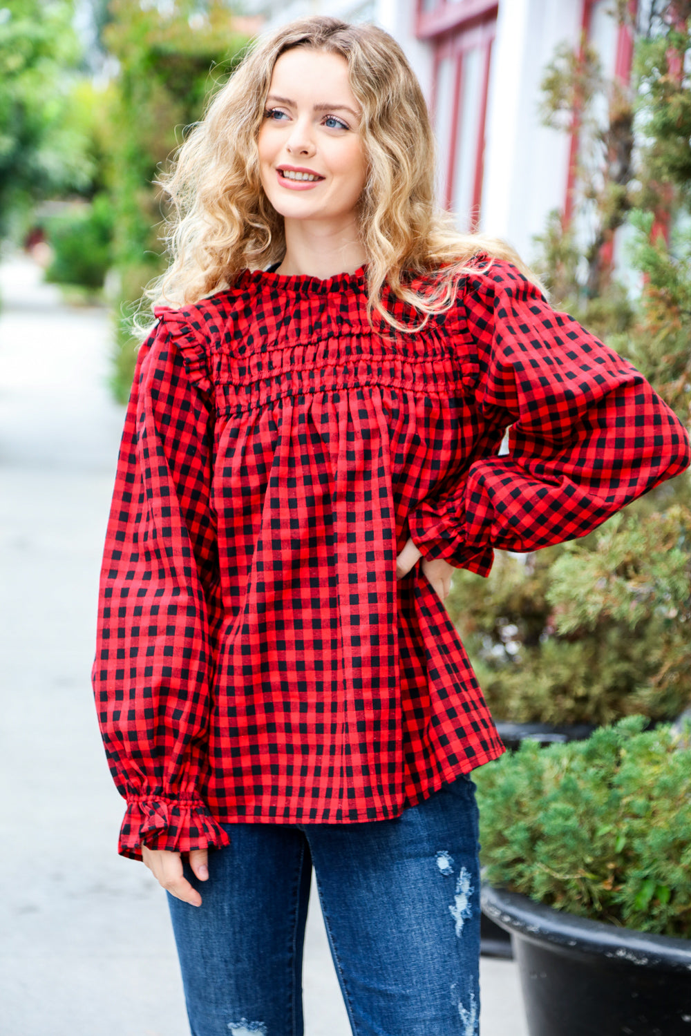 Don't Think Twice Gingham Shirred Mock Neck Frilled Top