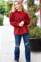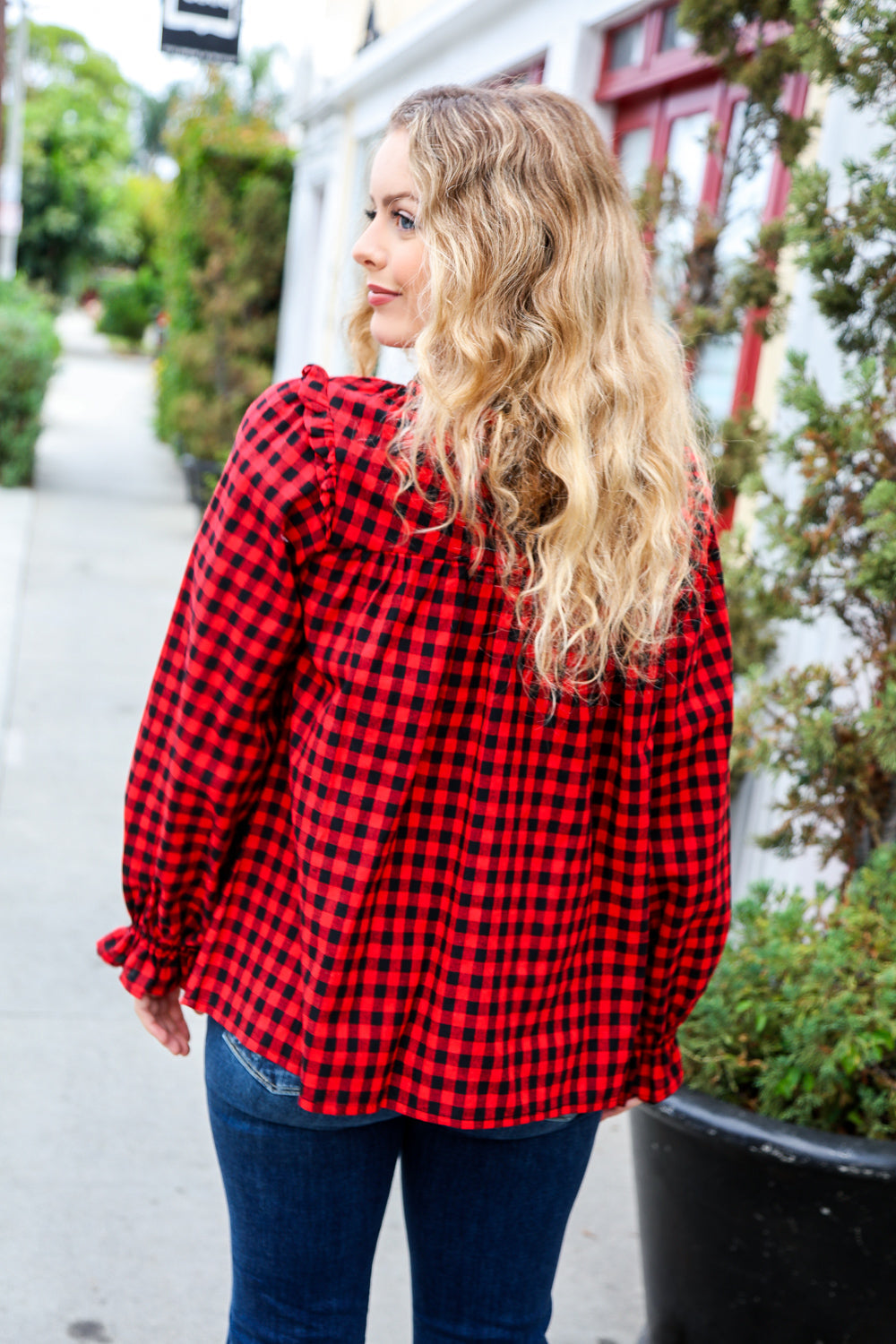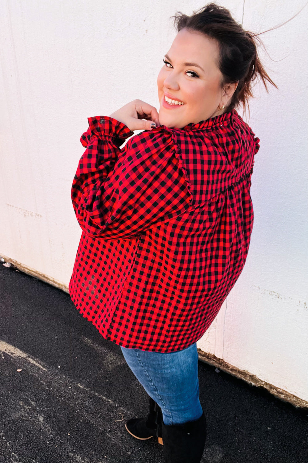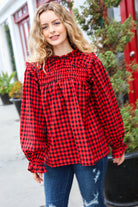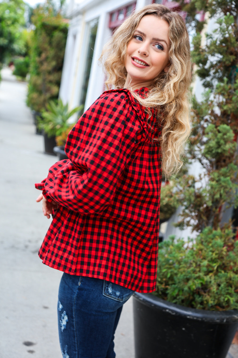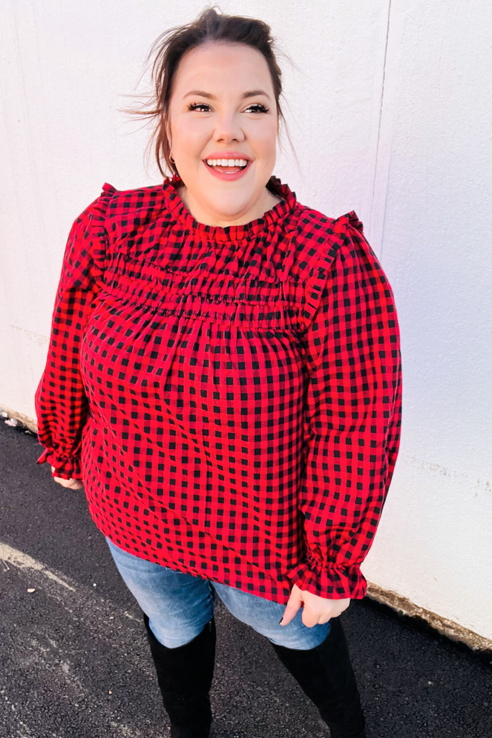 Don't Think Twice Gingham Shirred Mock Neck Frilled Top
