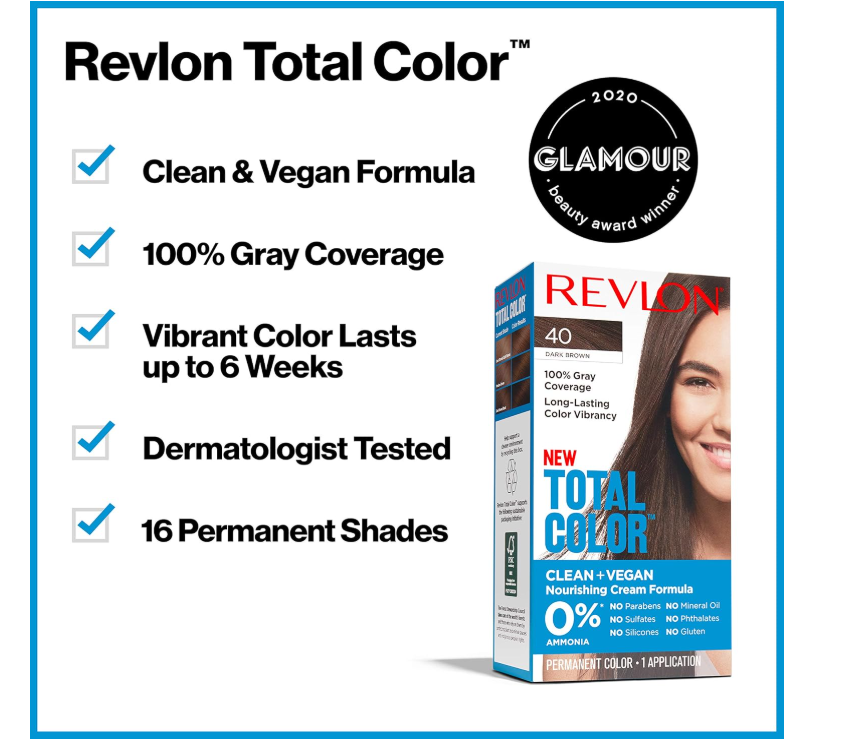 Revlon Permanent Hair Color, Permanent Hair Dye, Total Color with 100% Gray Coverage, Clean & Vegan, 40 Dark Brown, 3.5 Oz