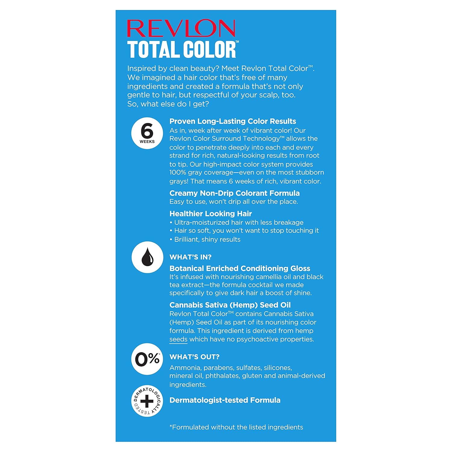 Meet Revlon Total Color. A hair color that’s free of many ingredients and a formula that’s not only gentle on hair but respectful of scalp, too. Revlon Color Surround Technology allows color to penetrate deeply into each and every strand for rich, natural-looking results from root to tip. This high-impact color system provides 100% gray coverage—even on the most stubborn grays! That means 6 weeks of rich, vibrant color and ultra-moisturized hair with less breakage. Healthier looking hair and brilliant, shiny results! Hair so soft, won’t want to stop touching it