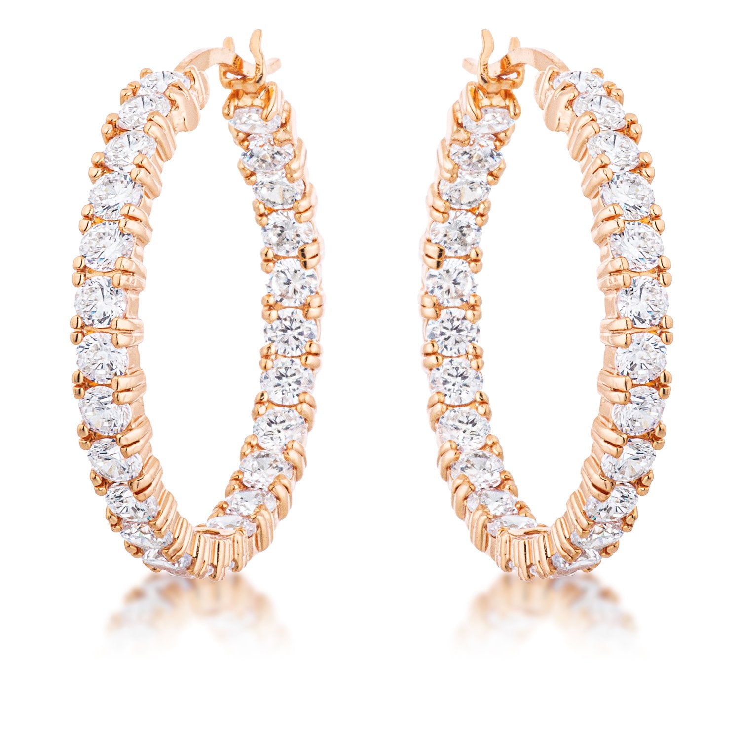 The possibilities are endless with these inside and outside channel set round cubic zirconia 18k rose gold plated eternity hoop earrings. They match almost anything subtle enough to wear everyday but beautiful enough to make you shine.
