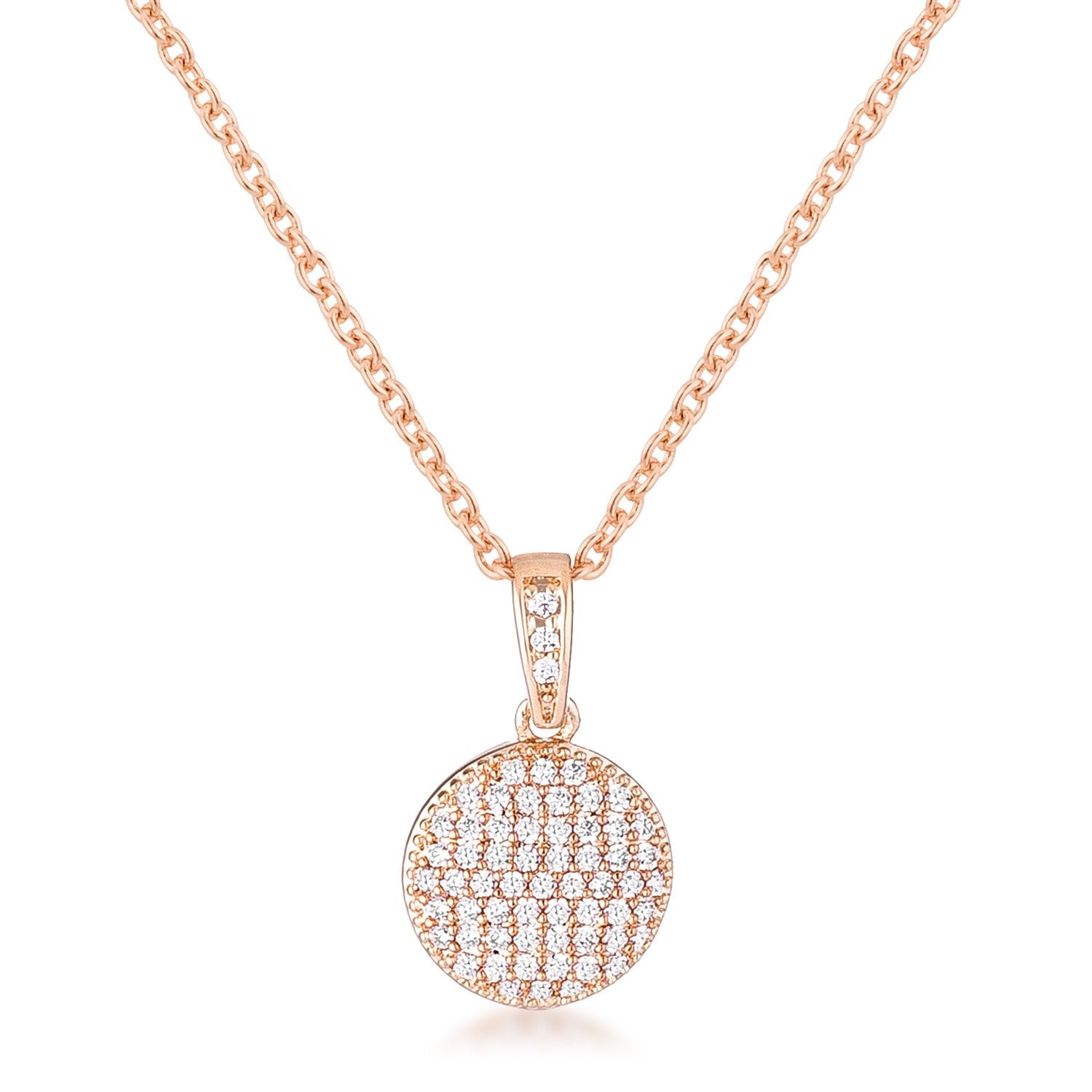 This necklace features a pave disc pendant that is beautifully set with dazzling clear cubic zirconia. The rest of the necklace is crafted in a brilliant rose gold finish.Classic and versatile this necklace will flatter any outfit with its subtle sparkle.