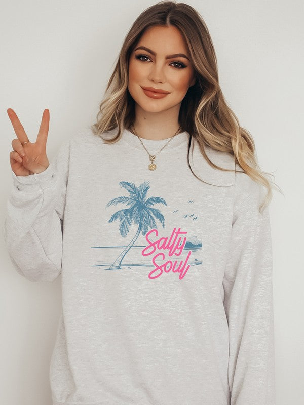Rock the beach look with our Salty Soul Sweatshirt. Perfect for those cool spring nights & chilly summer days in your favorite beach town.