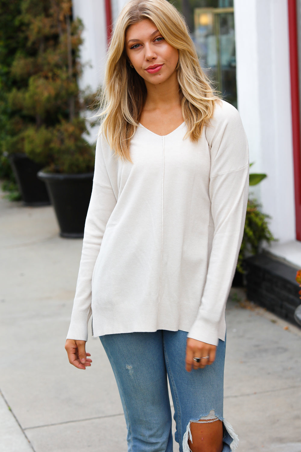 Hello Beautiful Sand Front Seam V Neck Sweater