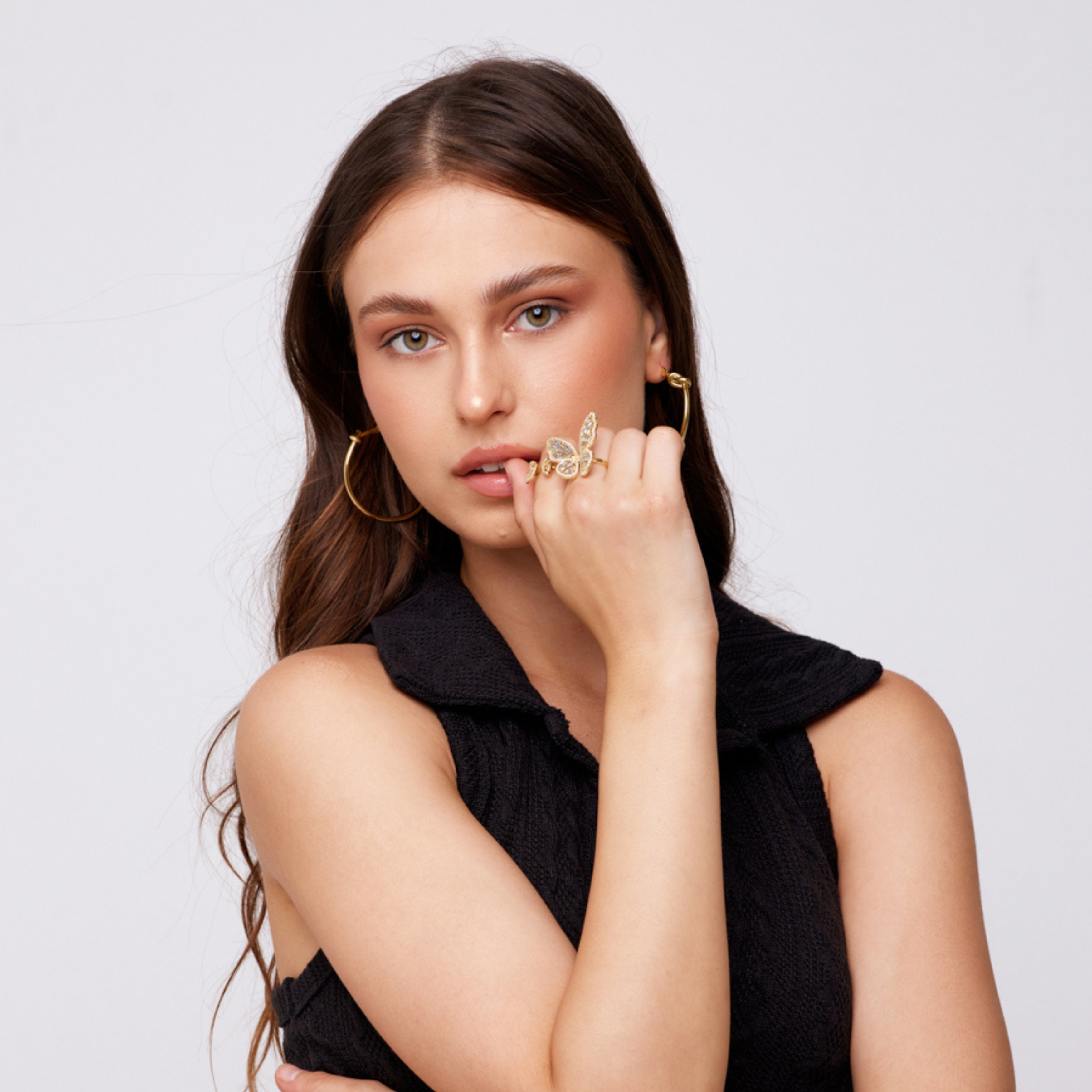 The SASHA 2 Ring features a 1.18" by 1.18" face and adjusts to fit sizes 5 through 9, offering versatile wear. Crafted from 18K gold-plated copper, it resists tarnishing and is waterproof for lasting shine. To keep your ring looking its best, avoid exposure to soaps, perfumes, lotions, and cleaning products, and remove it before applying body products. Clean gently with a lint-free microfiber cloth to maintain its elegant finish. This ring combines durability with timeless style, perfect for everyday wear.