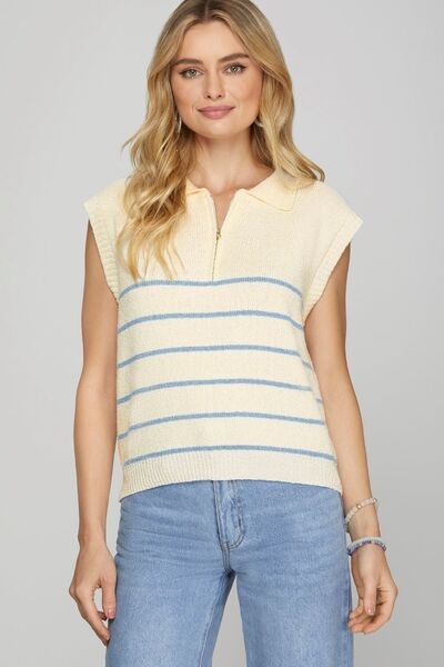 She + Sky Full Size Ribbed Hem Striped Half Zip Sweater Vest Plus Size