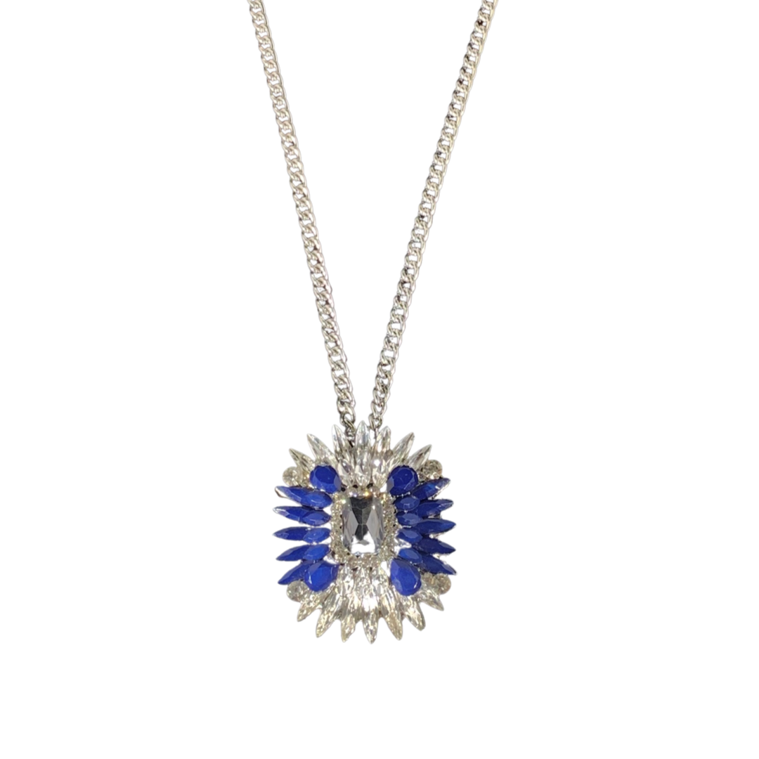 Silver Double Chain Necklace With Crystal and Montana Blue Large Statement Pendant