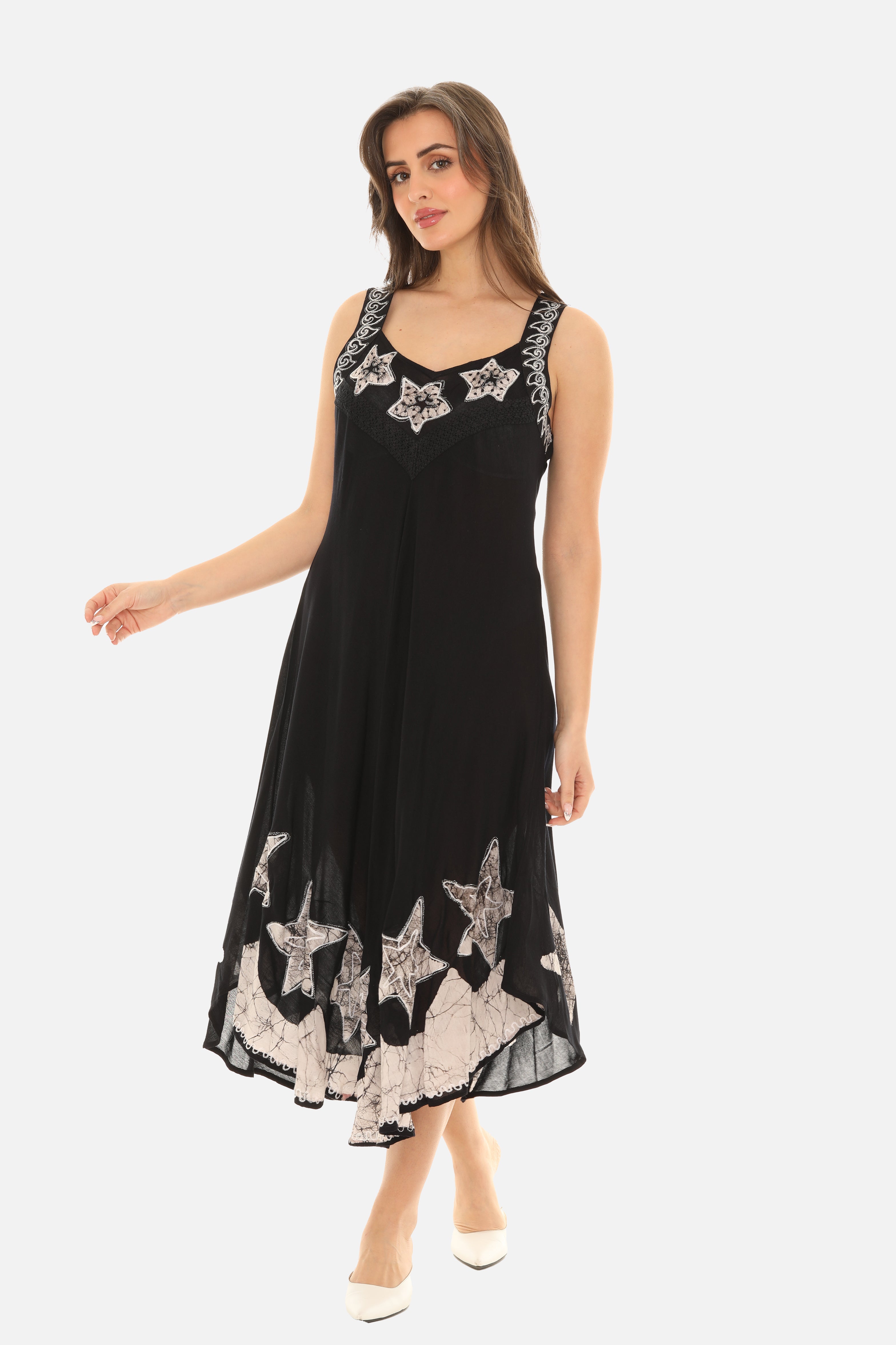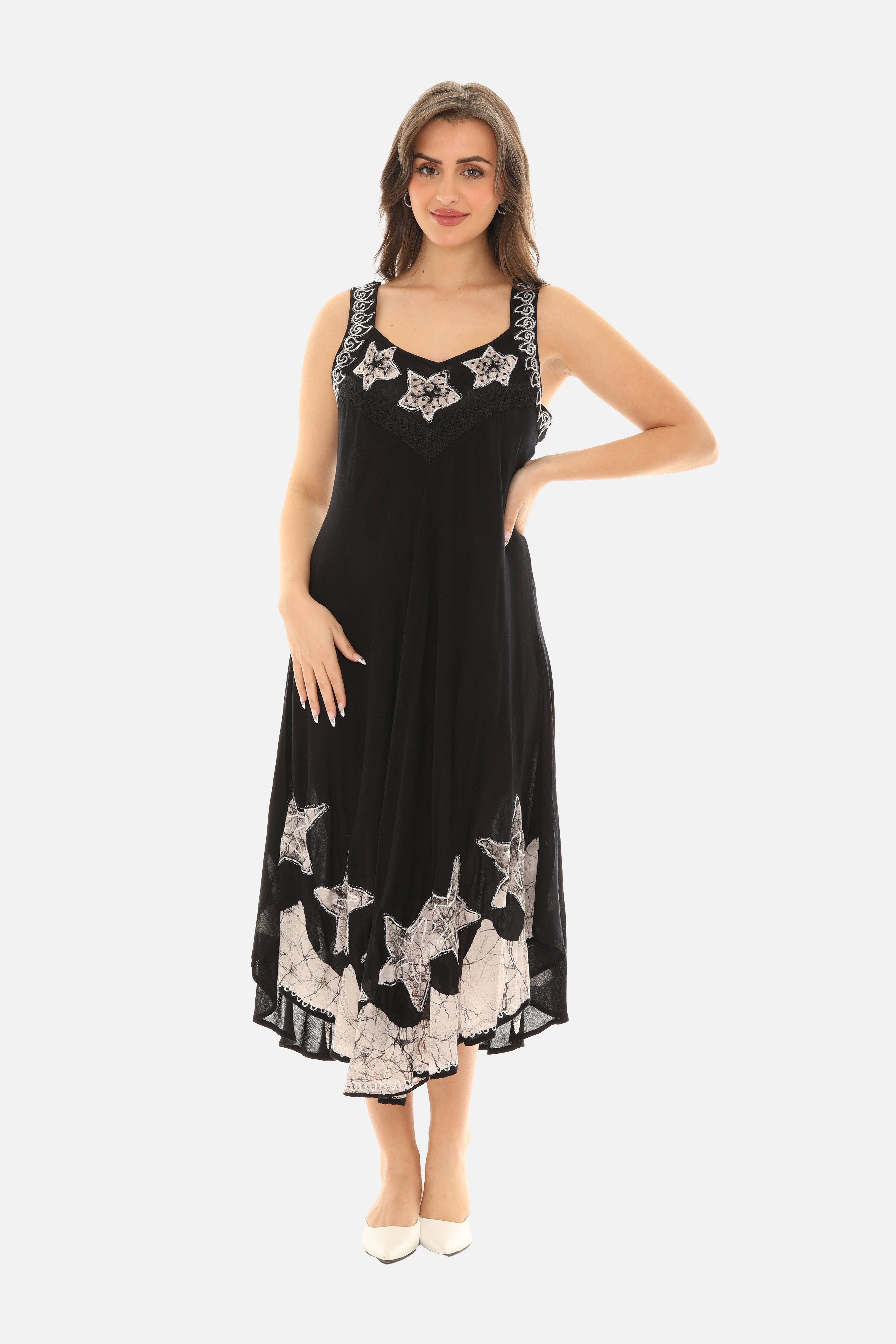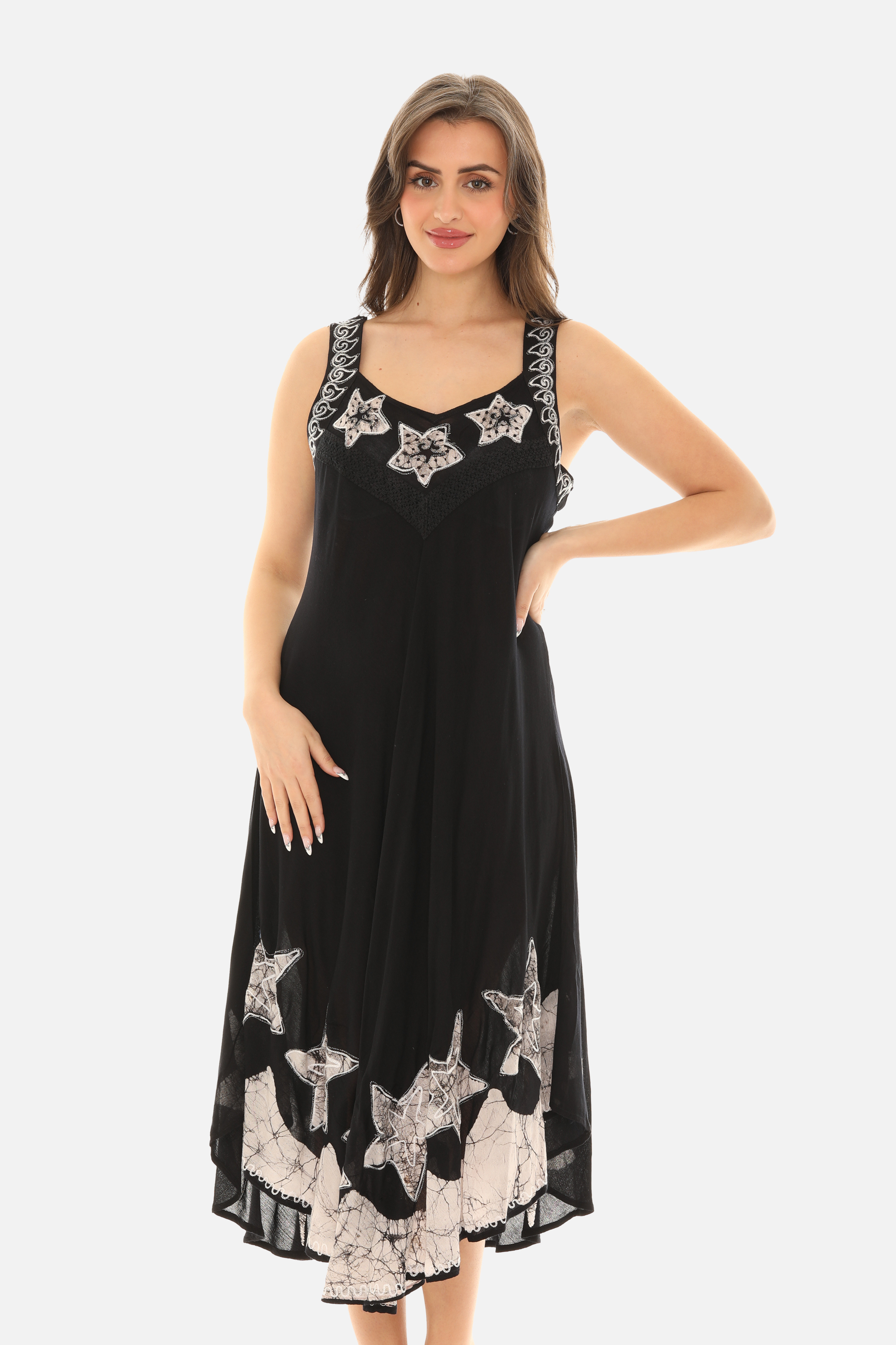 Introducing the stunning Sleeveless Midi Dress with Star Motif on the neckline and hem. This exquisite dress combines effortless elegance with a touch of celestial charm, making it the perfect addition to your wardrobe for any special occasion.