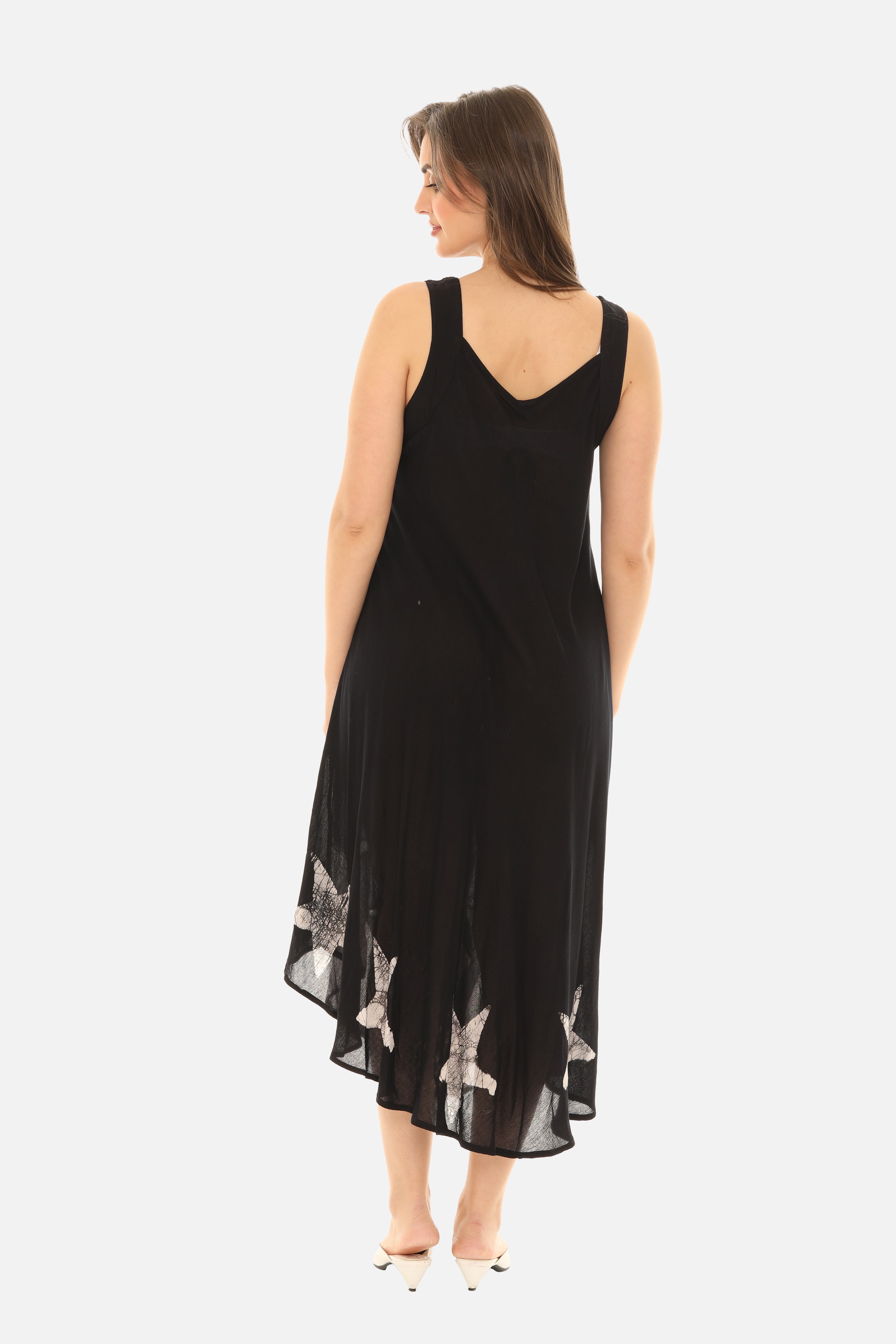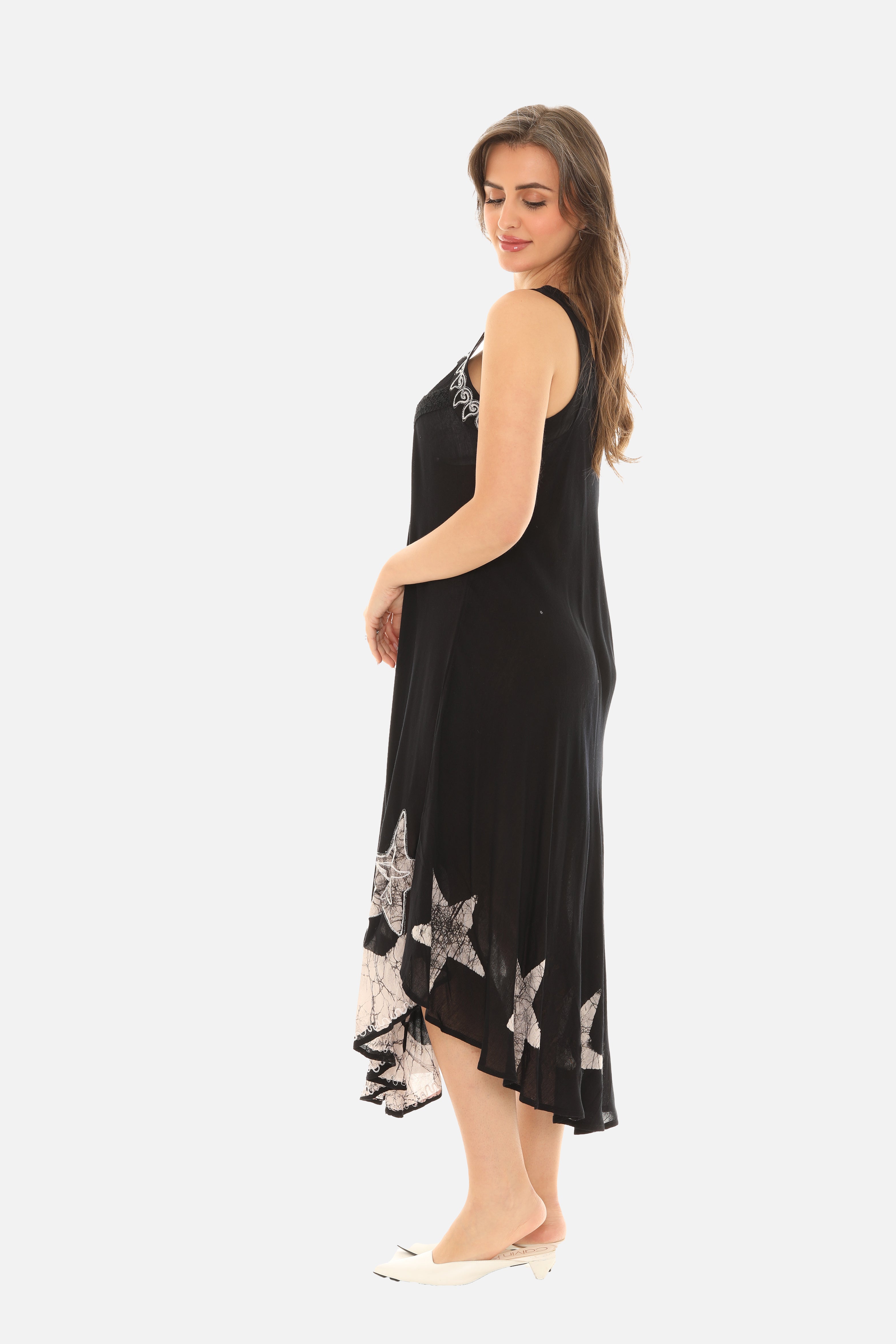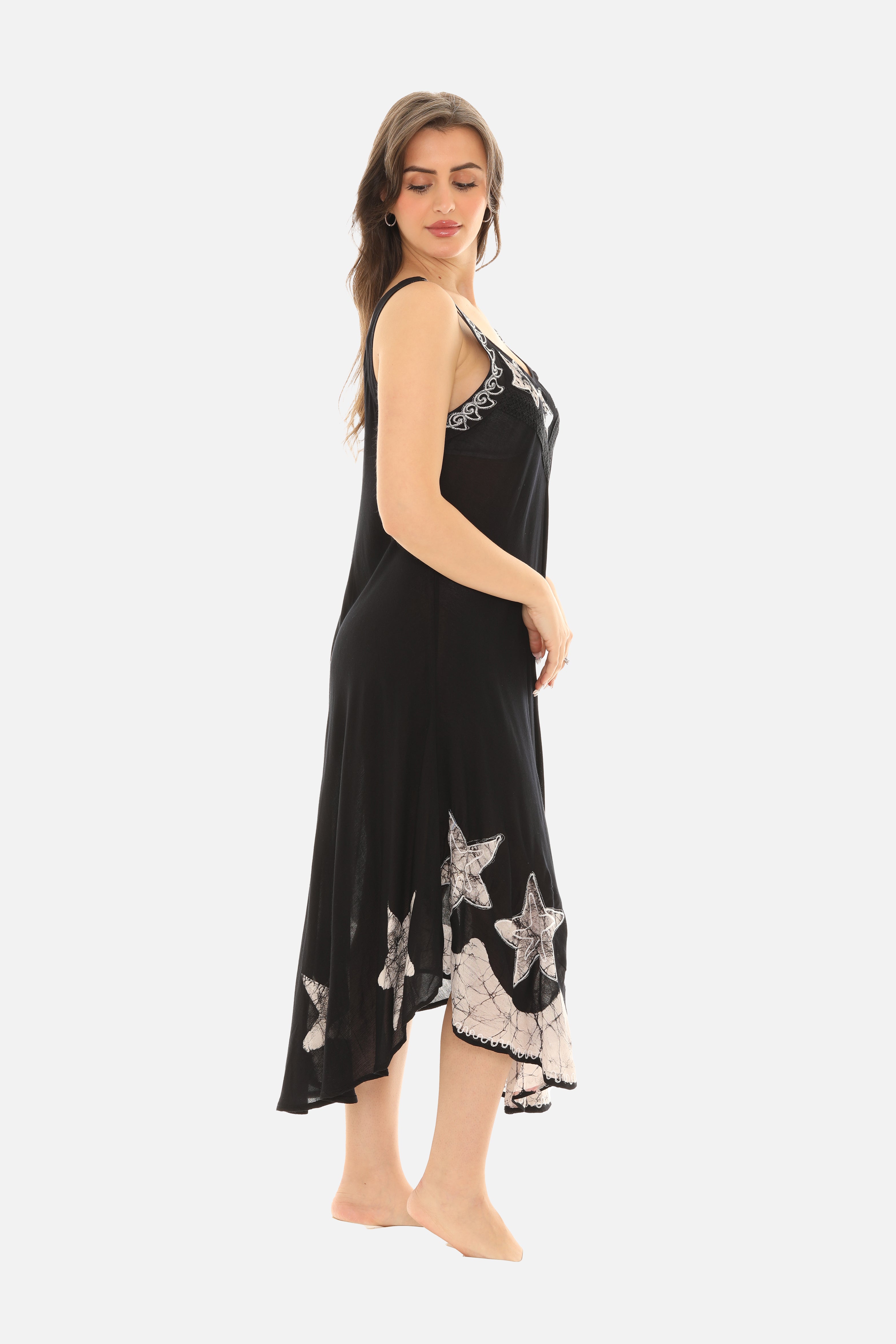 Introducing the stunning Sleeveless Midi Dress with Star Motif on the neckline and hem. This exquisite dress combines effortless elegance with a touch of celestial charm, making it the perfect addition to your wardrobe for any special occasion.