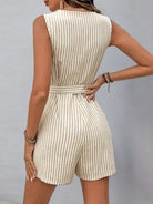 Features: Striped pattern, V-neckline, sleeveless cut, tie-waist belt, and button-front details