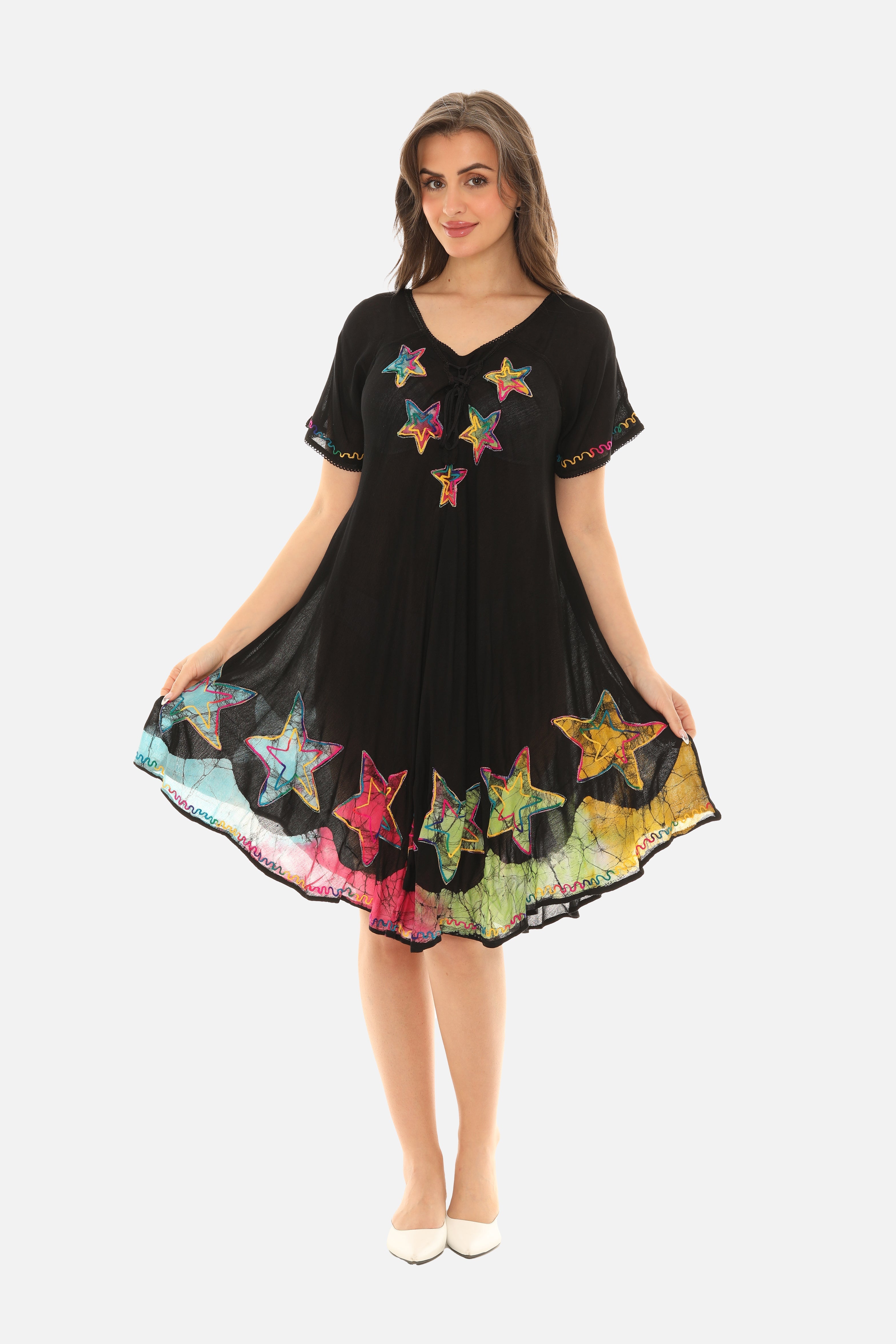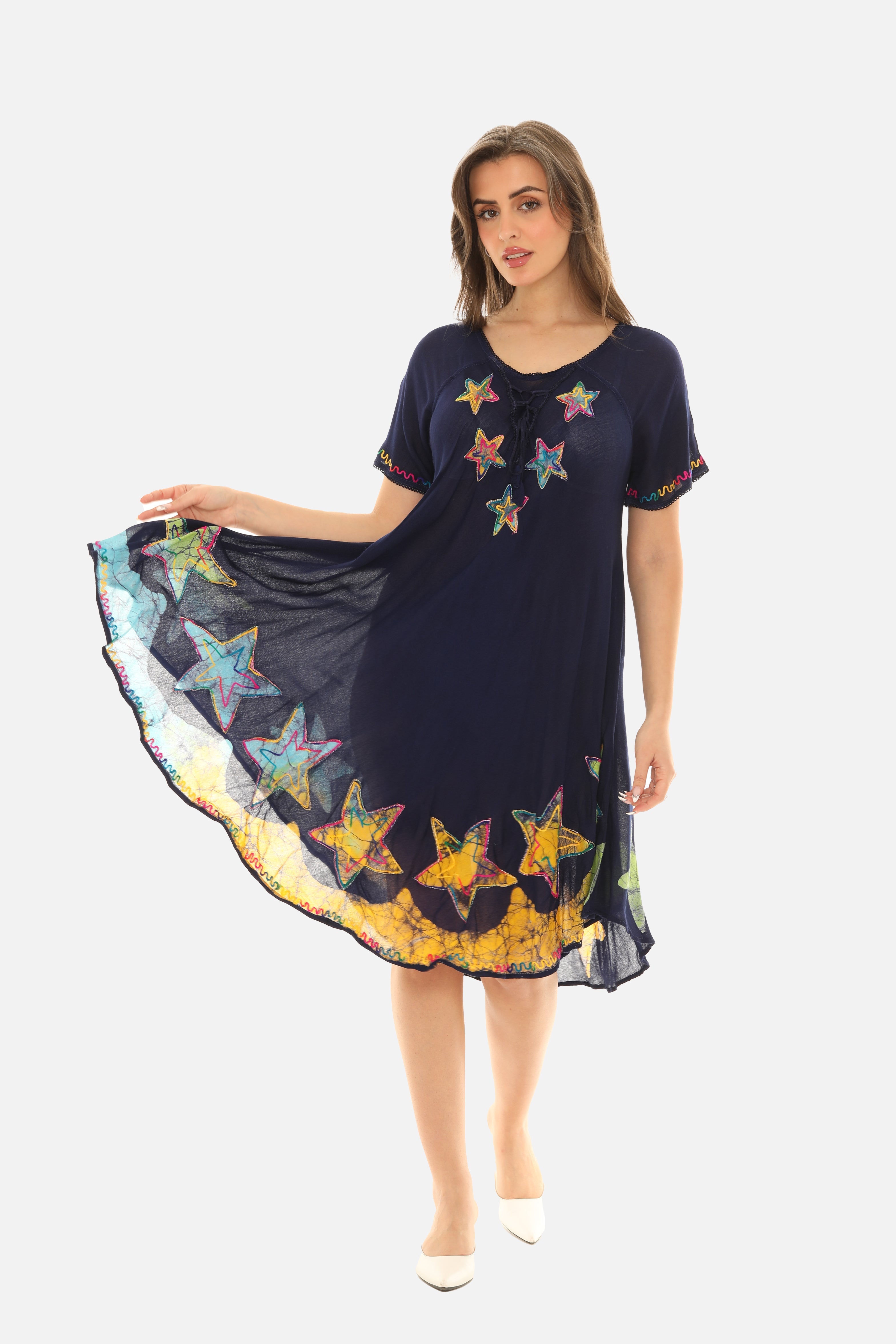 The Starfish Short-Sleeves Midi Dress is a stylish and comfortable garment perfect for any casual occasion. With its cute starfish print, short sleeves, and mid-length hemline, this dress is both playful and versatile. Made from high-quality rayon fabric, it is soft to the touch and easy to wear. Ideal for dressing up or down, this dress is a must-have addition to any fashion-conscious individual's wardrobe.