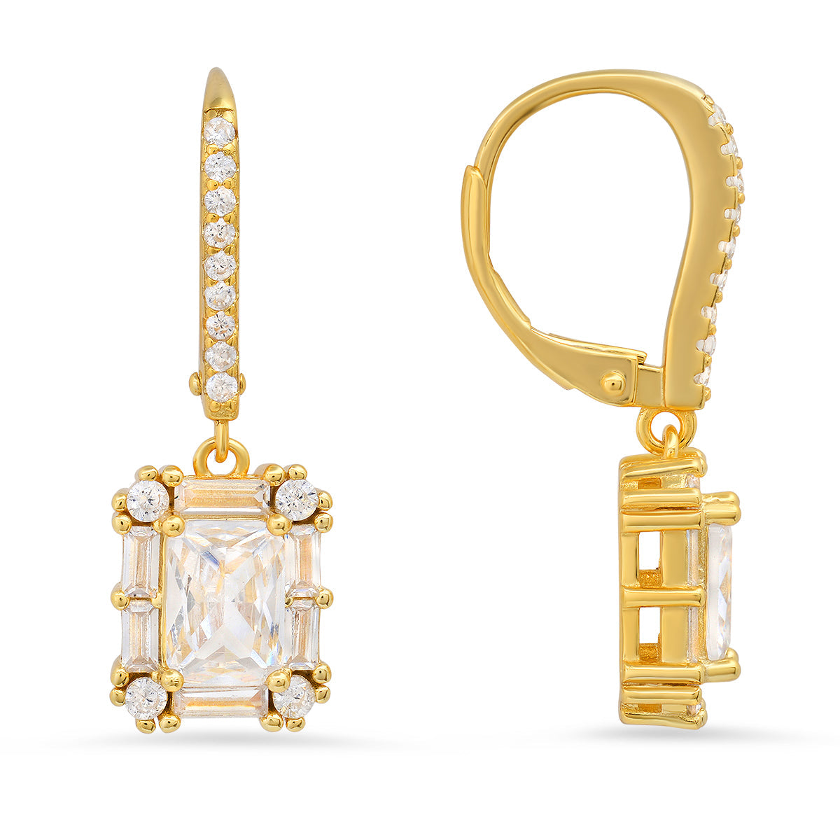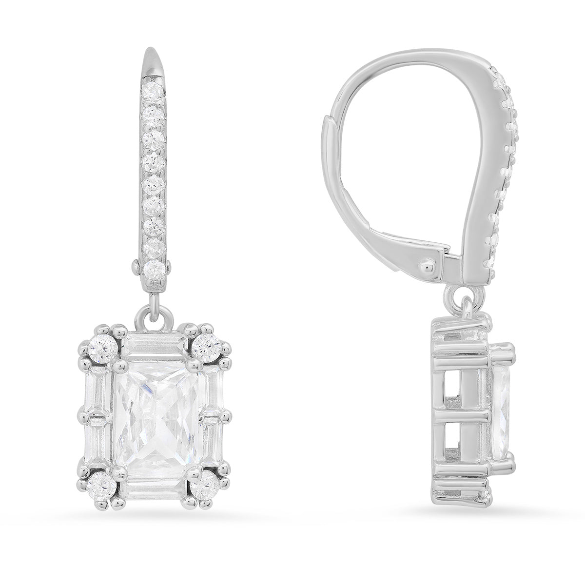 Sterling Silver Emerald-cut Diamond Halo Dangling Earrings