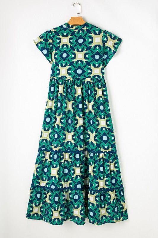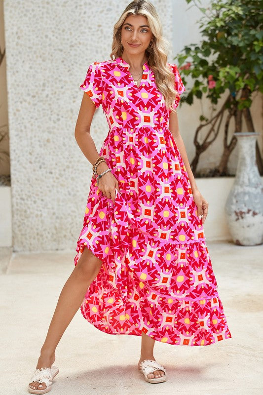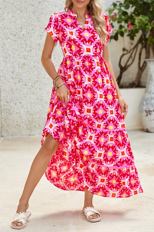 The maxi dress is a stunning and vibrant dress featuring an abstract print that adds a pop of color and visual interest to your outfit.