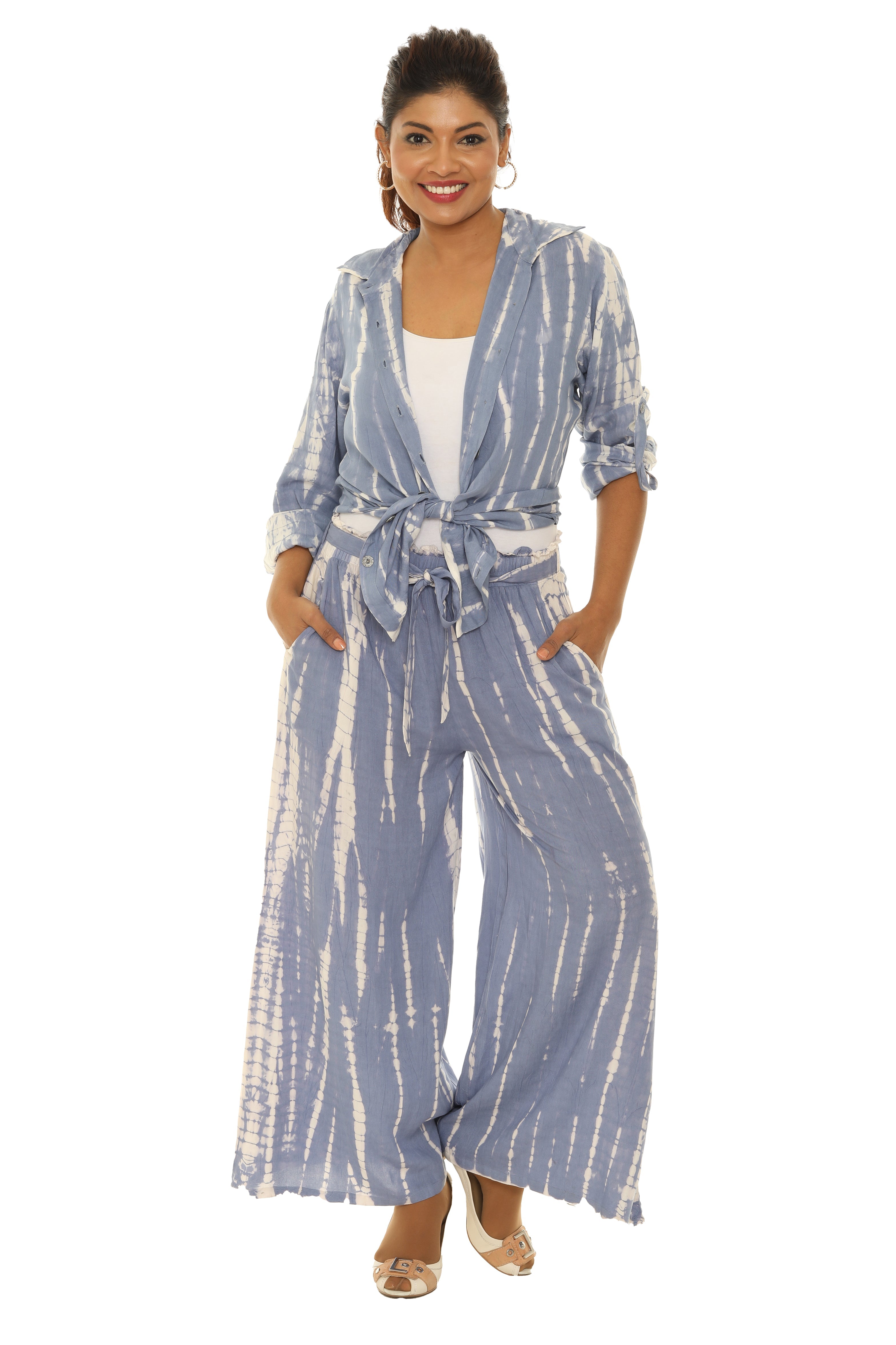 Get ready for summer fun with this comfy long sleeve tie-dye shirt and ditch your stiff denim for these accompanying tie-dye lightweight palazzo pants designed with side pockets and a belted elastic waistline for a comfortably casual style.