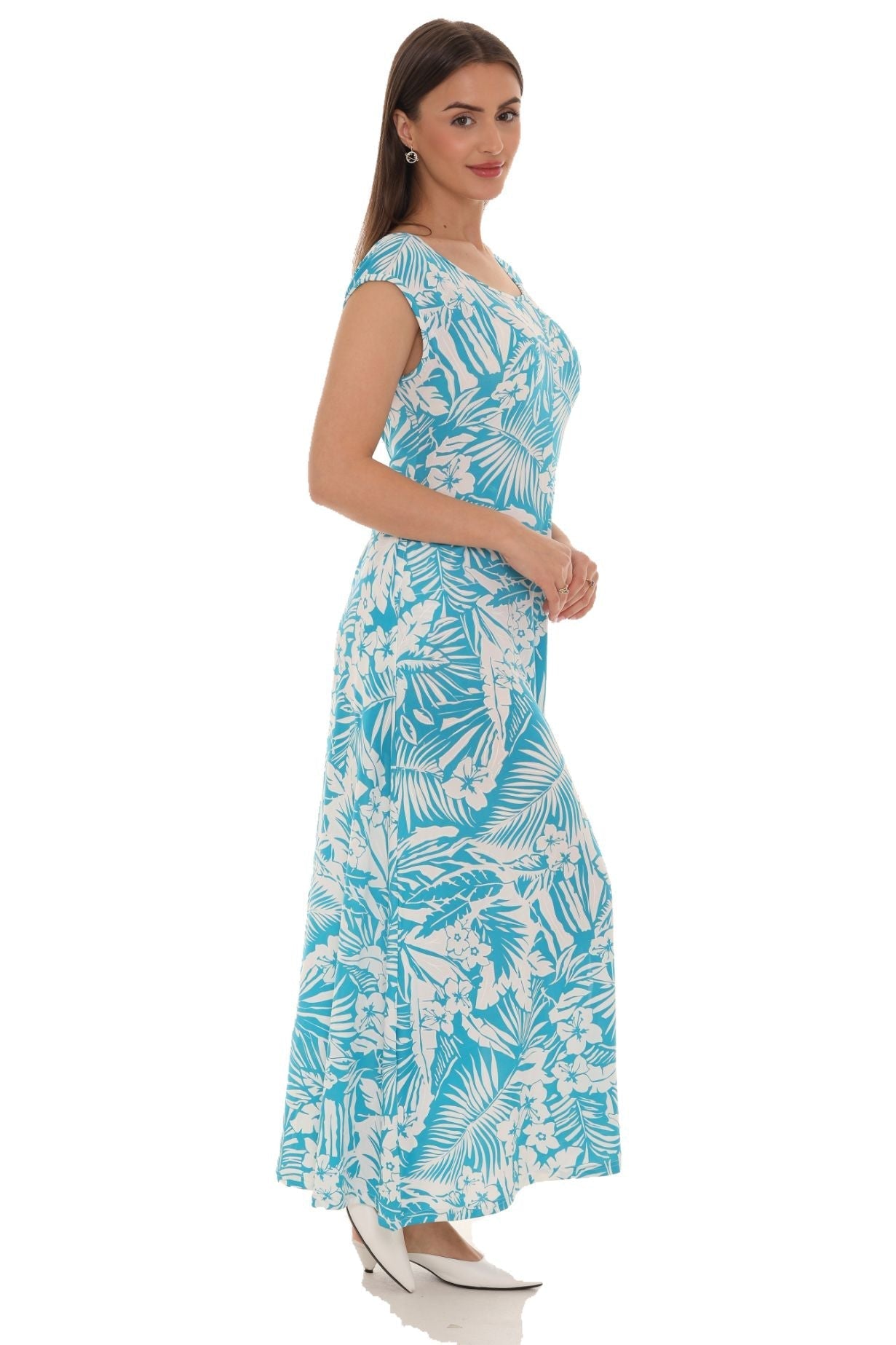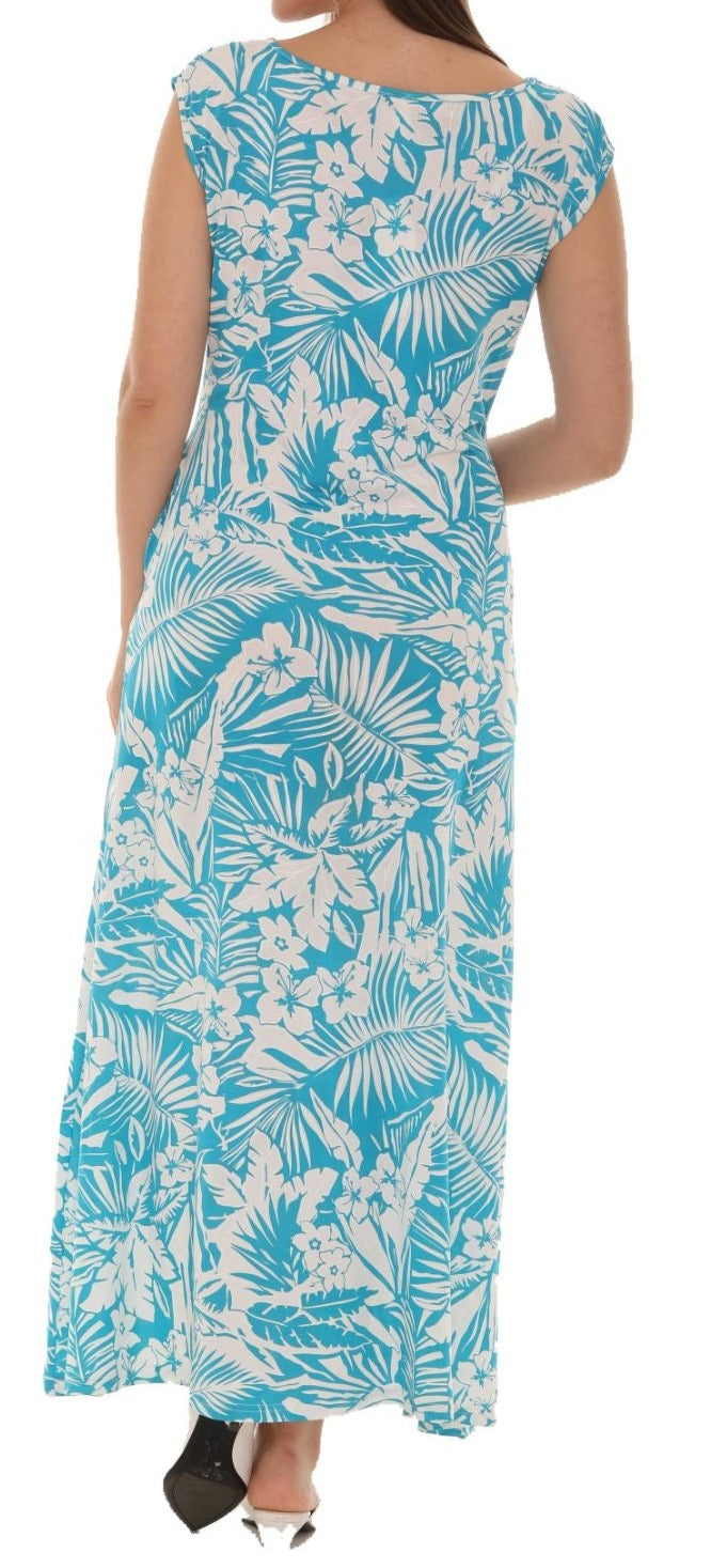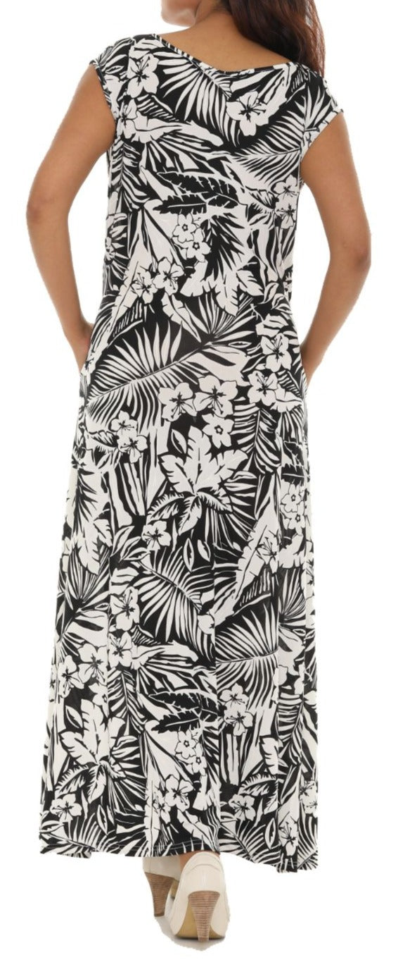 Incorporate functionality and comfort into your sunny-day attire with this tropical leaf print maxi dress designed with a bold print and handy side pockets. From tropical print to side pockets to caps sleeves to front slit our long dresses collection has covered you.
