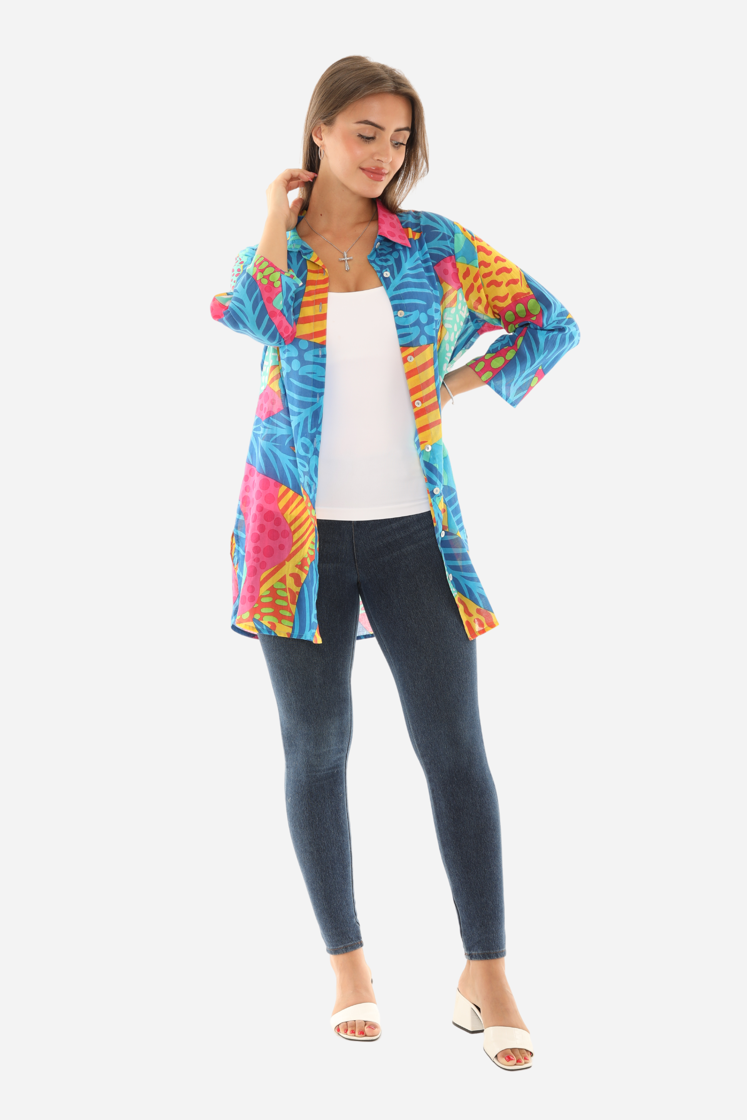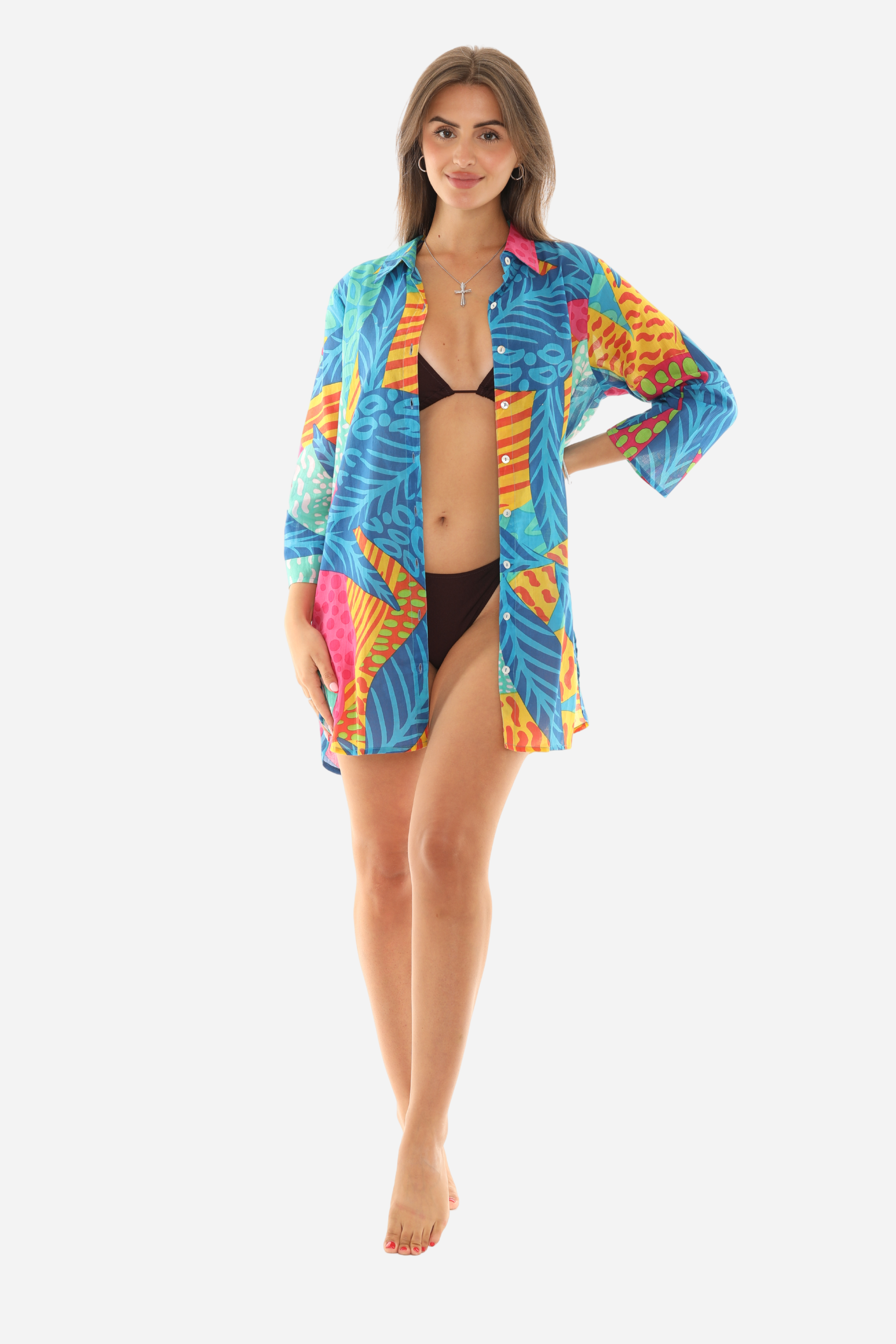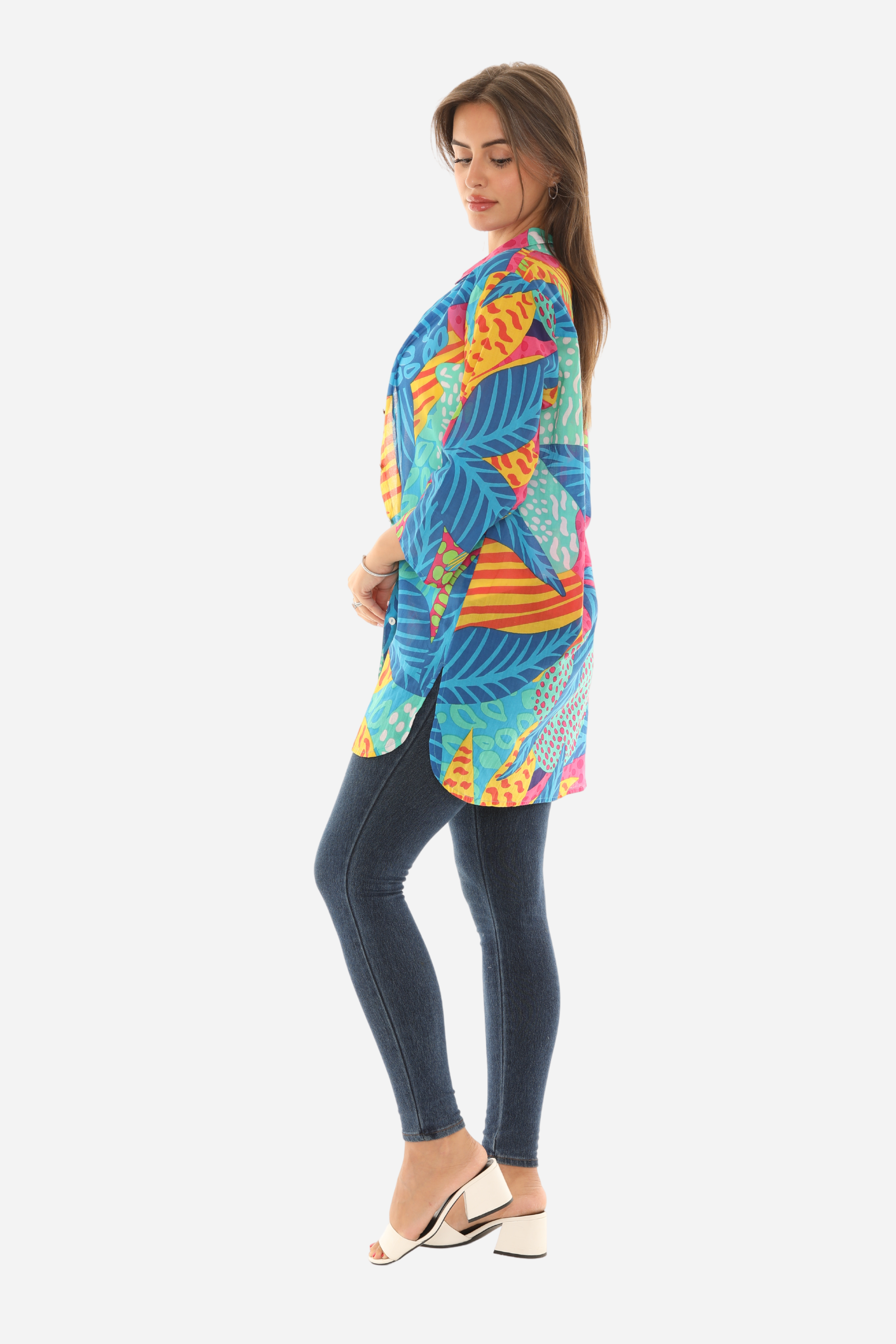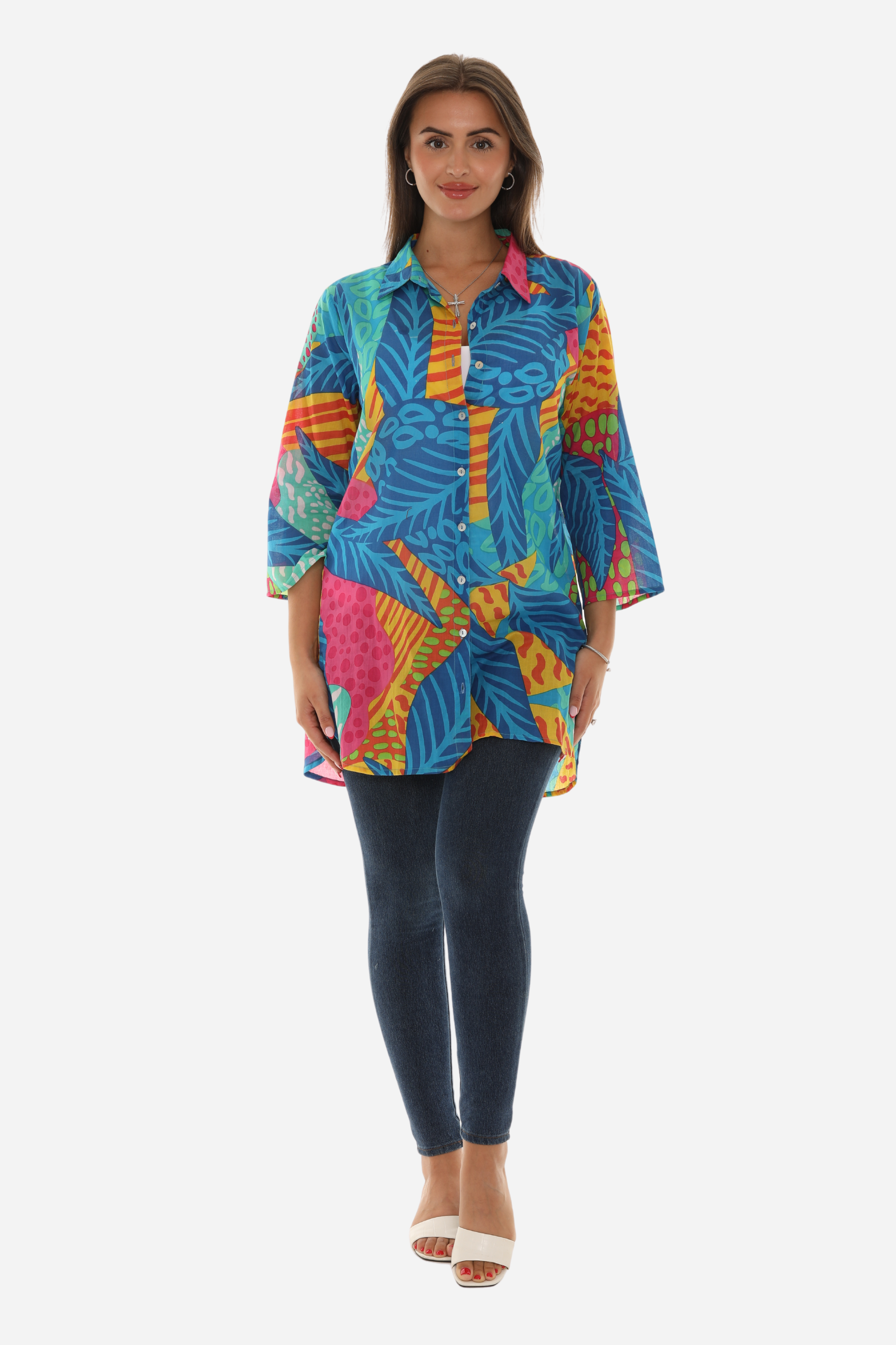 A summer classic, unbuttoned look and roll up the sleeves. You'll feel like you're on vacation no matter where you are. Tropical Print. Collared Neck. Functional Buttons all the way down. Long Sleeve with Button on Cuff.