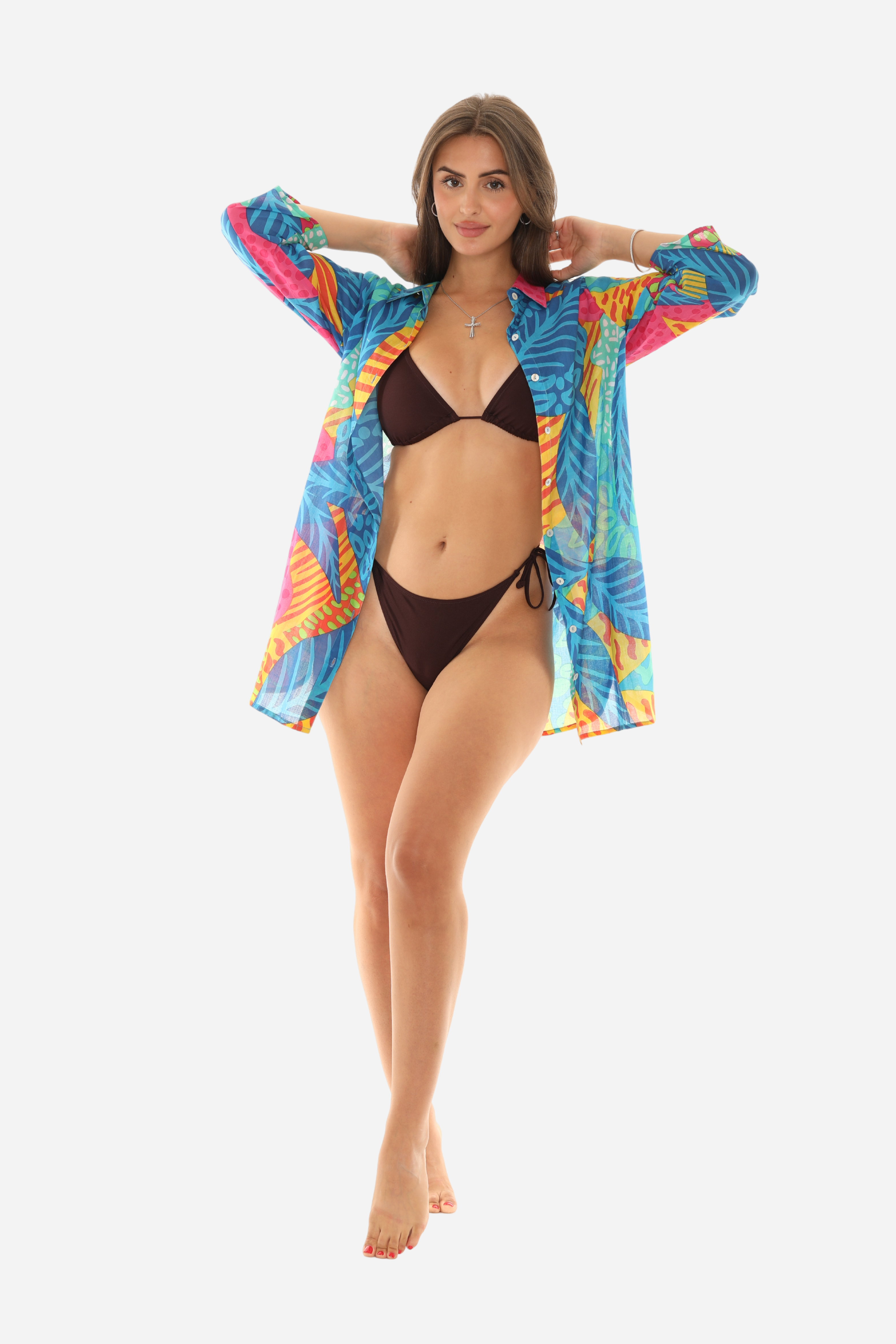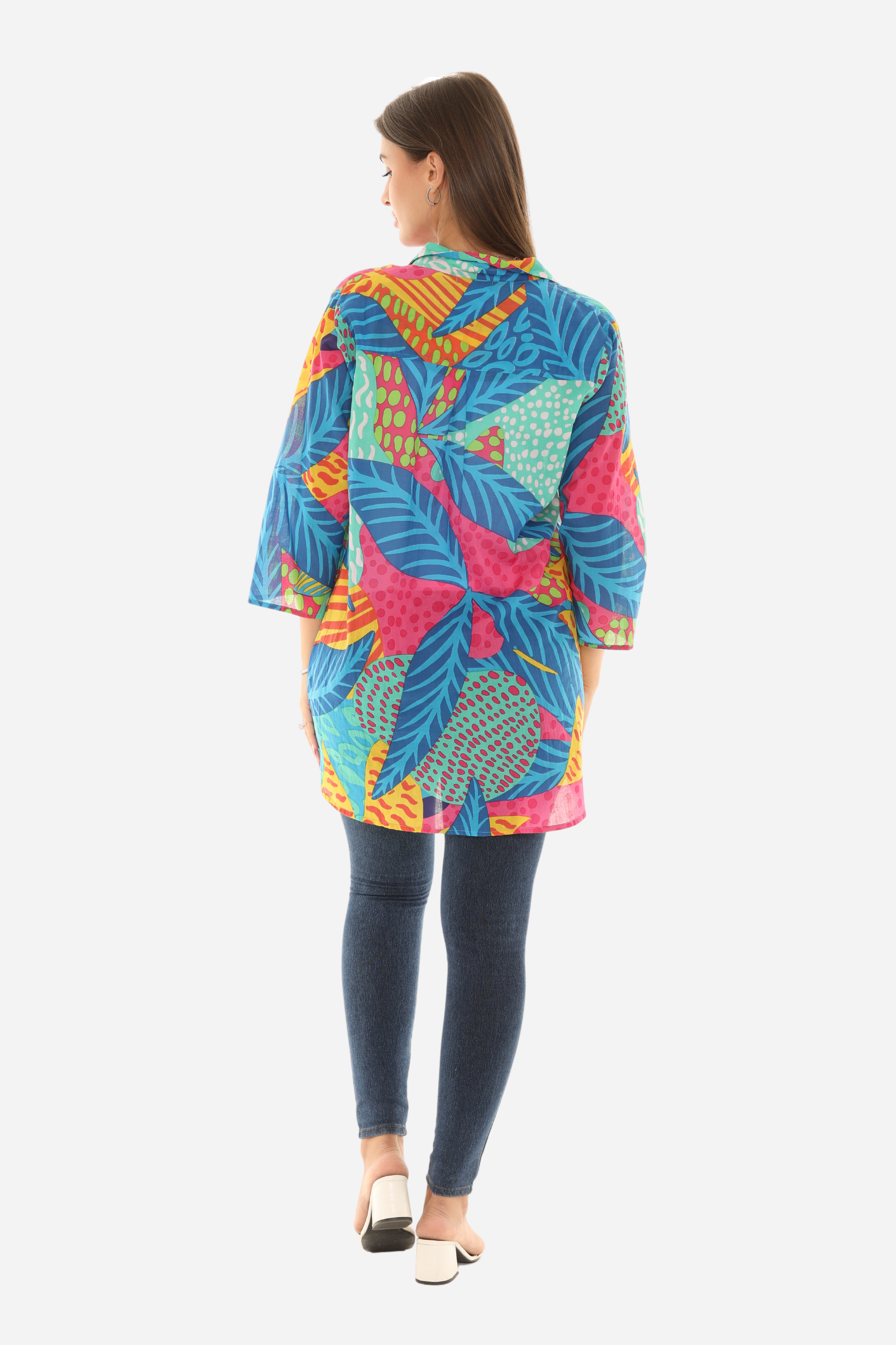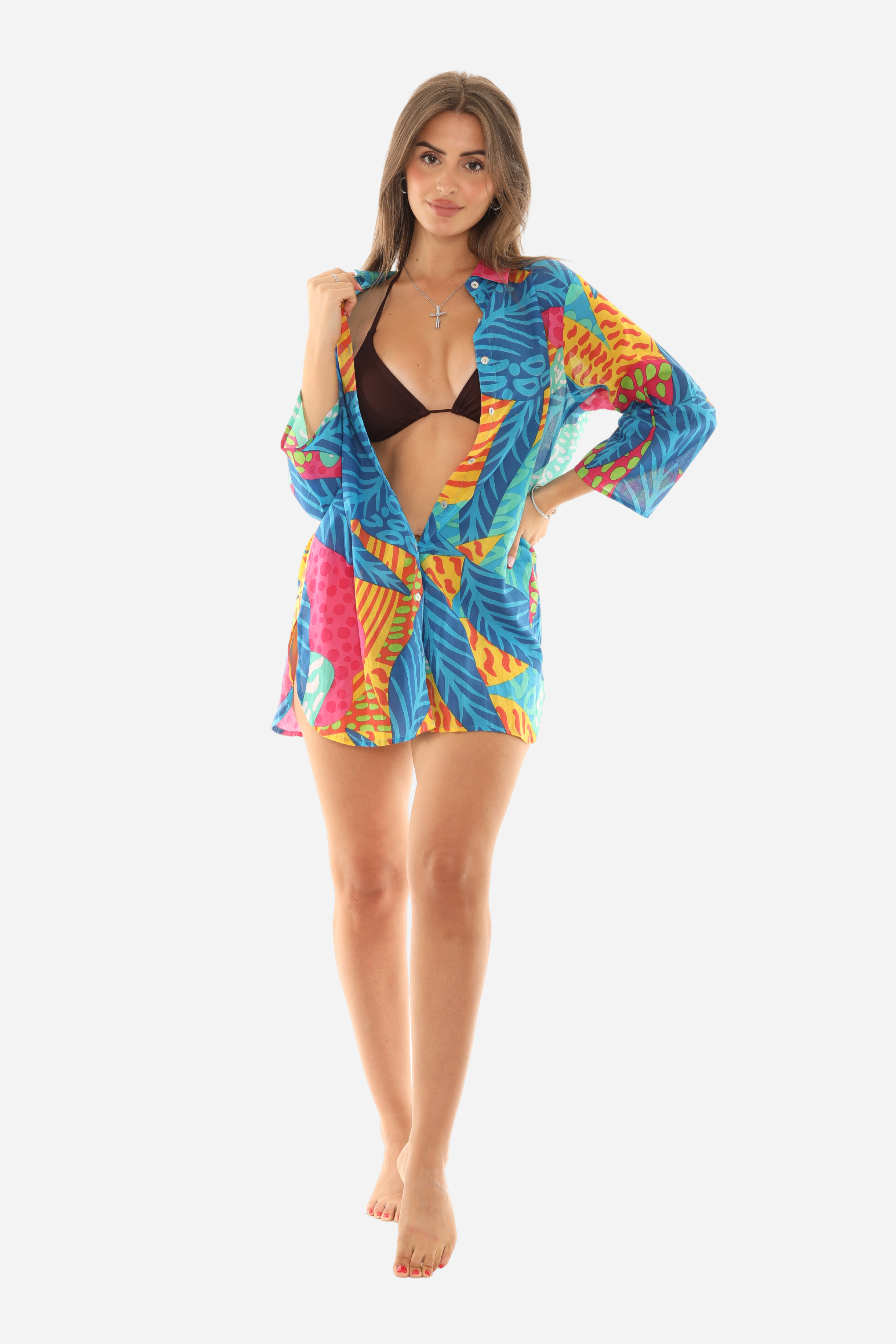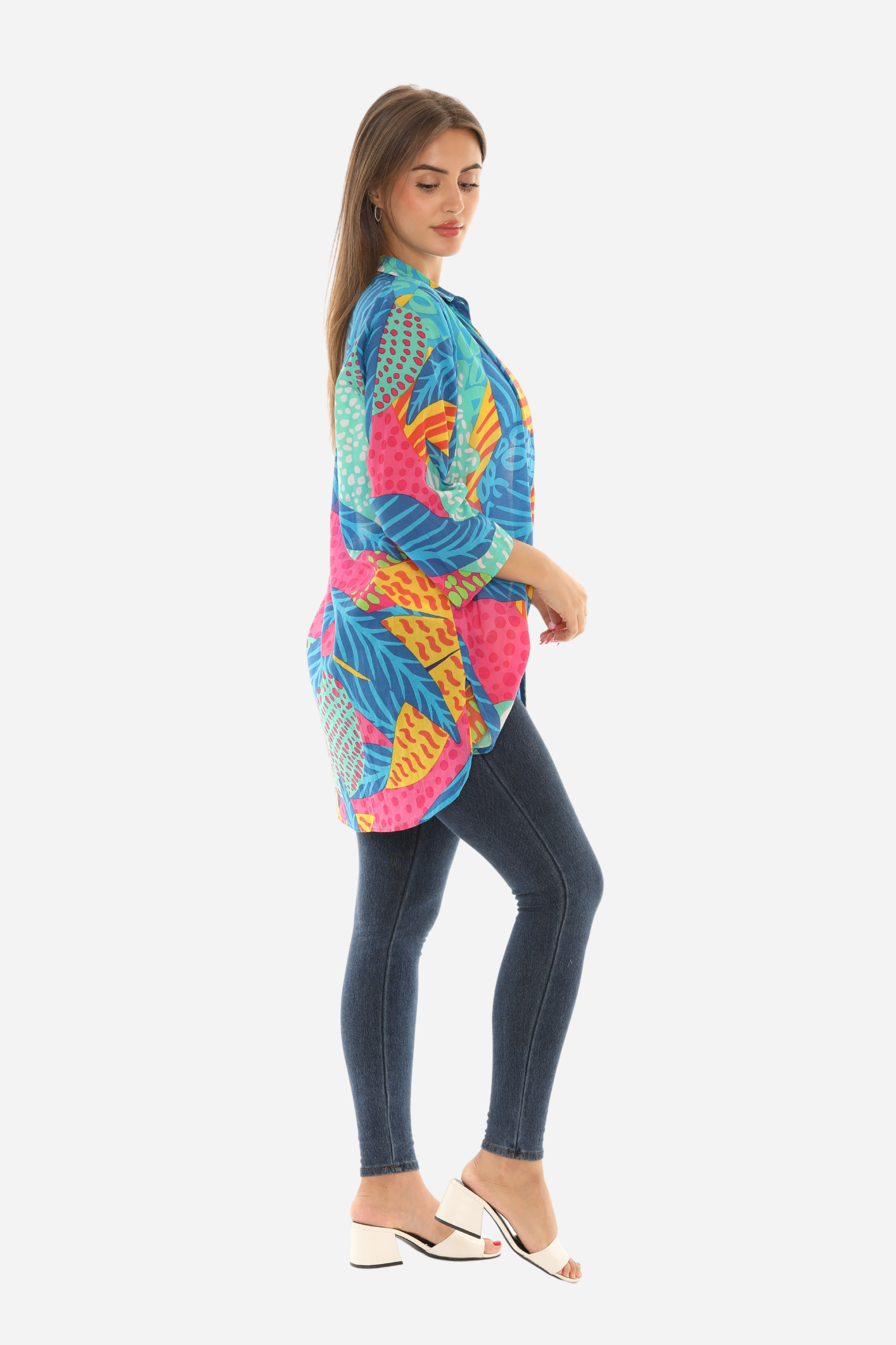 A summer classic, unbuttoned look and roll up the sleeves. You'll feel like you're on vacation no matter where you are. Tropical Print. Collared Neck. Functional Buttons all the way down. Long Sleeve with Button on Cuff.