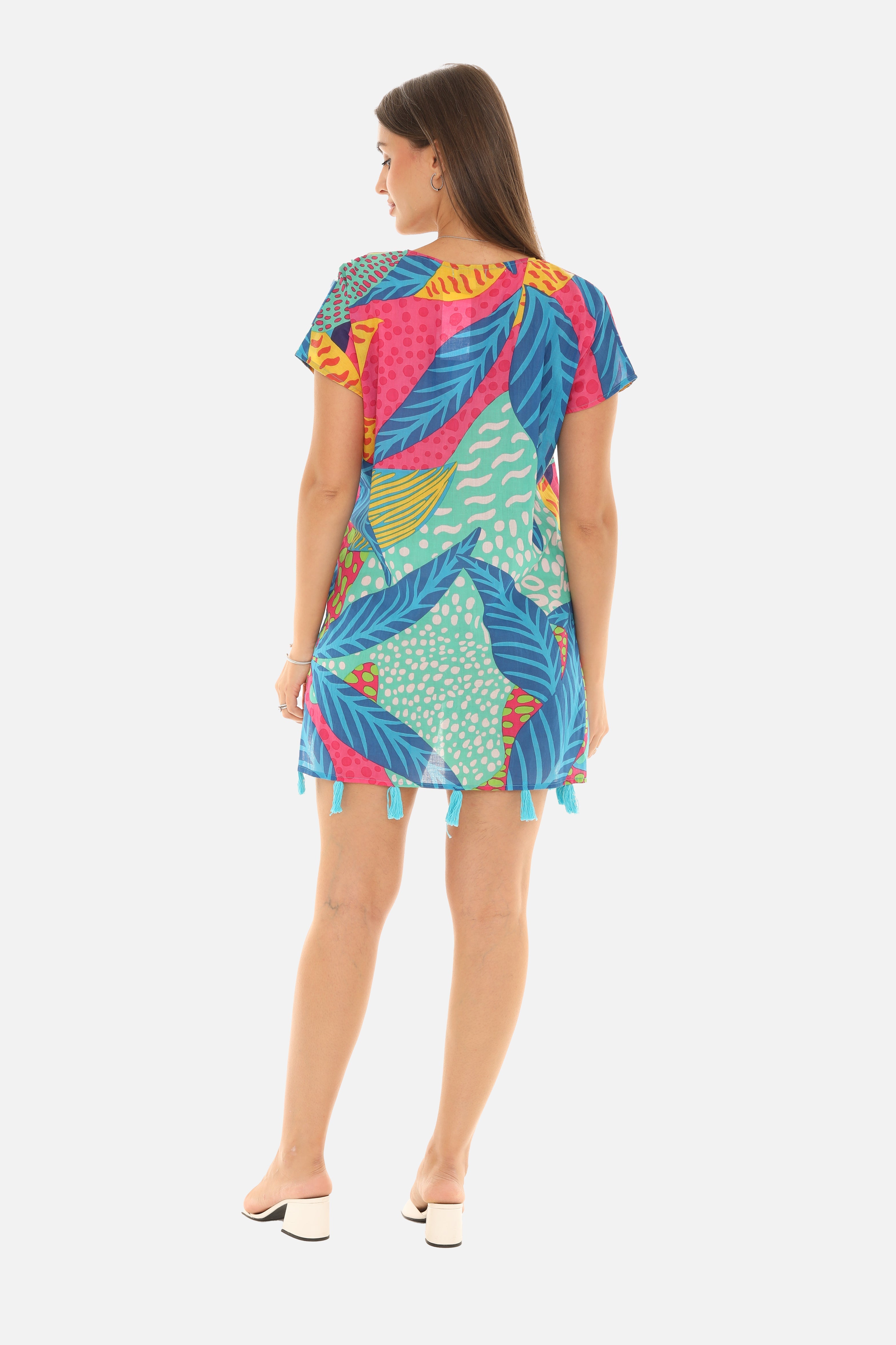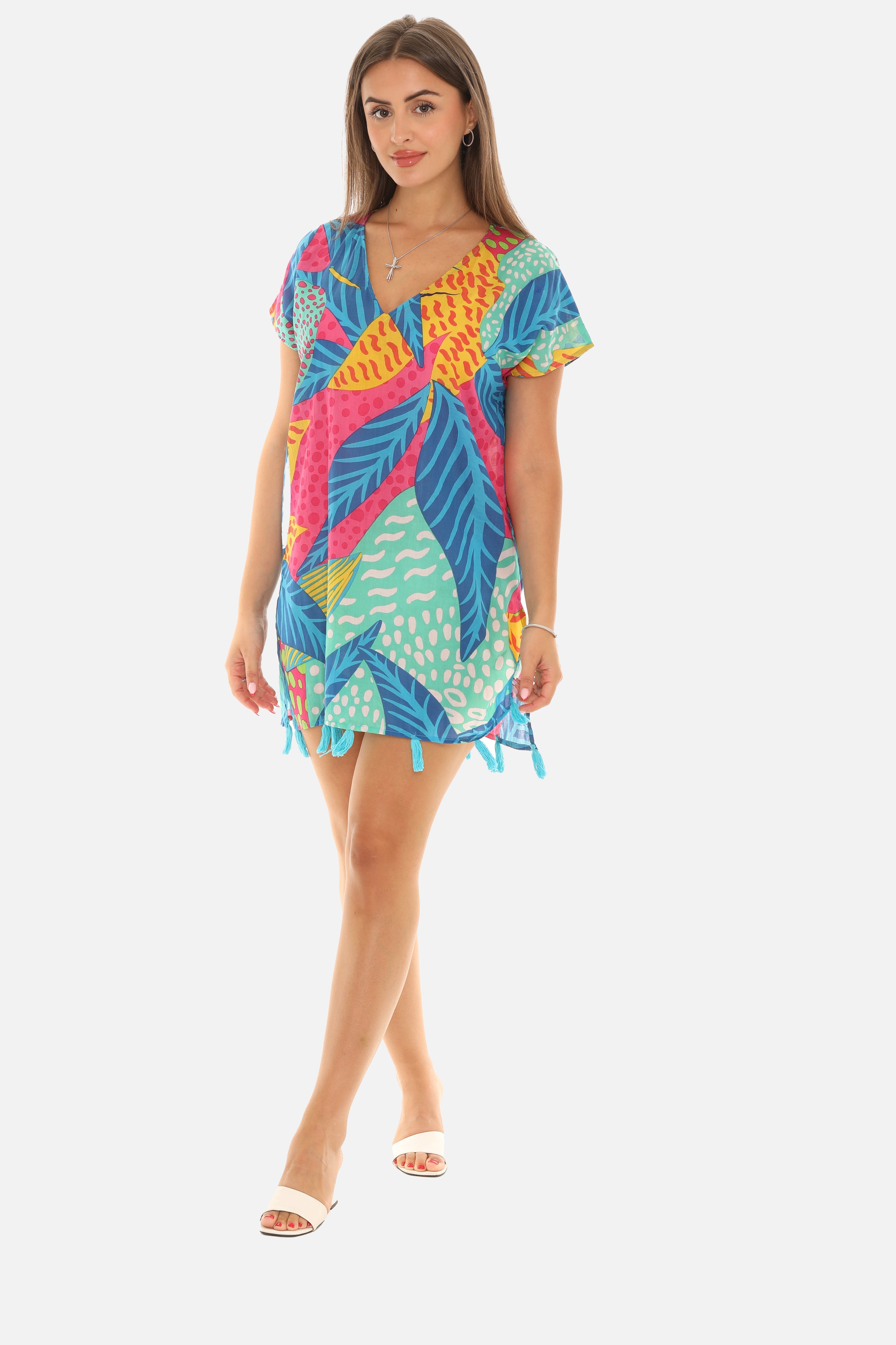 Tropical Print V-Neck Short Sleeves Tunic With Tassels