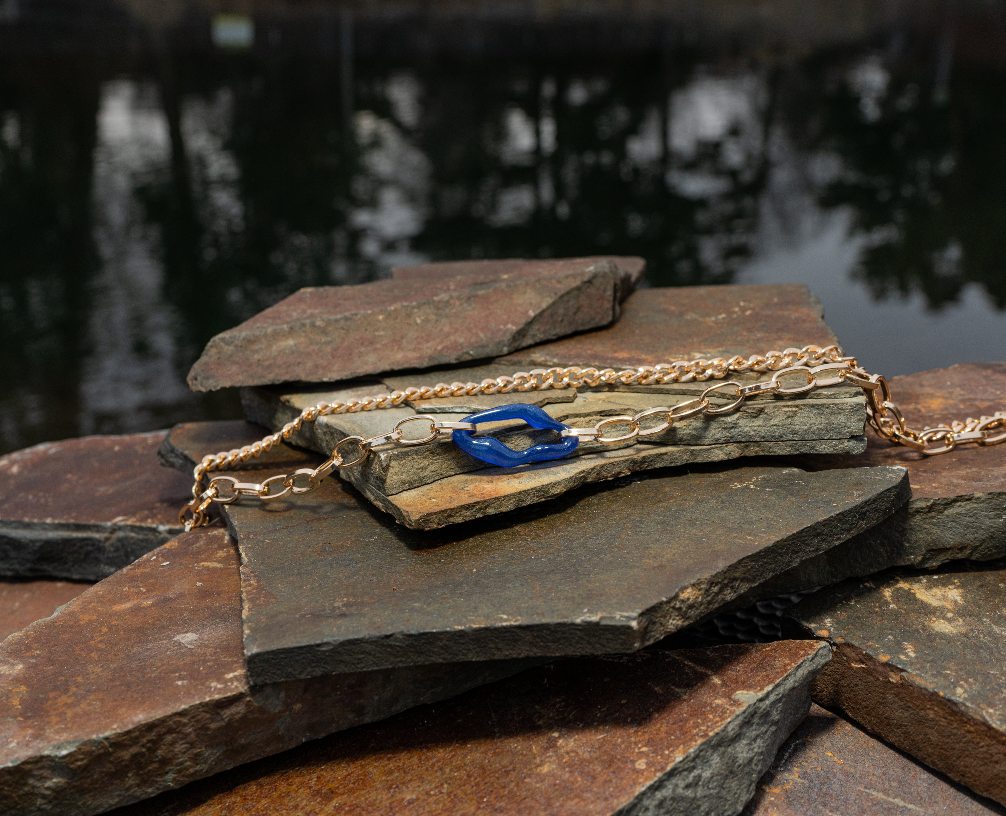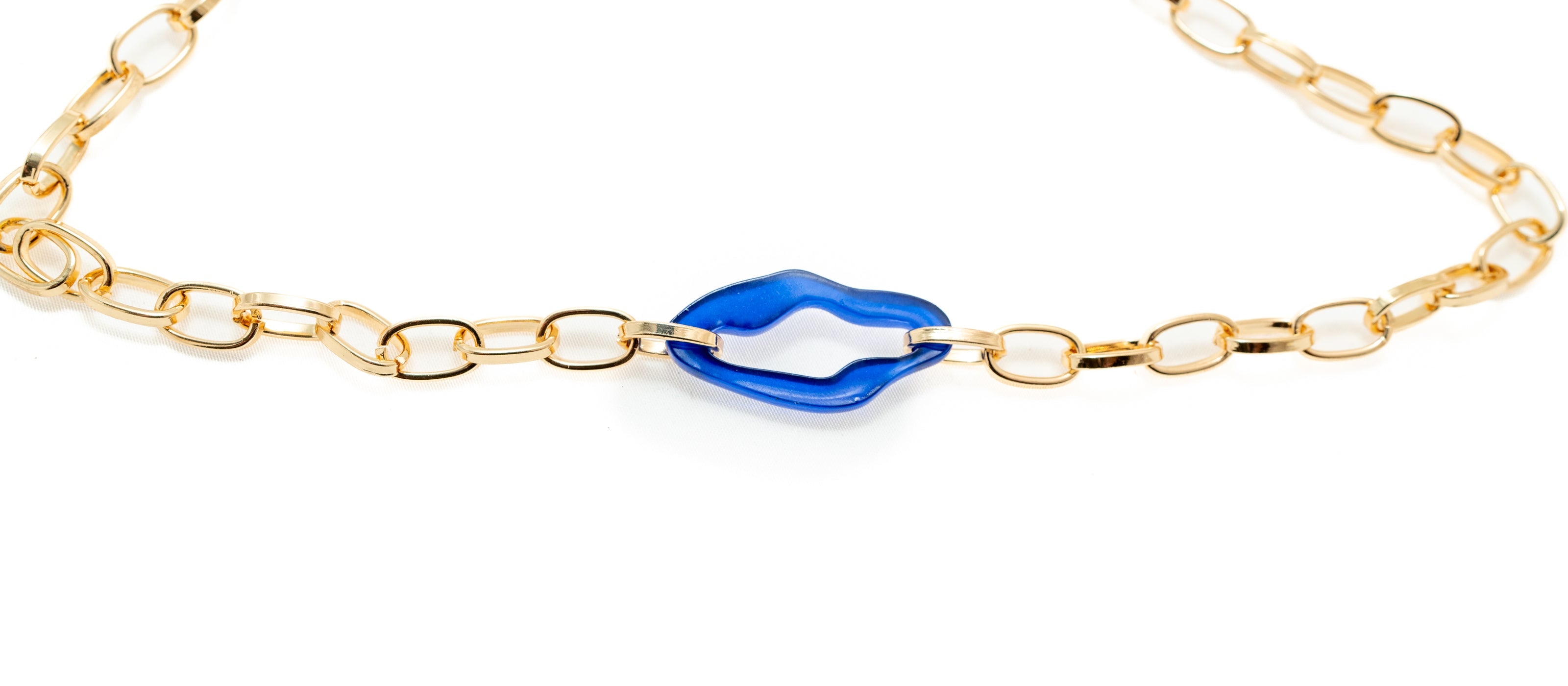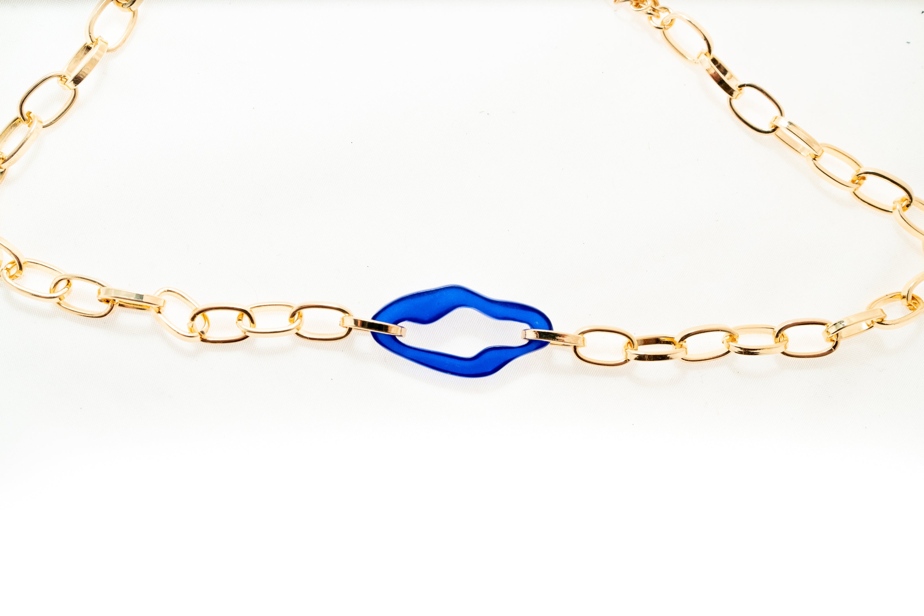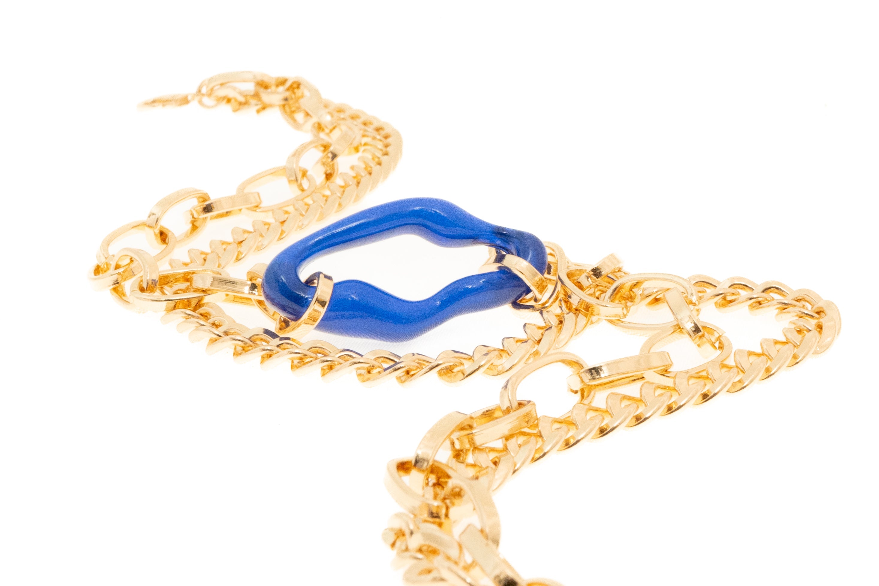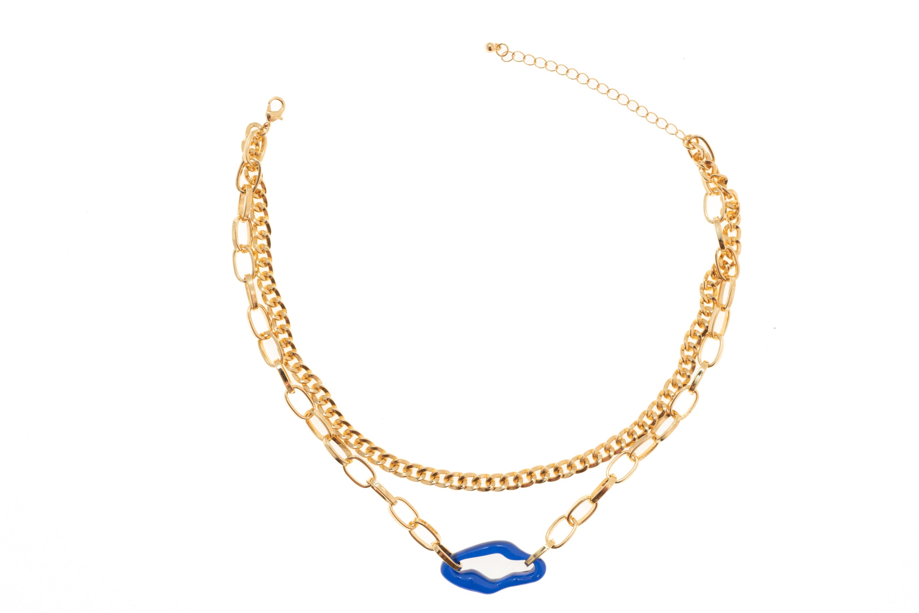 Two Row Chain Link Necklace With Lucite Blue Pendant