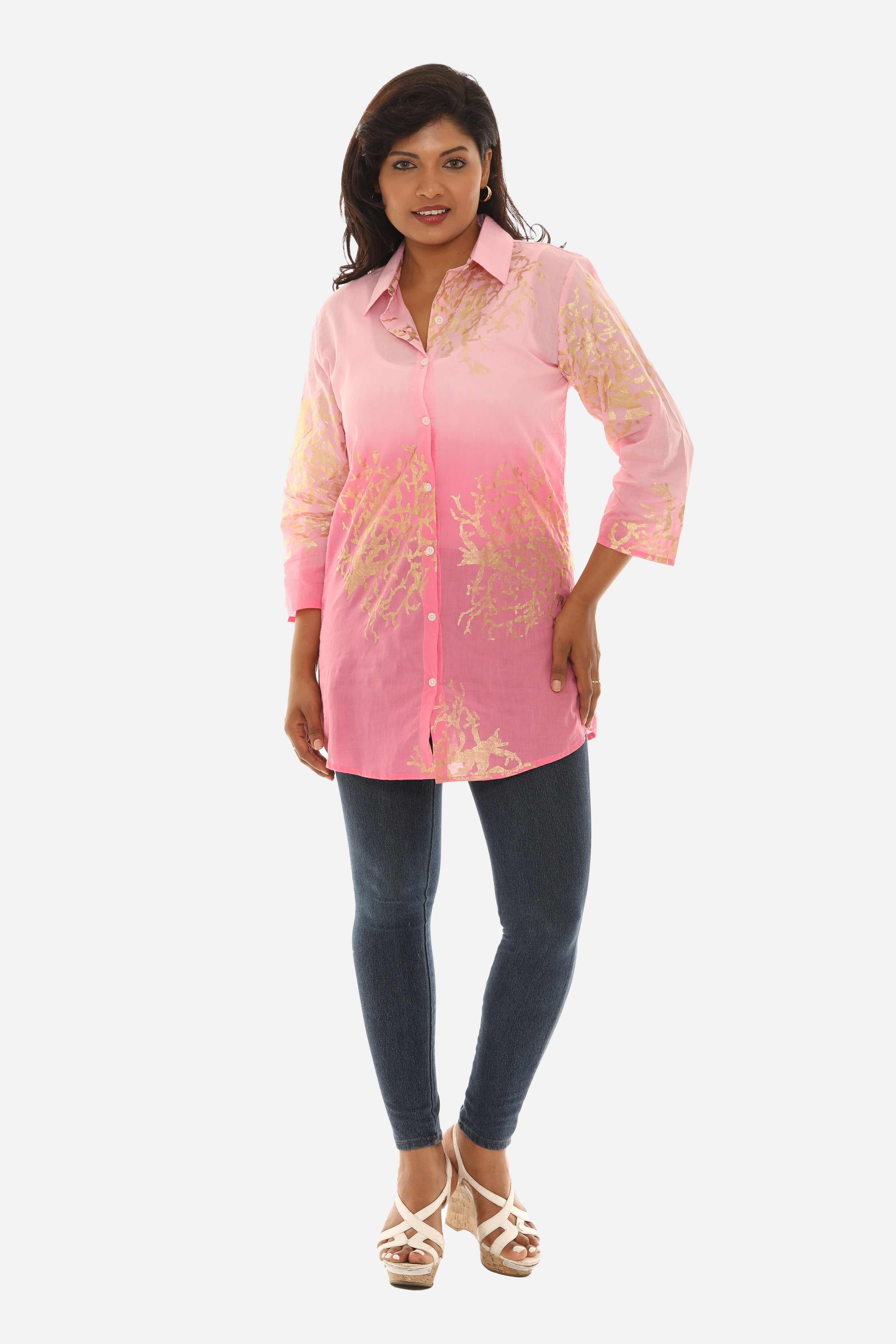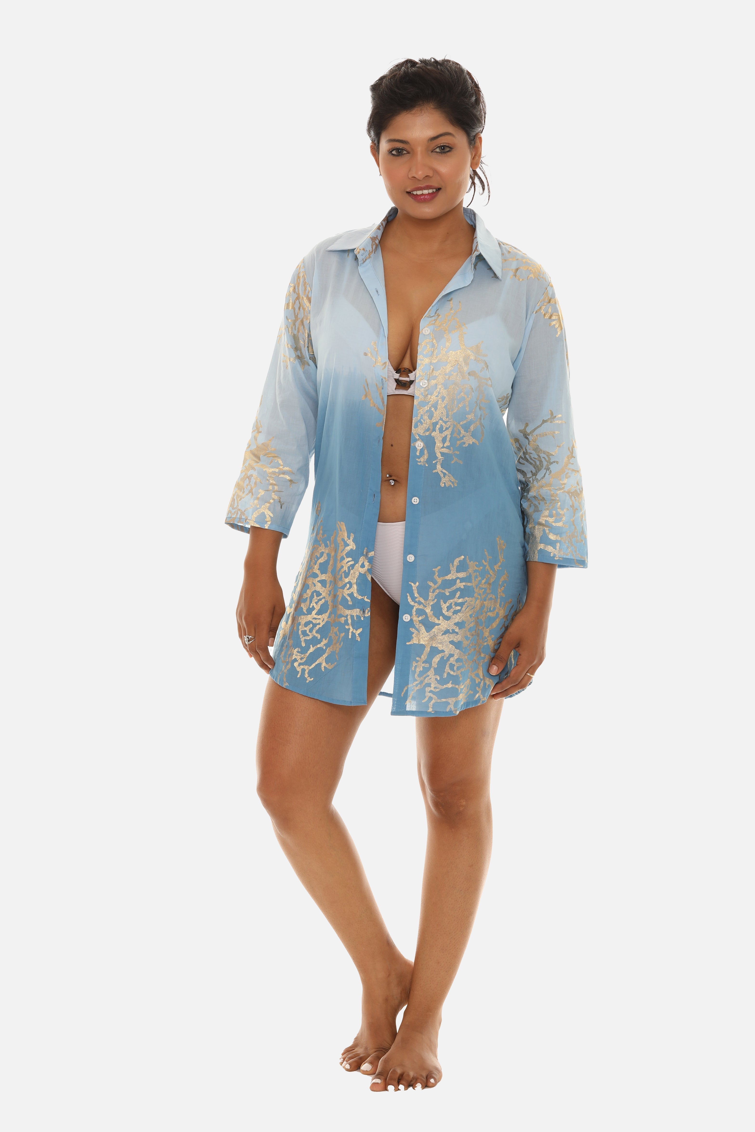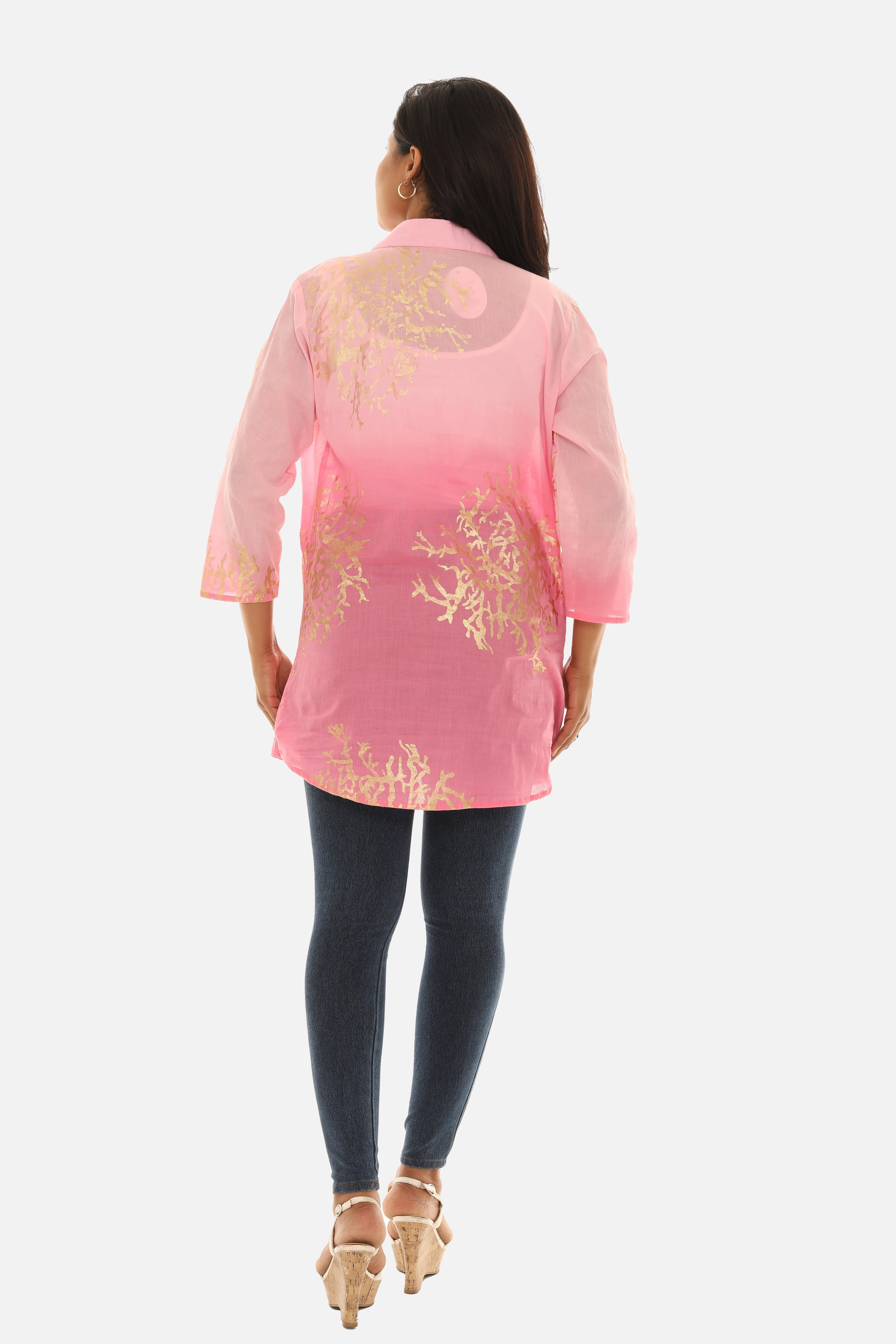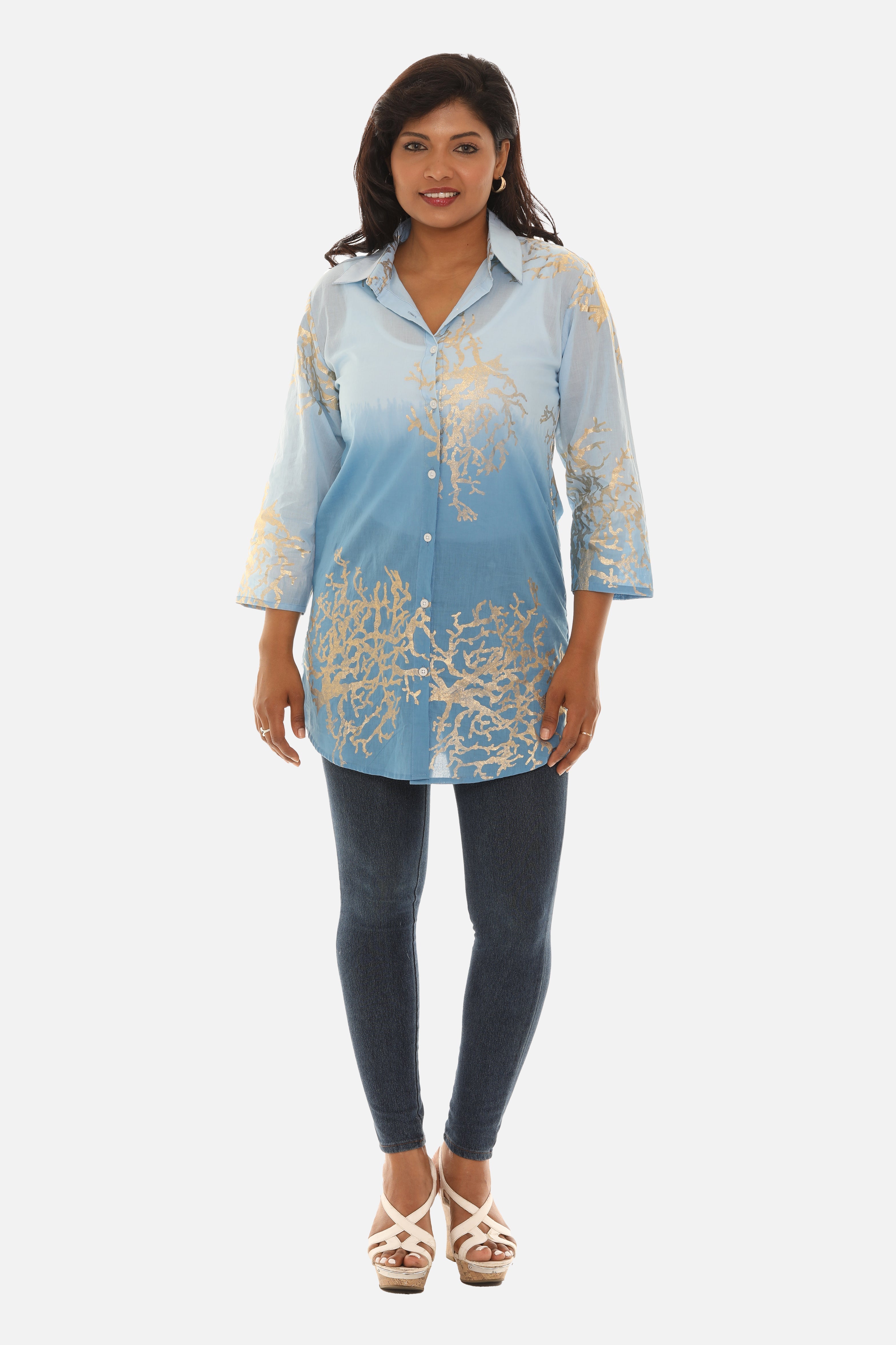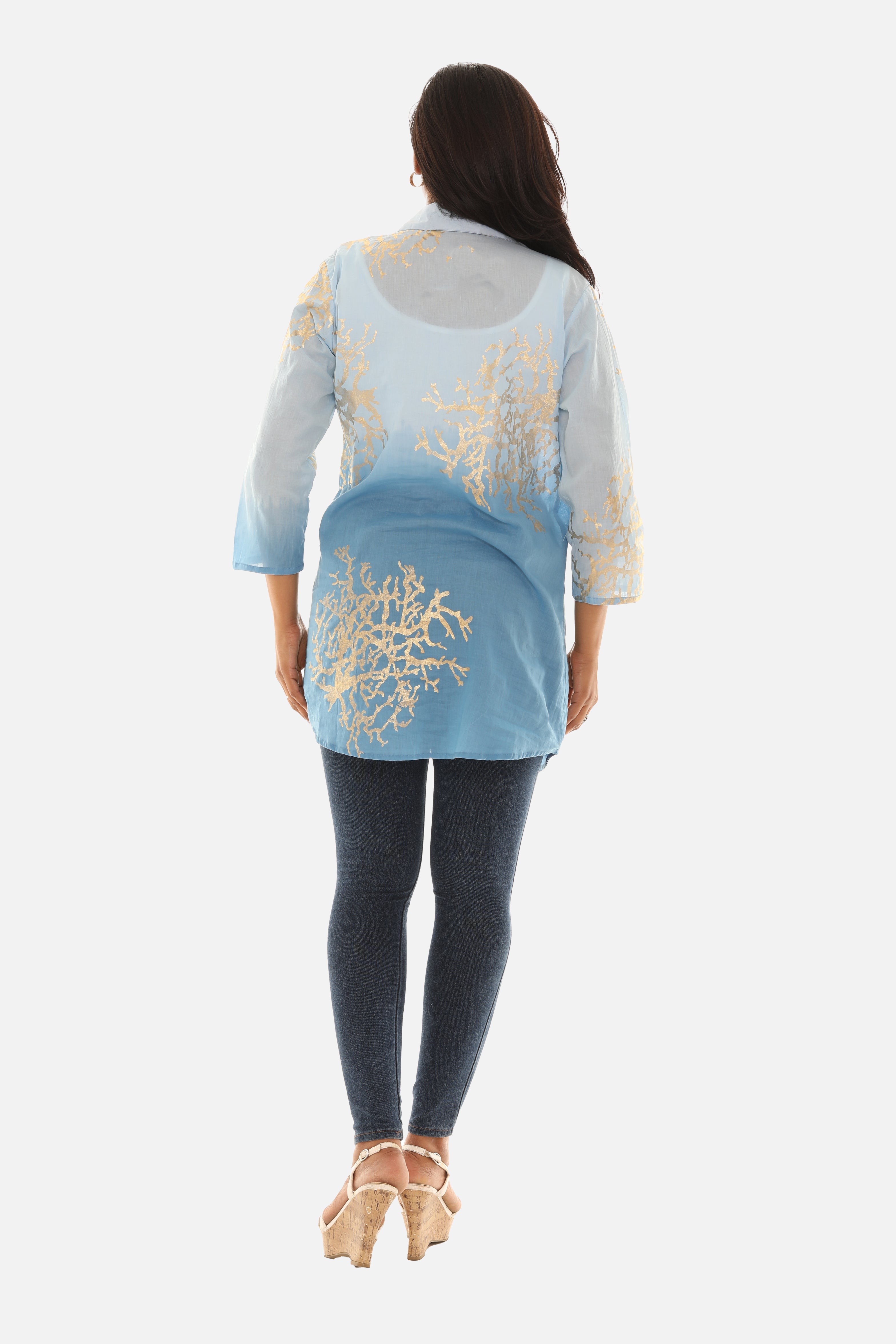 Unleash your inner fashionista with this two-tone button down shirt for women. The elegant gold foil print adds a touch of glamour to any outfit, making you stand out from the crowd. Perfect for a night out or a day at the office, this shirt is a must-have in your wardrobe. (Fashionably fabulous!)