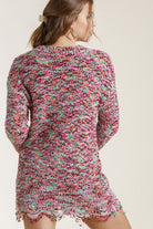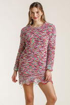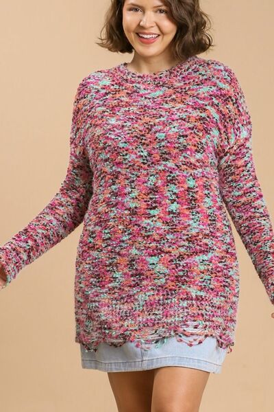 Umgee Full Size Distressed Hem Multicolored Round Neck Knit Tunic Dress Plus Size