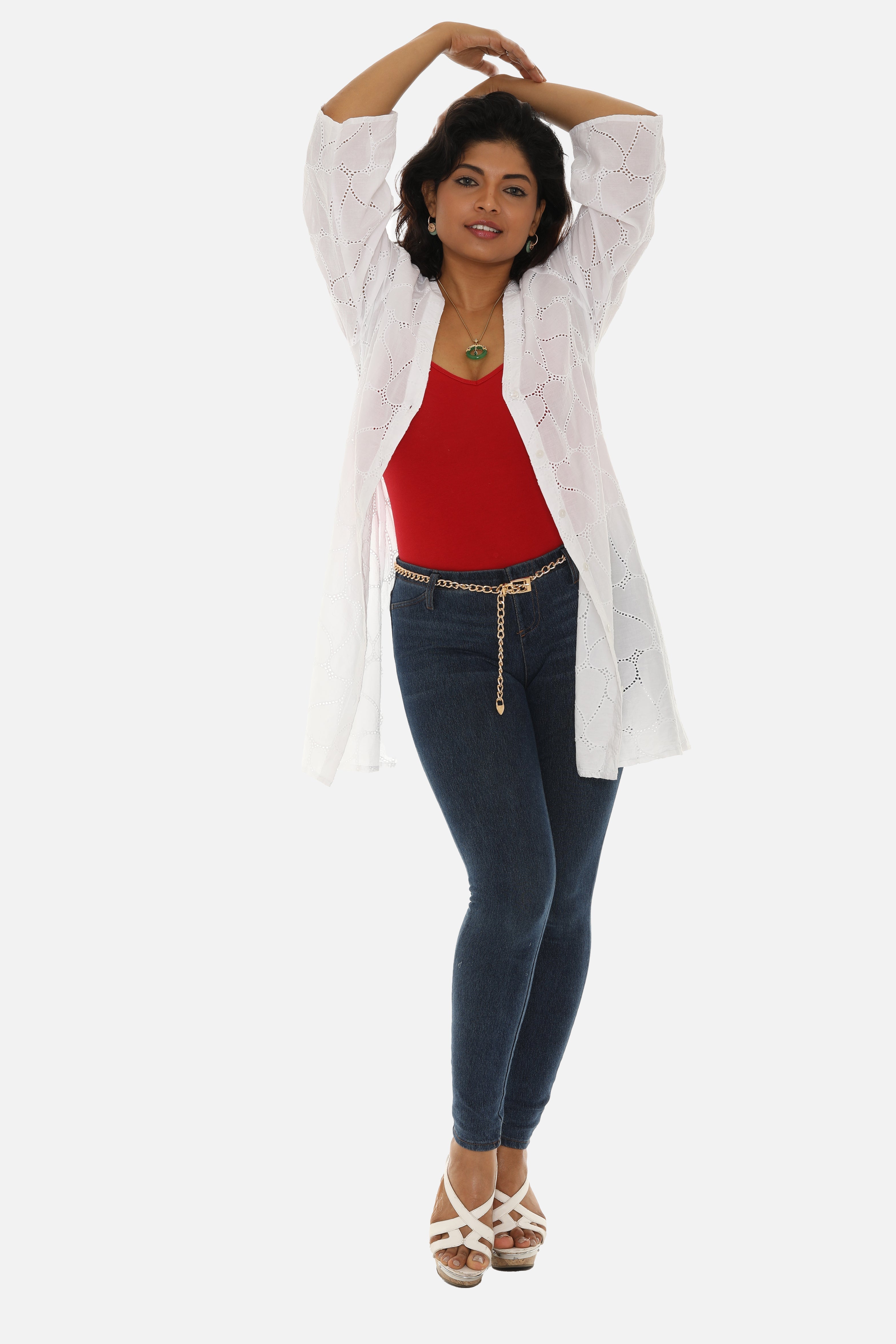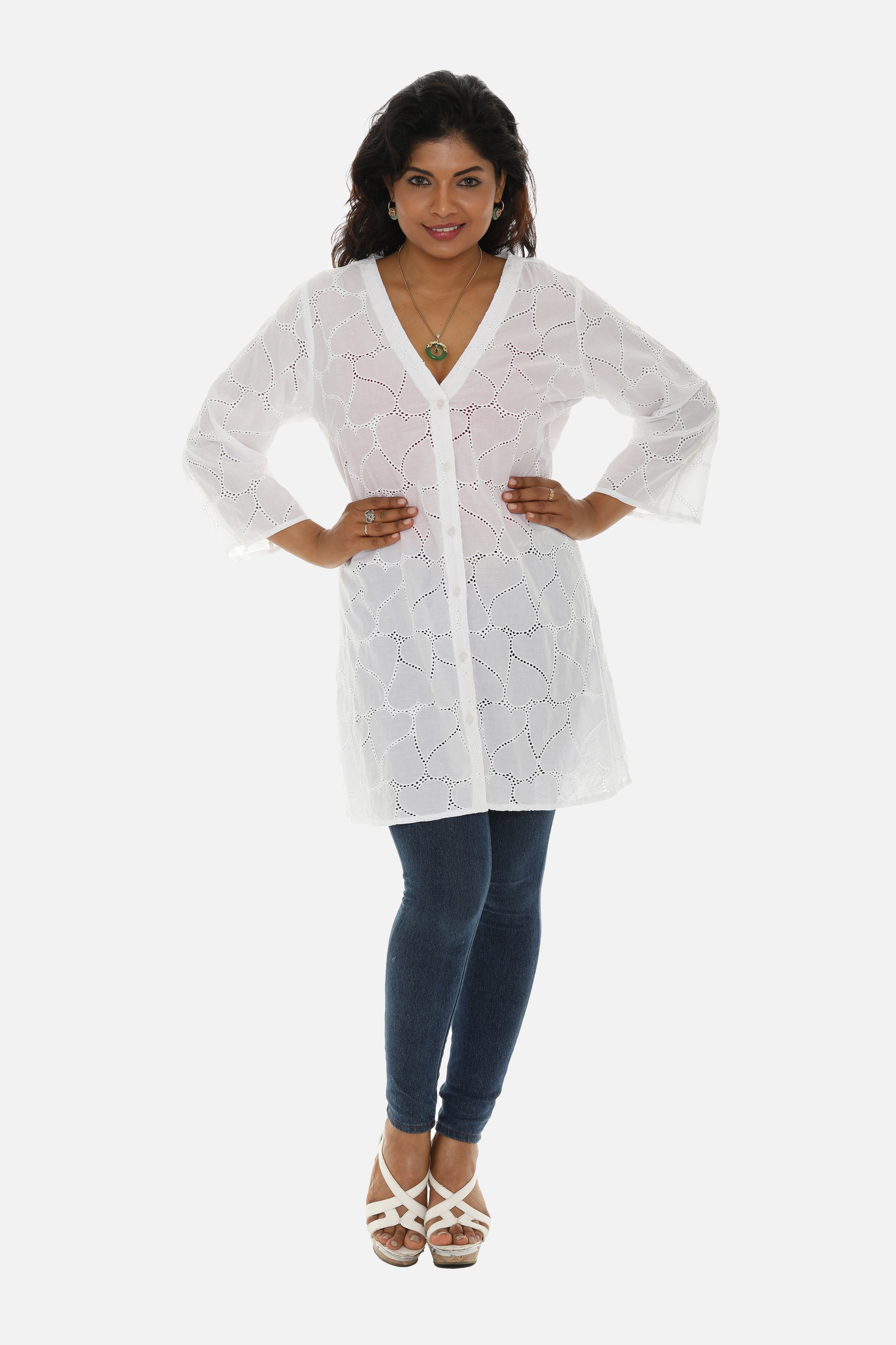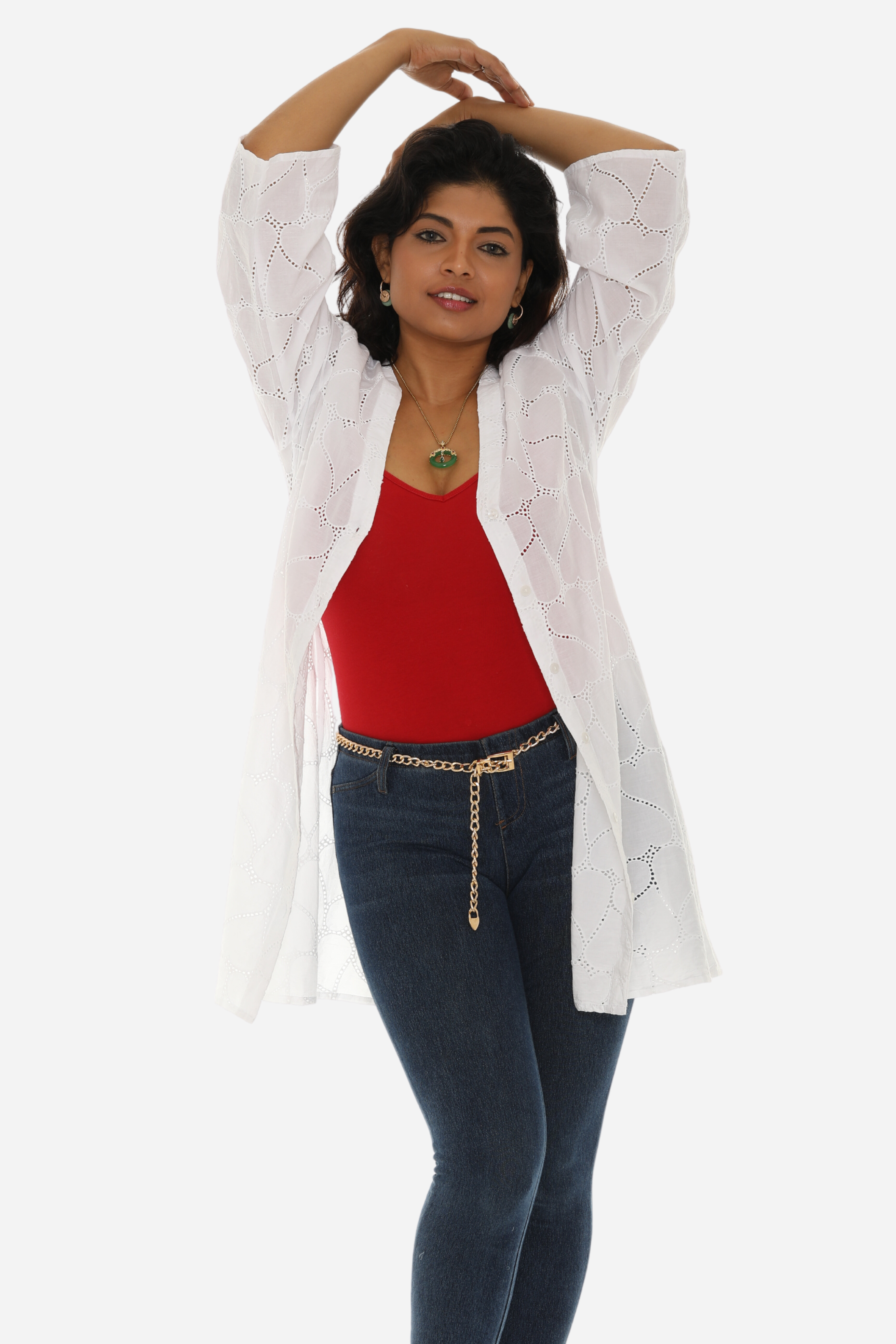 A stylish and versatile shirt for women, this V-neck eyelet button-down features a delicate eyelet pattern and a flattering V-neckline. The button-down design makes it easy to wear and layer, while the lightweight fabric adds breathability and comfort. Perfect for dressing up or down, this shirt is a great addition to any wardrobe.