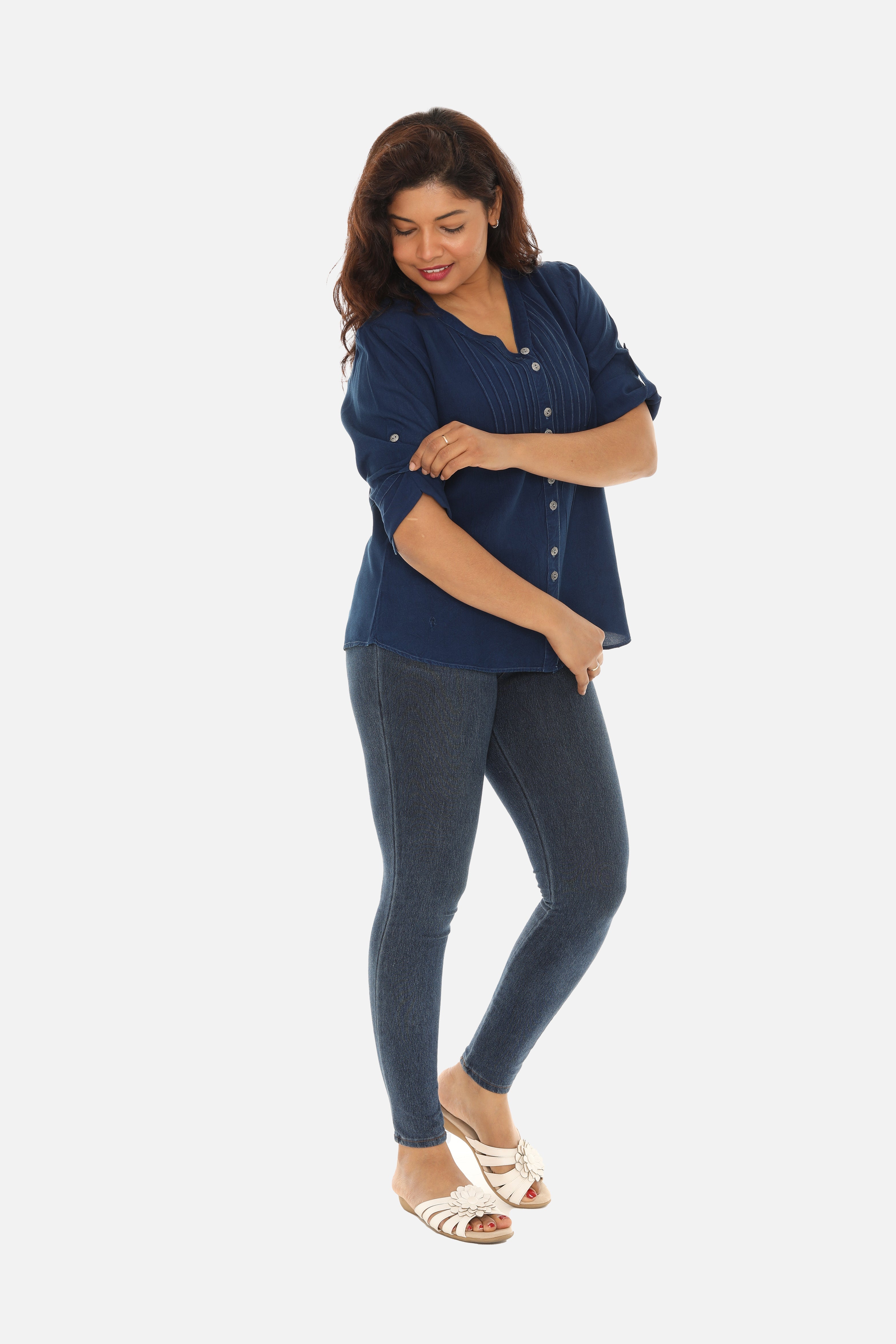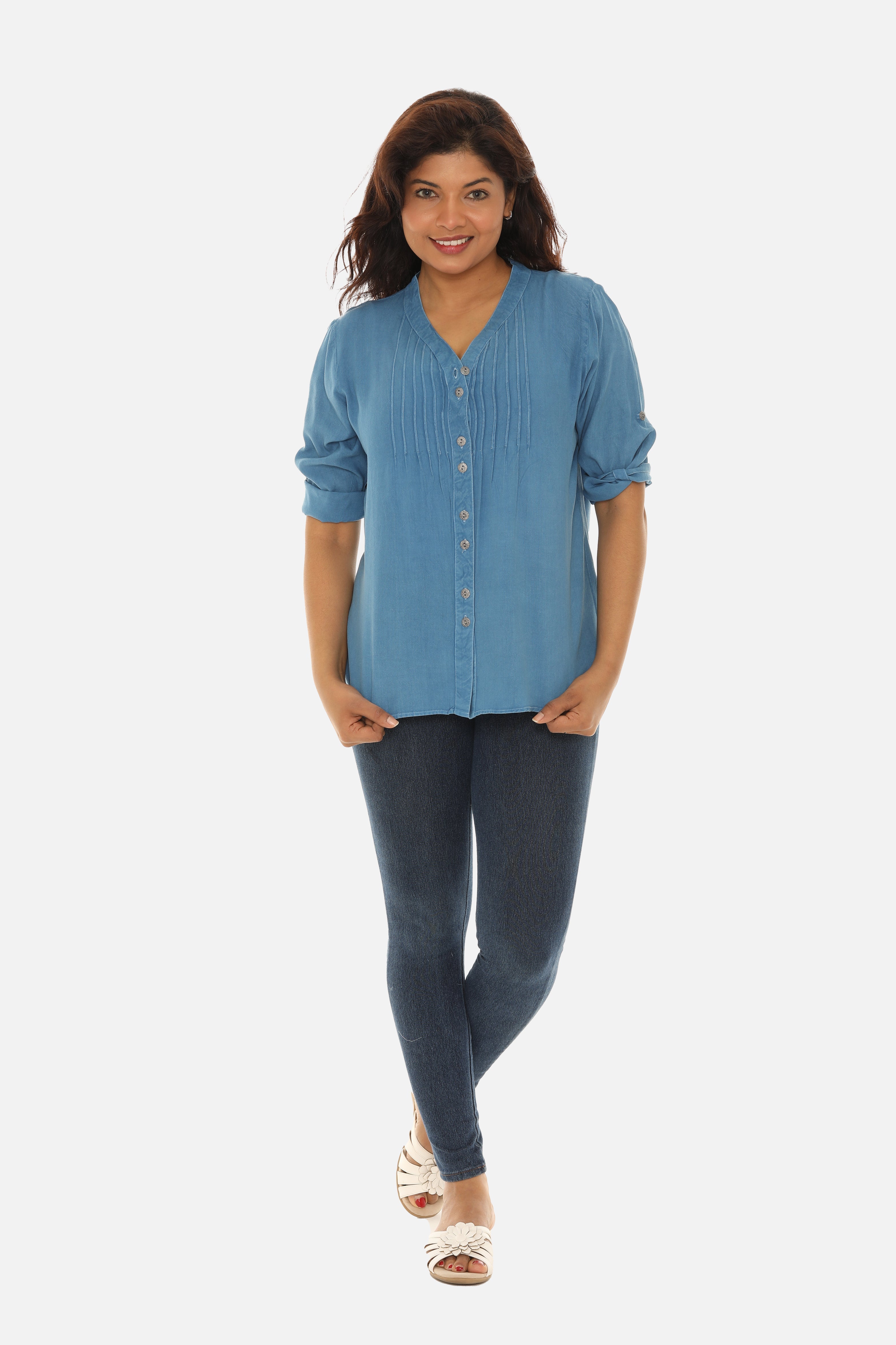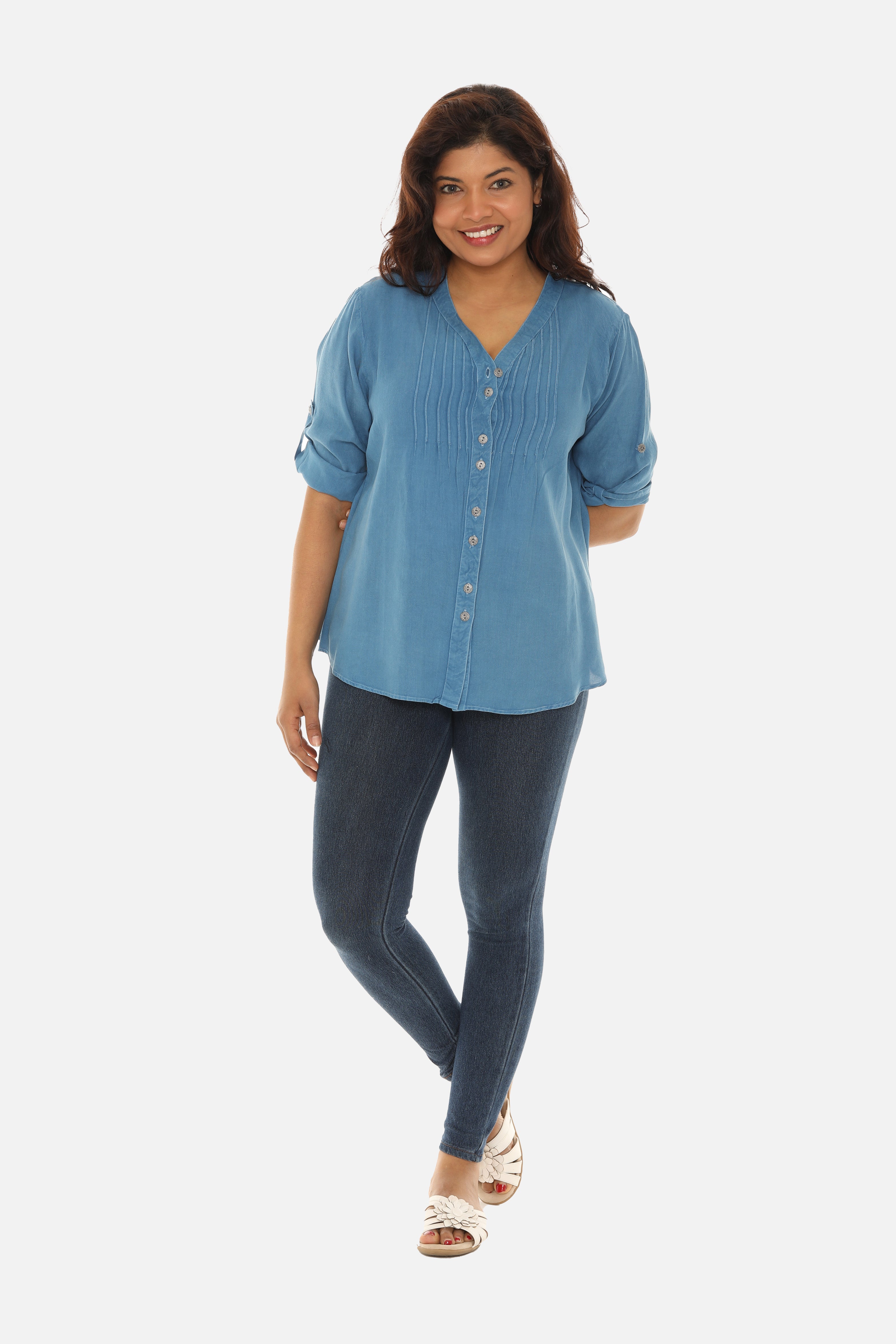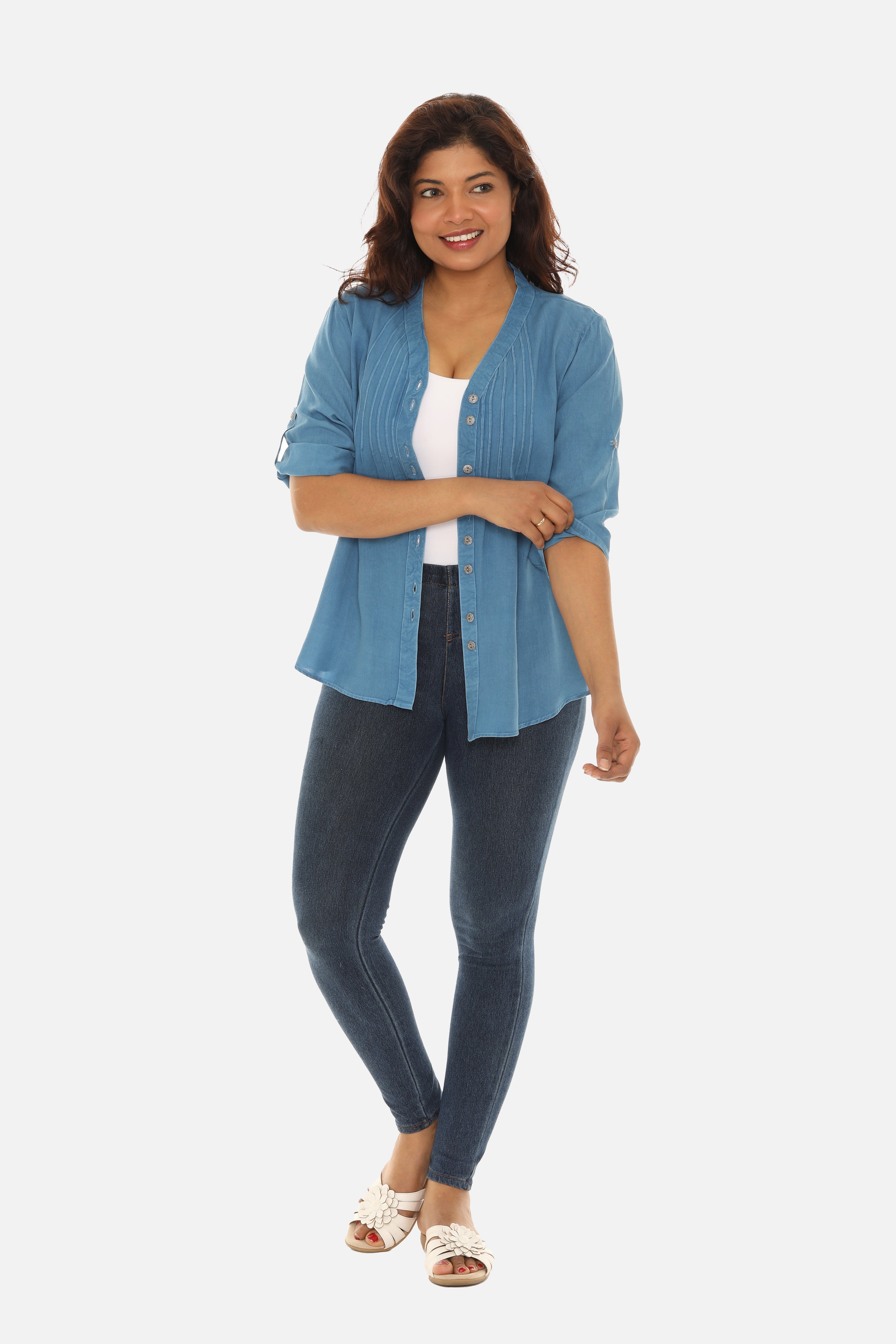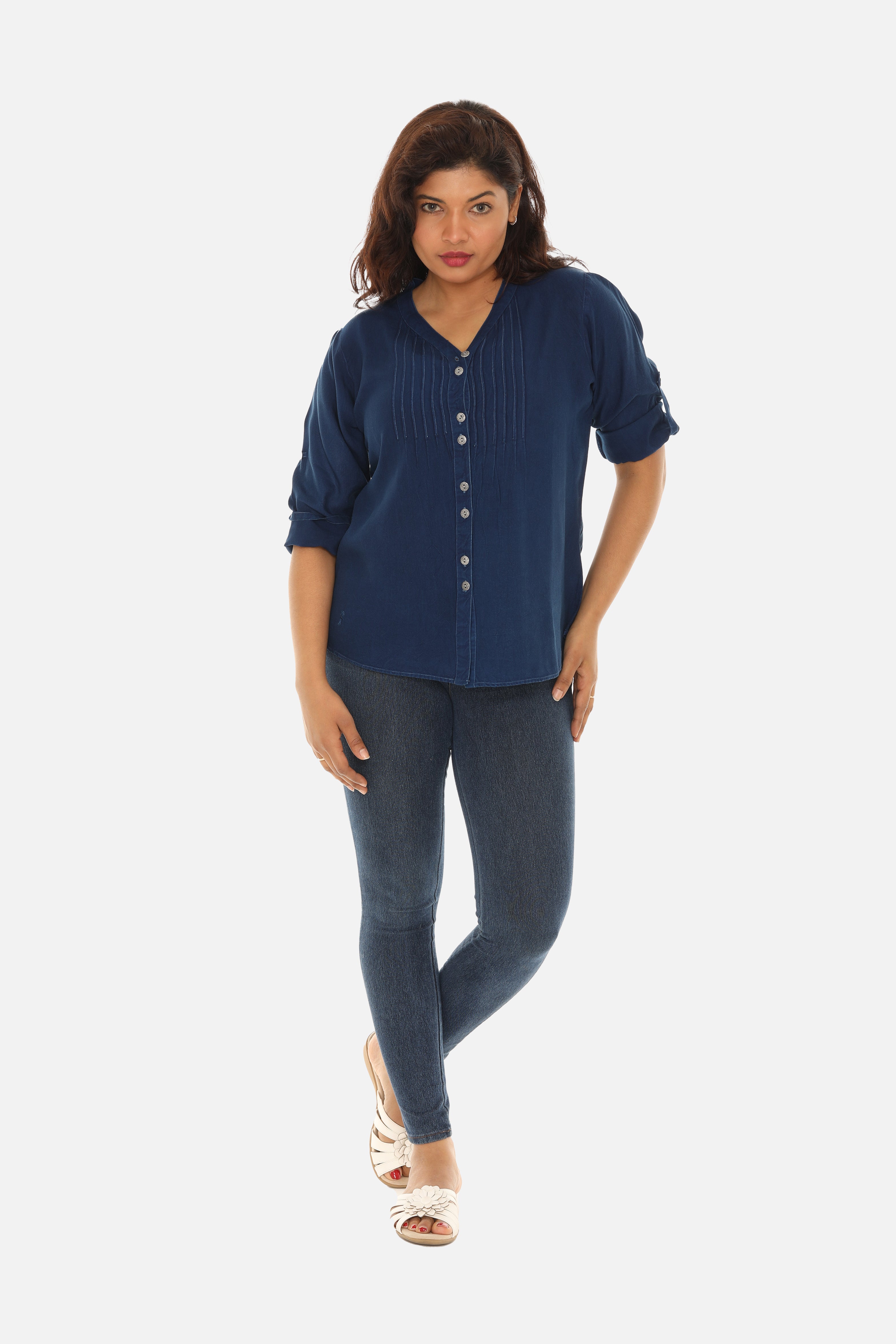 Introducing our Denim look V-Neck Pin-Tuck Button-Front Tunic, the perfect blend of style and comfort. Made from premium quality denim look rayon fabric, this tunic features a v-neck design with a button-front closure that gives it a timeless look.