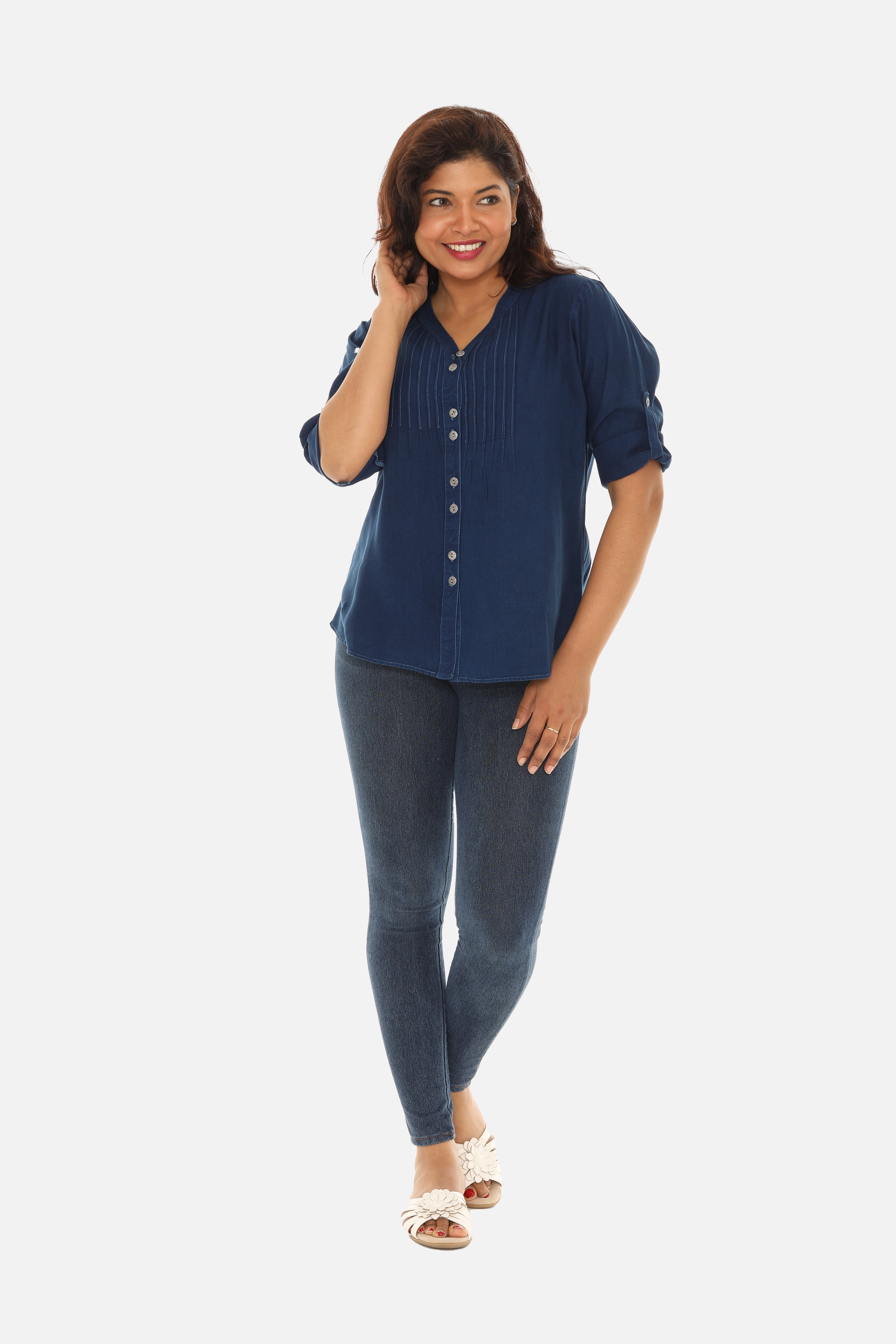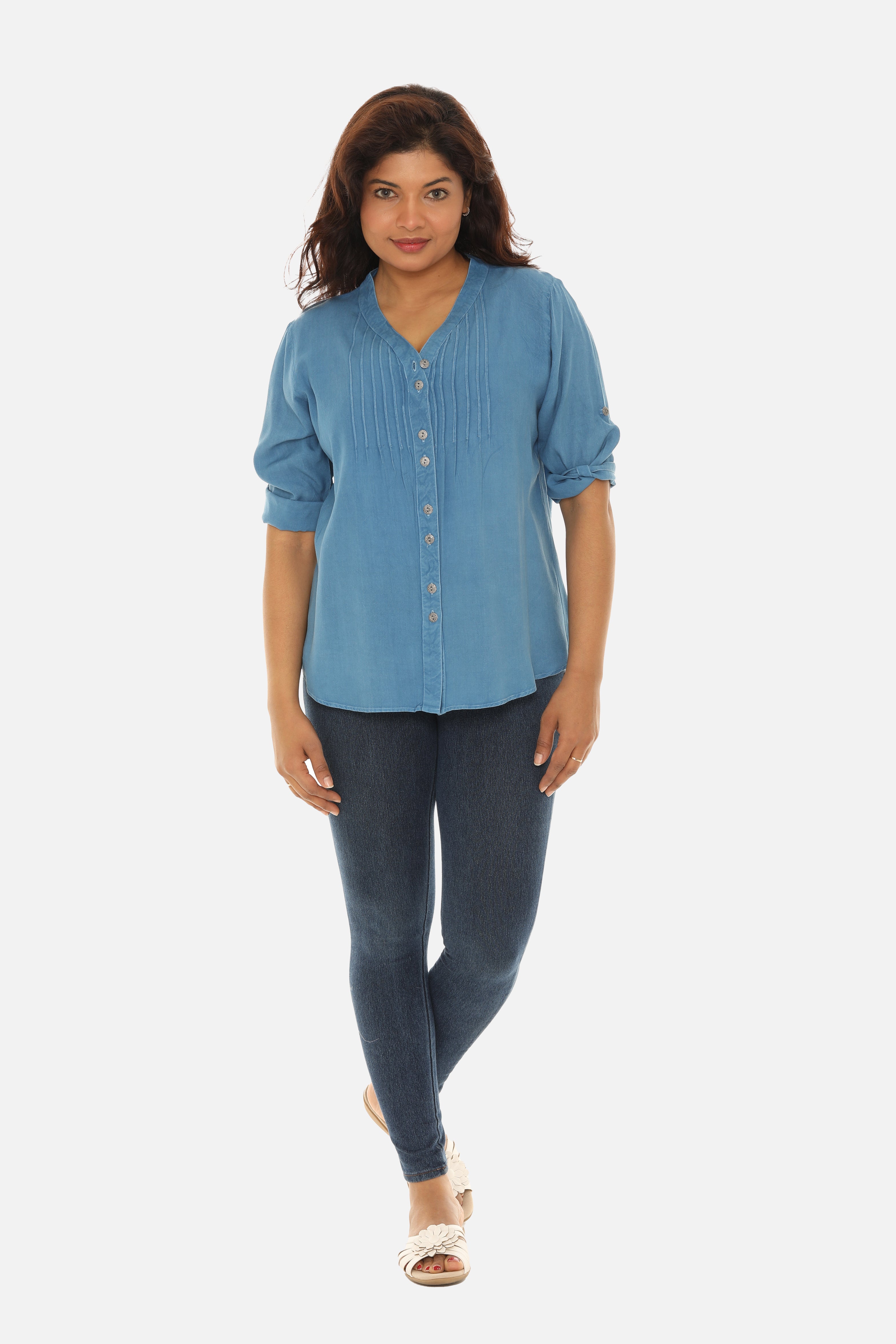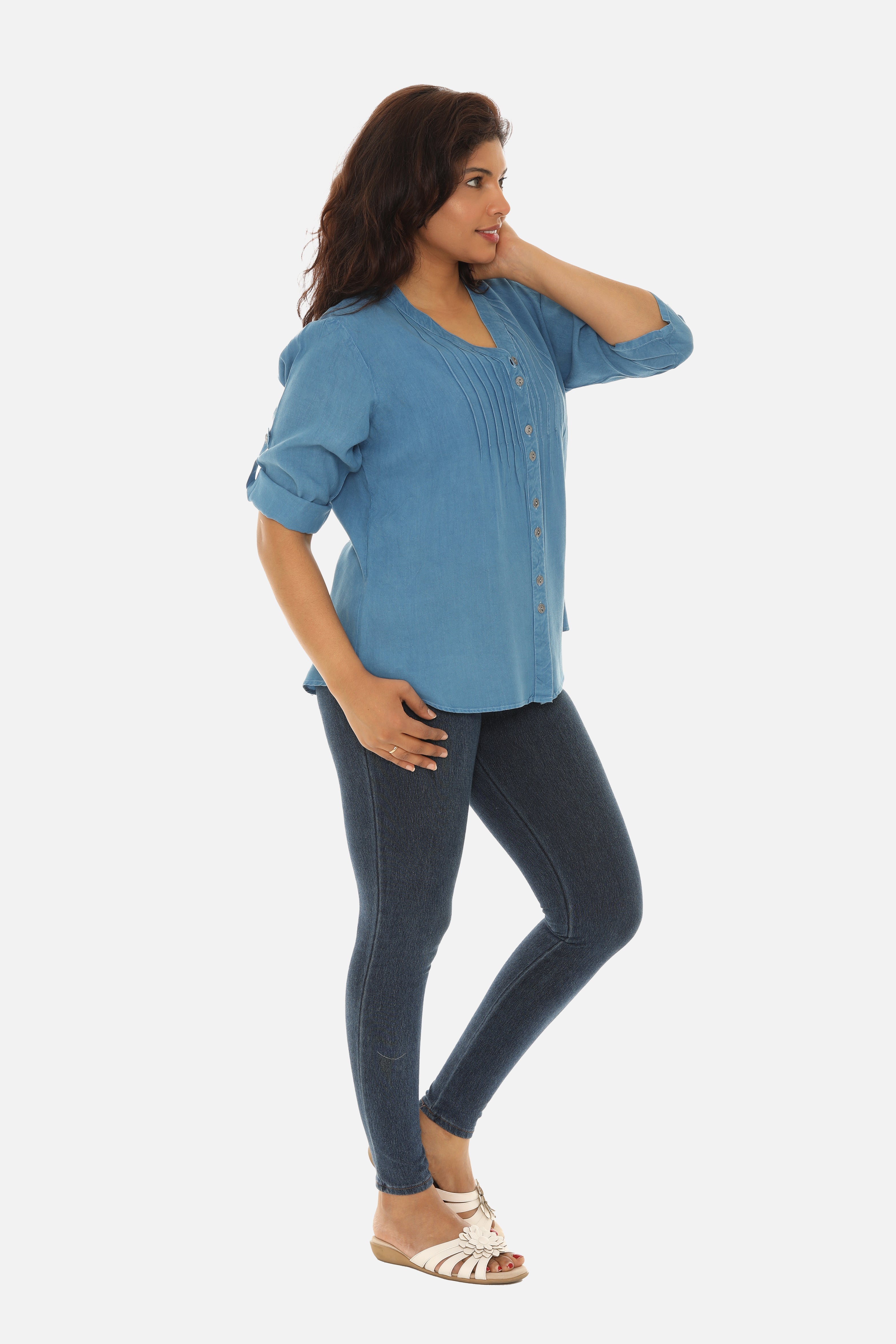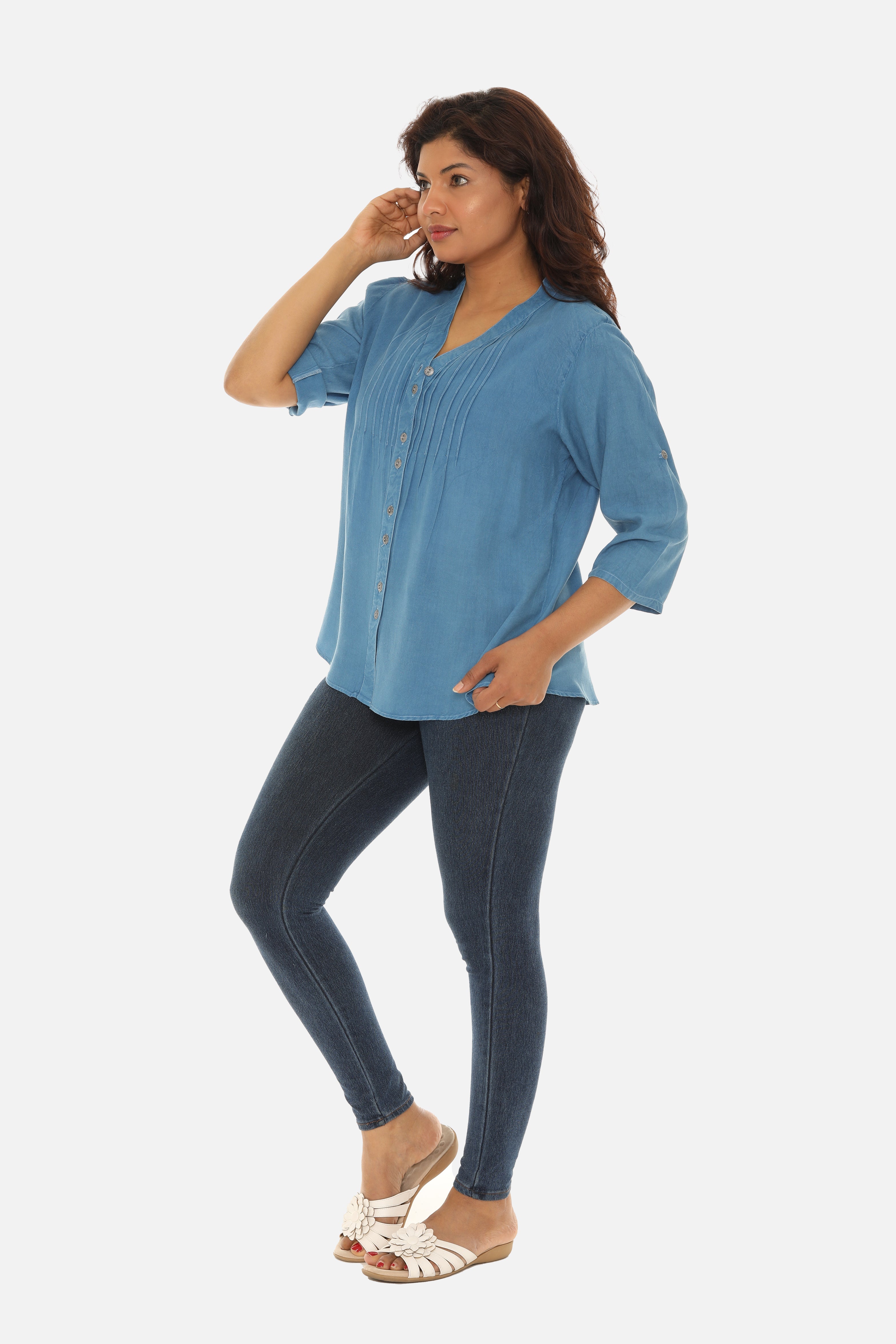 Introducing our Denim look V-Neck Pin-Tuck Button-Front Tunic, the perfect blend of style and comfort. Made from premium quality denim look rayon fabric, this tunic features a v-neck design with a button-front closure that gives it a timeless look.