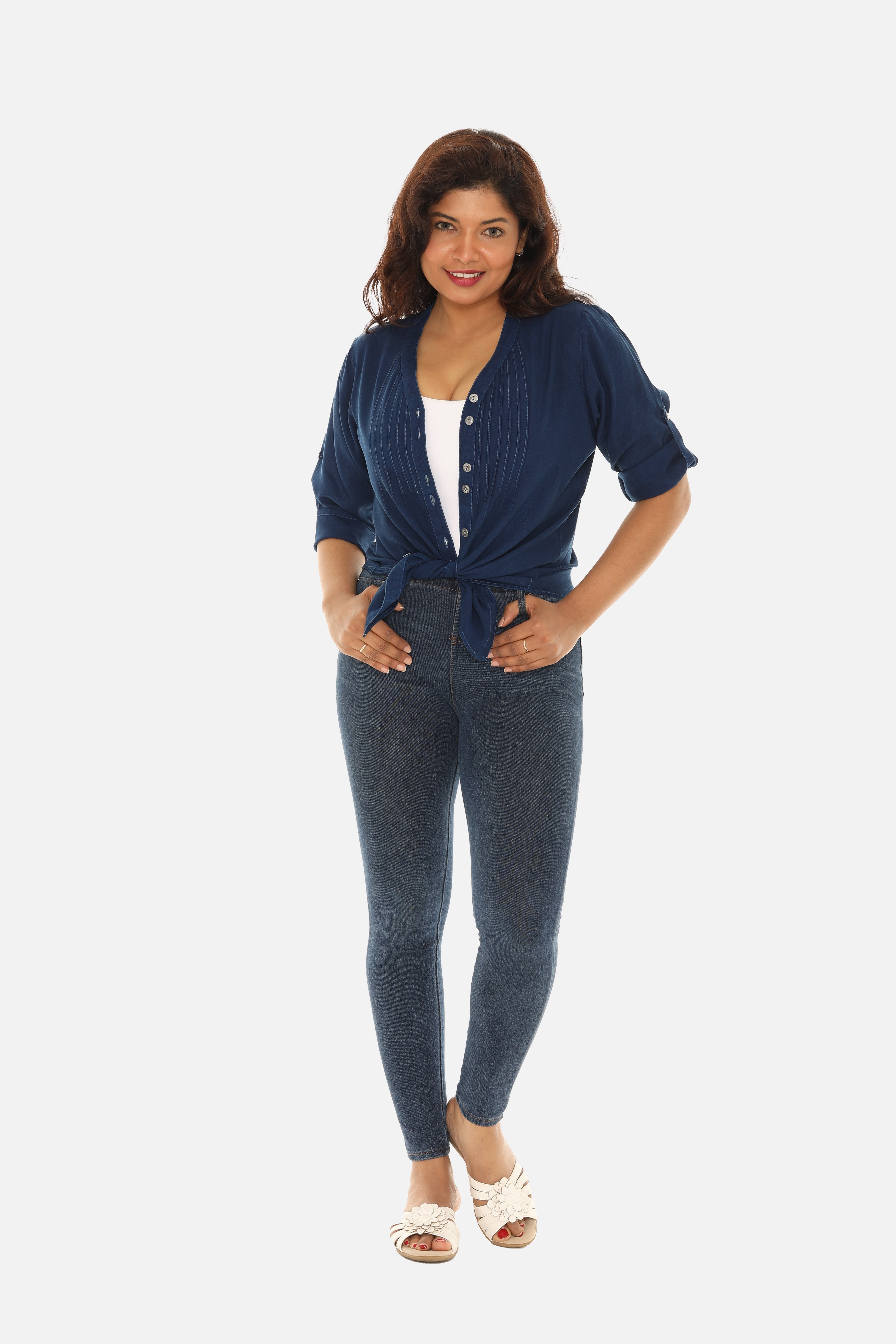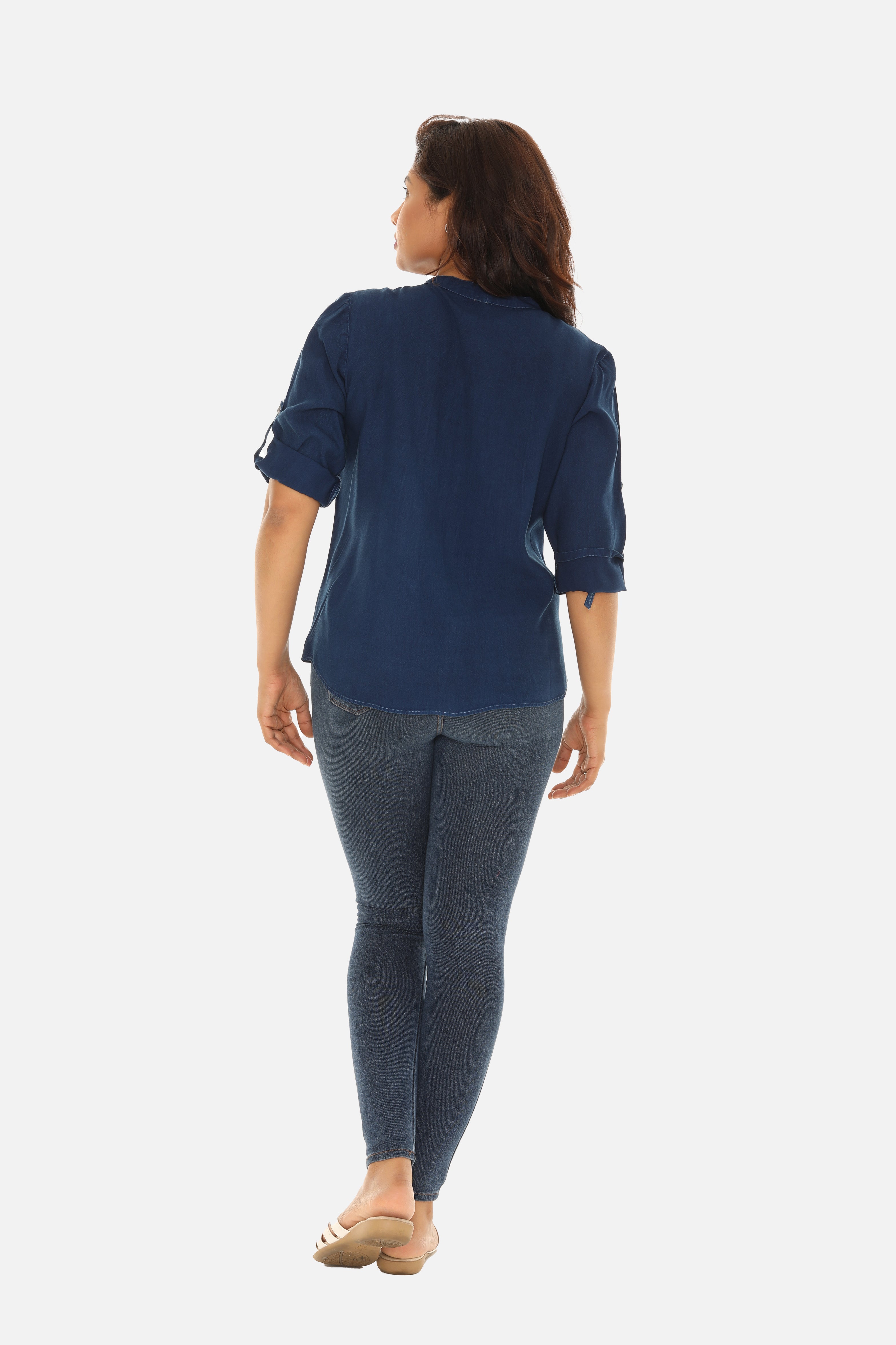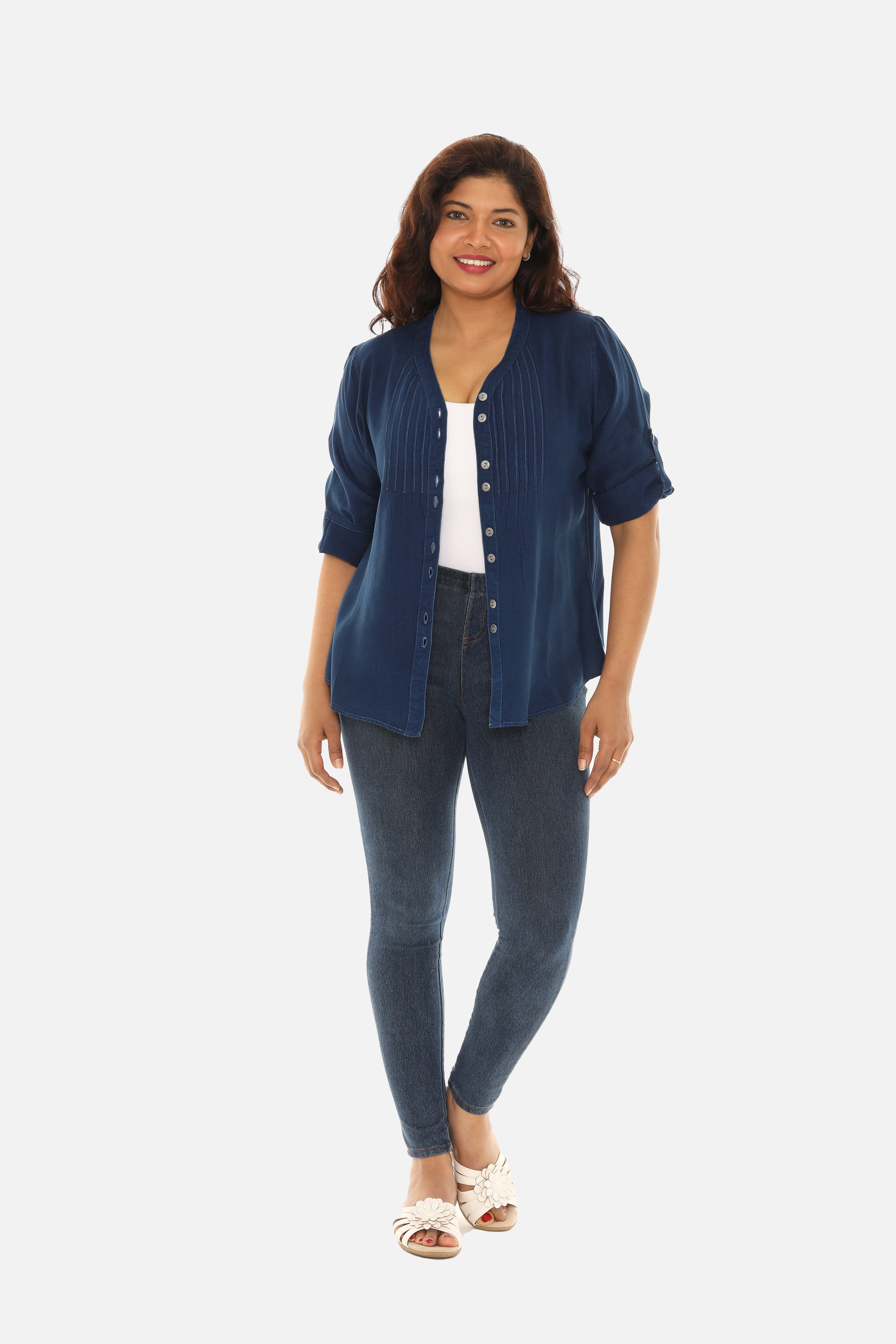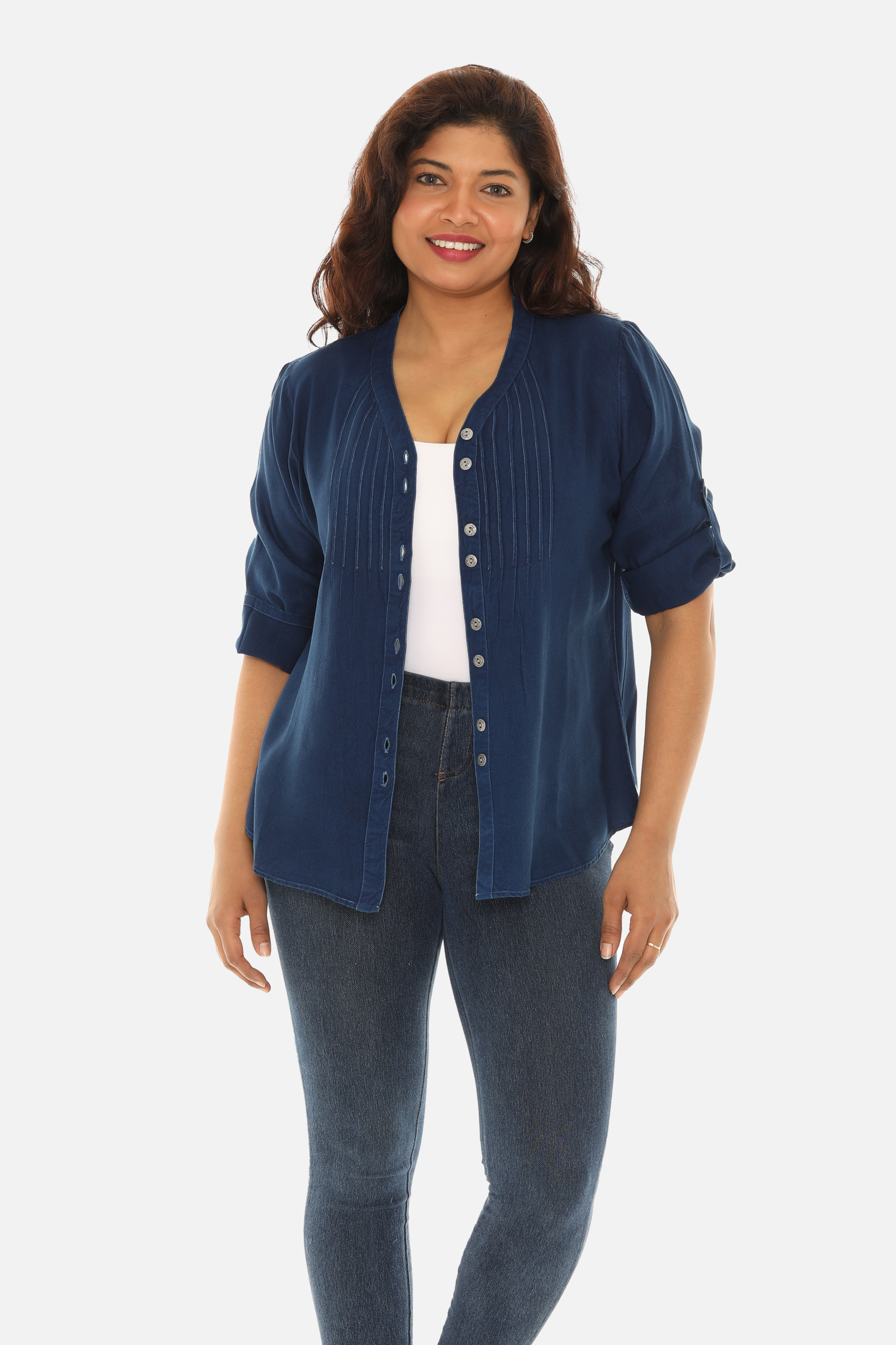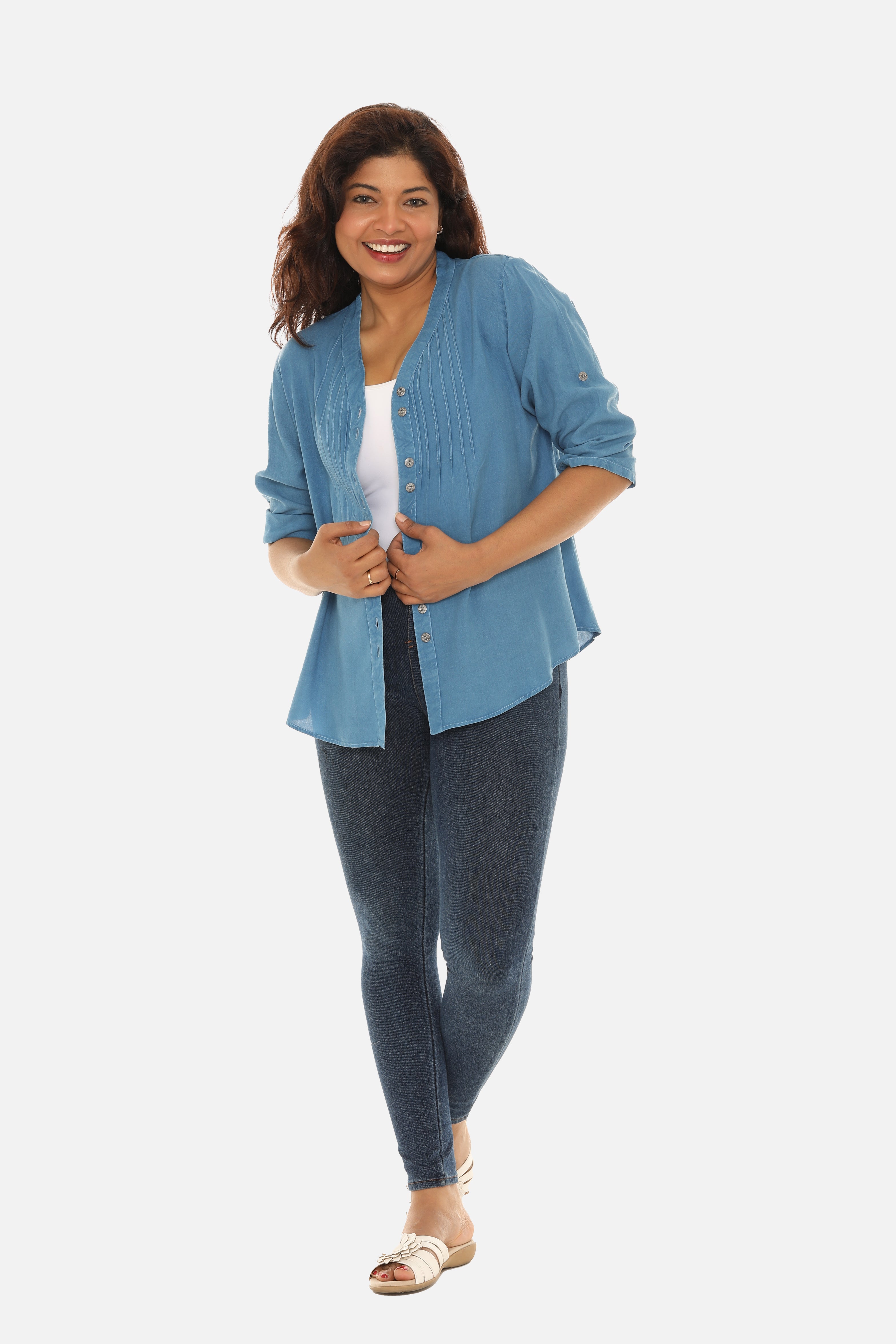 Introducing our Denim look V-Neck Pin-Tuck Button-Front Tunic, the perfect blend of style and comfort. Made from premium quality denim look rayon fabric, this tunic features a v-neck design with a button-front closure that gives it a timeless look.