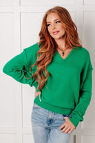 Introducing our Very Understandable V-Neck Sweater in Green! Made from lightweight knit, with a flattering V-neck and drop shoulder design. The ribbed cuffs and hem add a touch of texture, while exposed seams add a unique touch. Easy to style, this sweater is a must-have for your wardrobe.