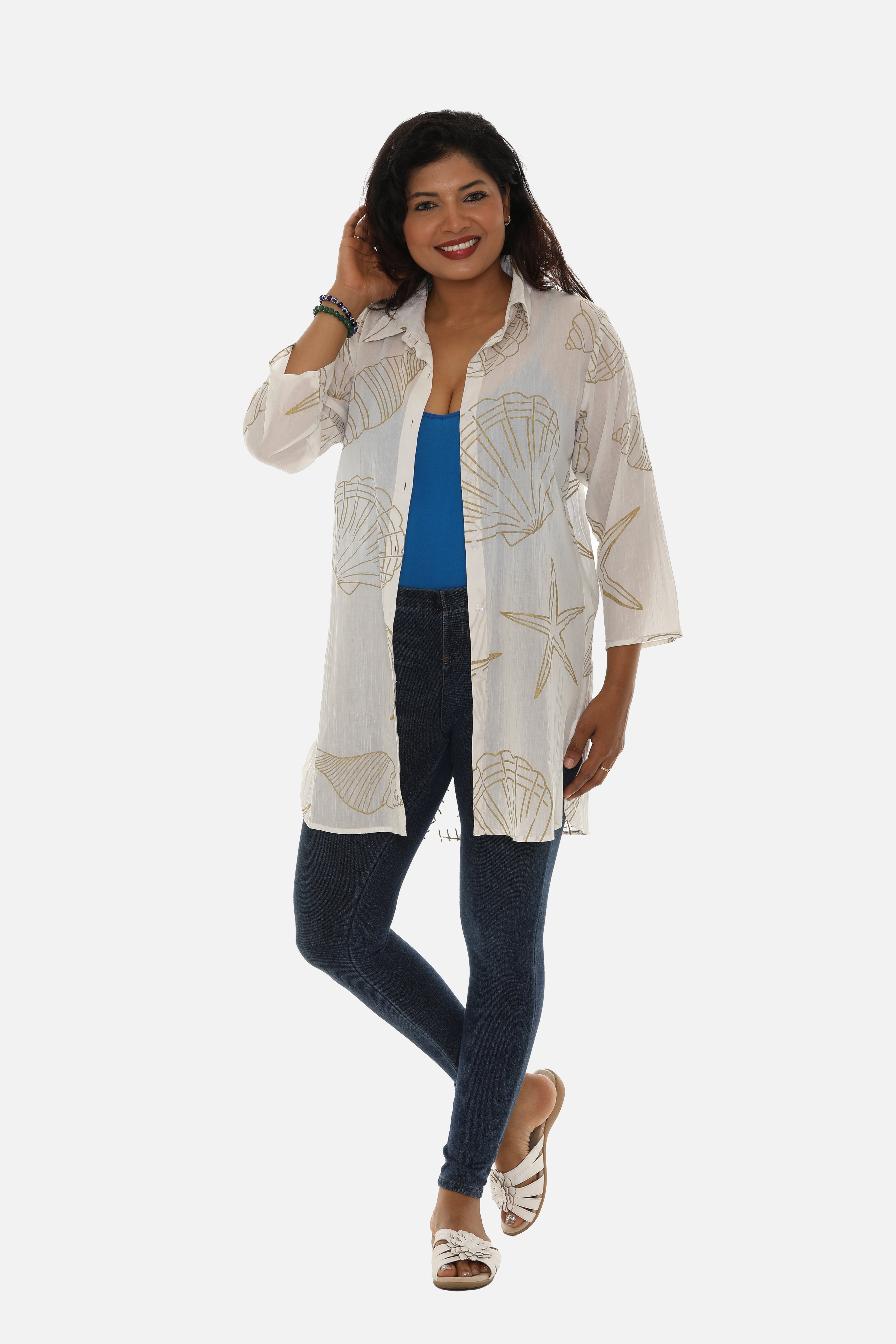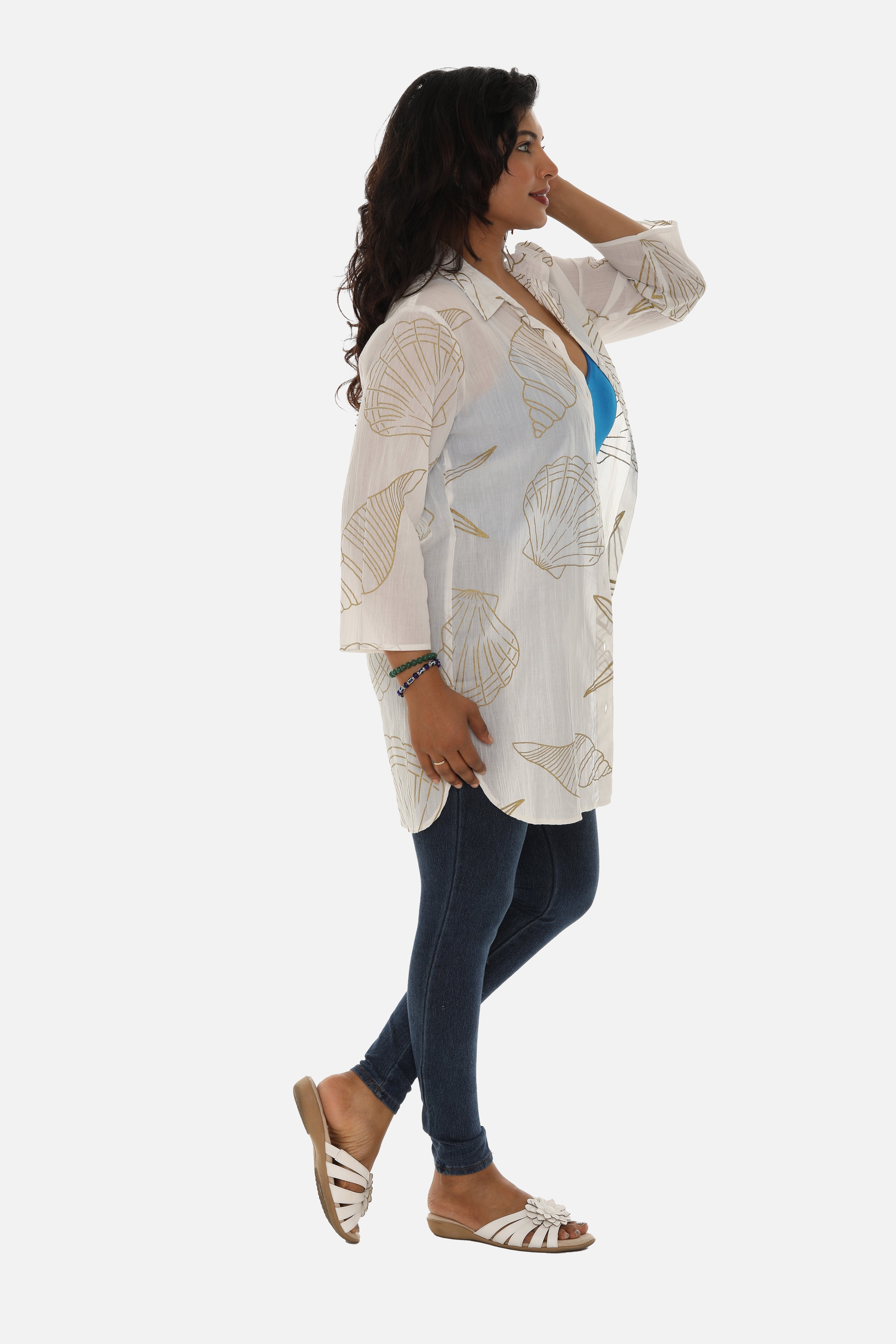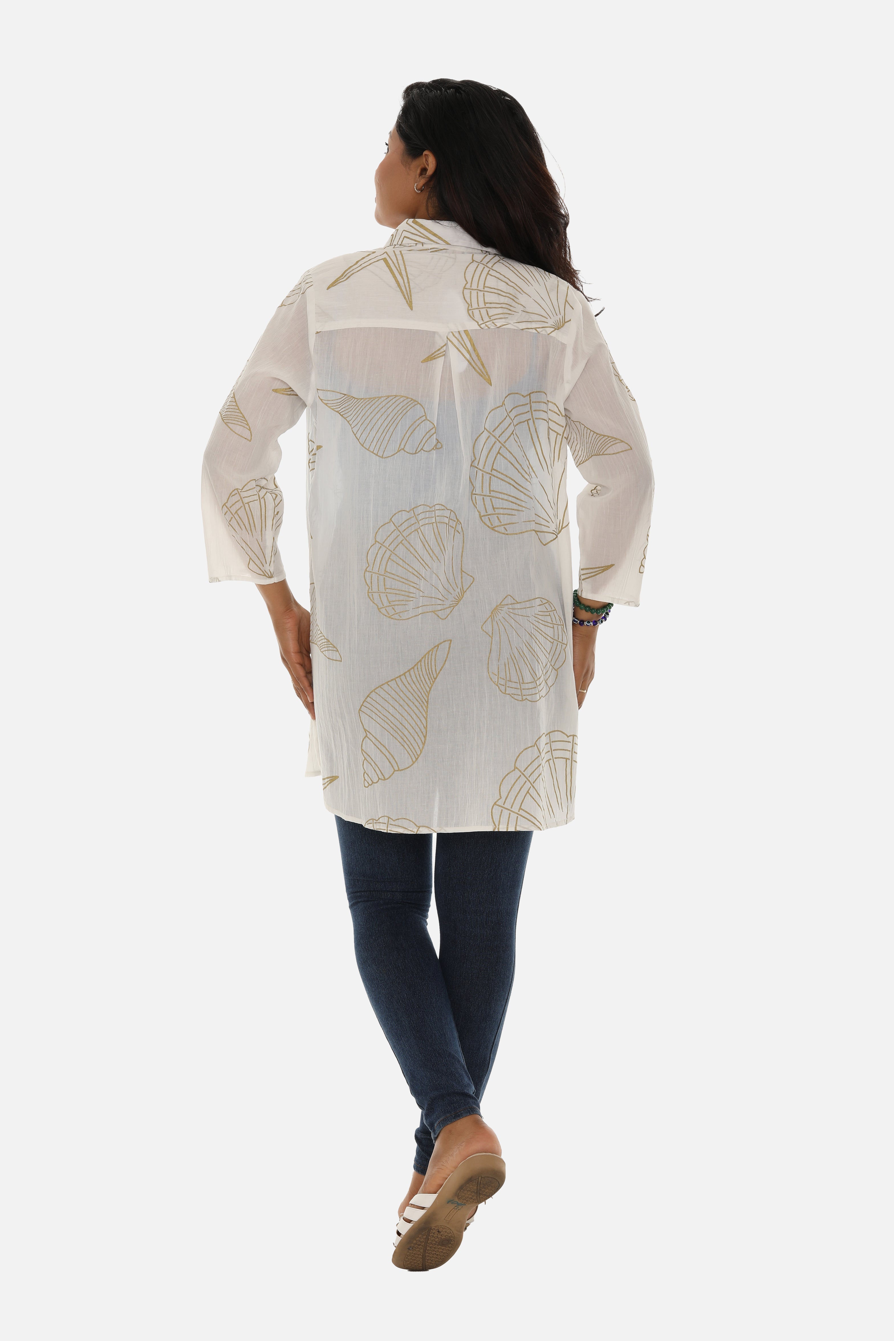 This women's button-down white shirt features a stylish gold sea shell print, adding a touch of elegance to any outfit. Perfect for both casual and formal occasions, this shirt is a versatile addition to any wardrobe.