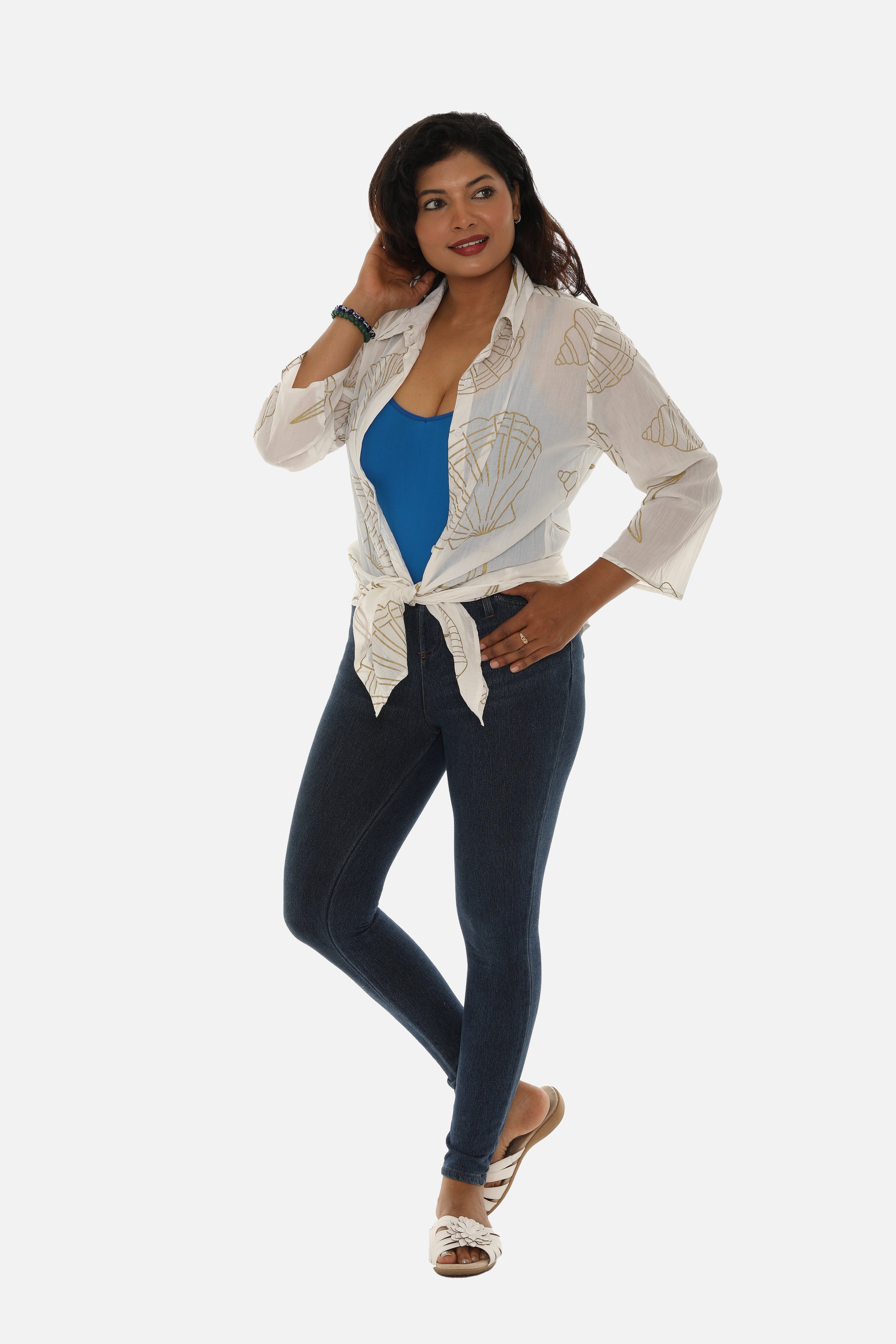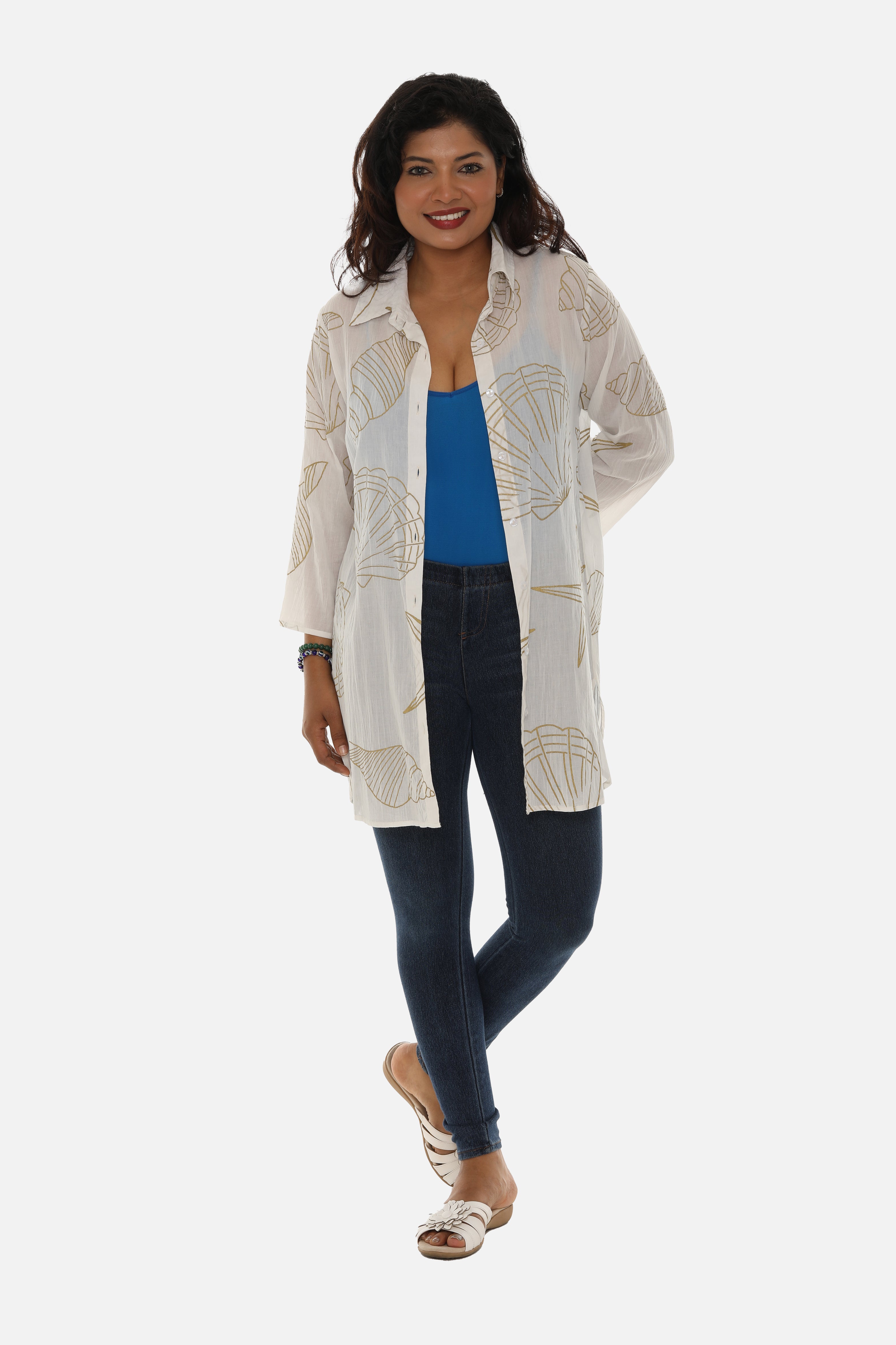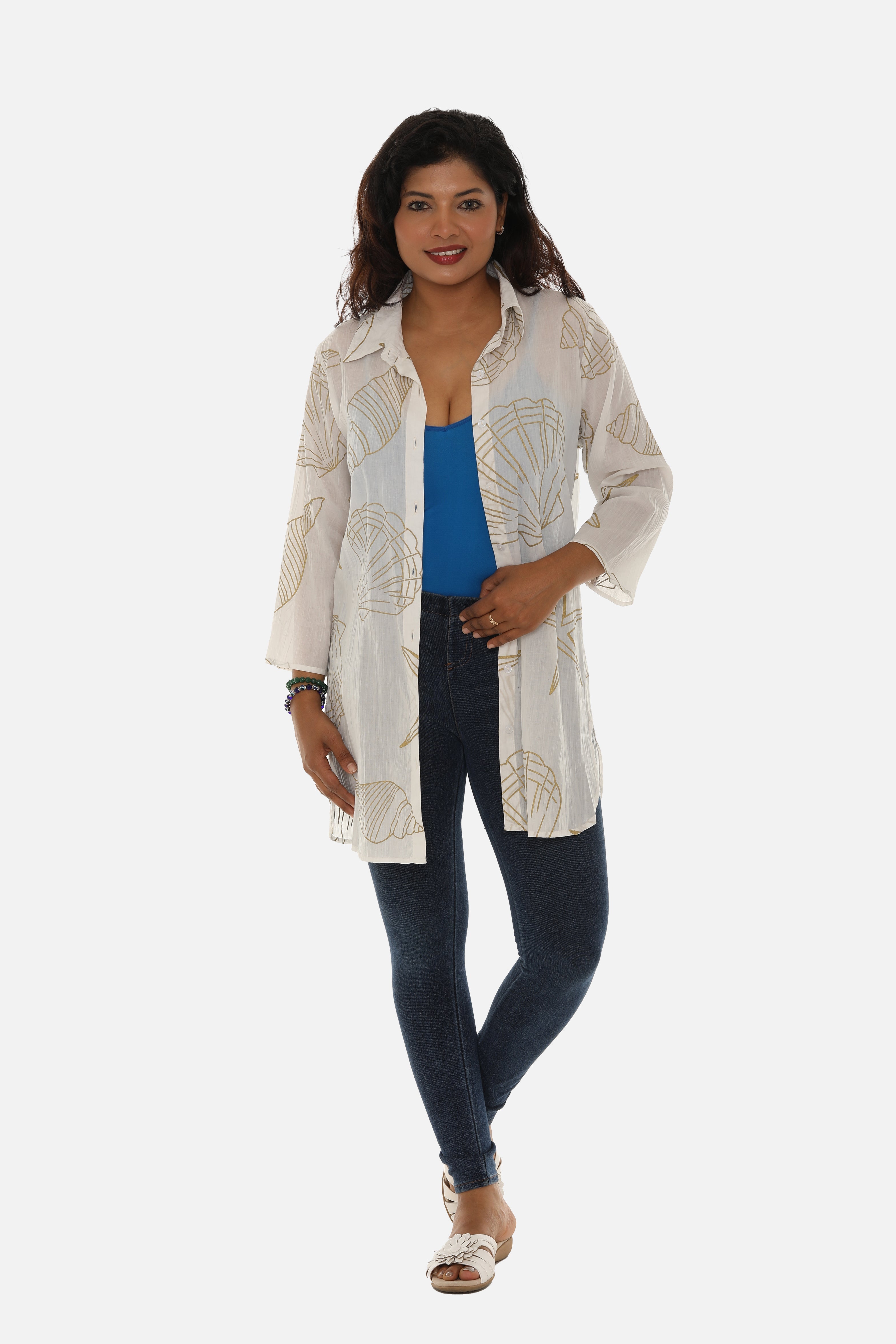 This women's button-down white shirt features a stylish gold sea shell print, adding a touch of elegance to any outfit. Perfect for both casual and formal occasions, this shirt is a versatile addition to any wardrobe.