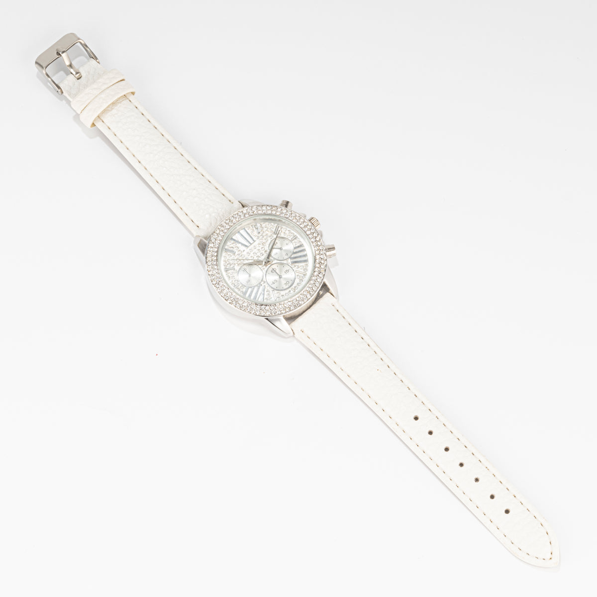 Fun meets glamour with our winter white leather band watch. A simple white strap complements a sparkling crystal-studded face, adding a playful yet sophisticated touch to your wristwear collection.