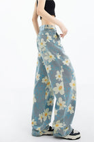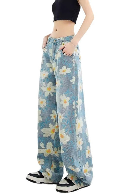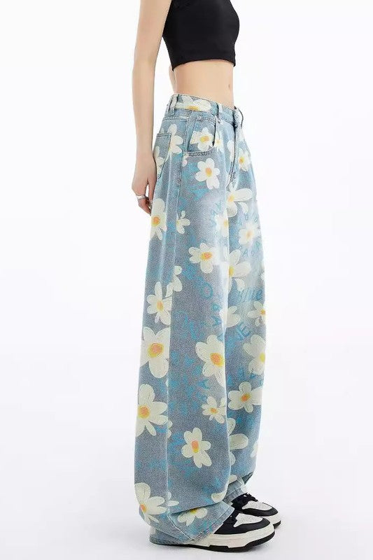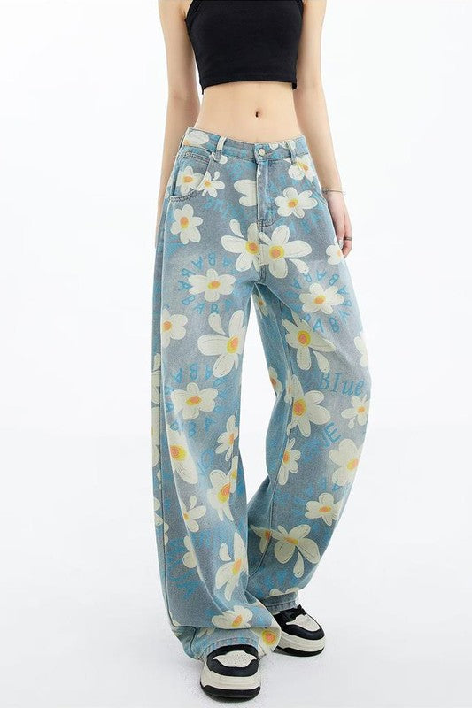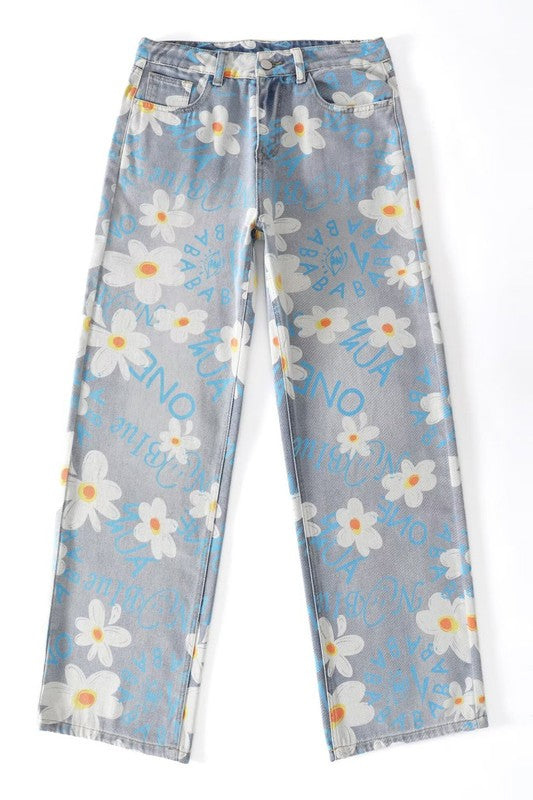 Details: denim printing multi flower pants, five pocket, boyfriend style pants, belt loop