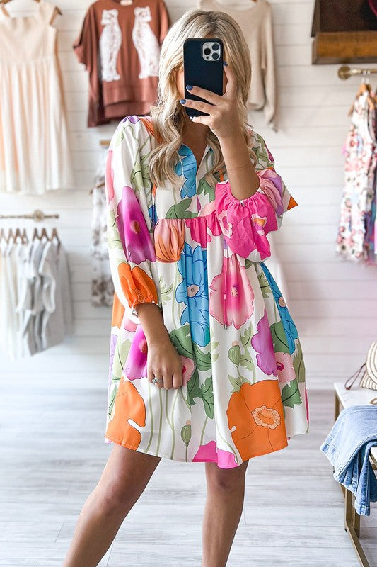 Women Floral Print Split Neck Babydoll Dress