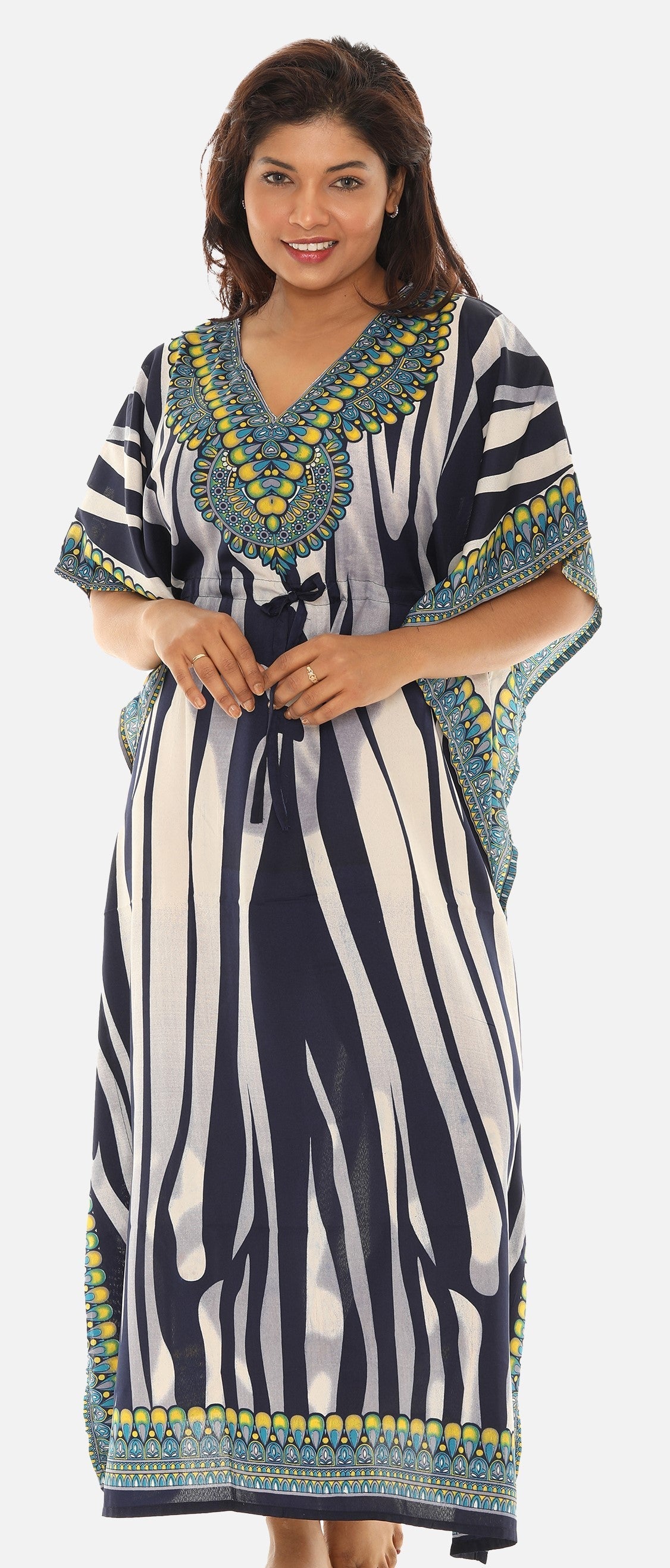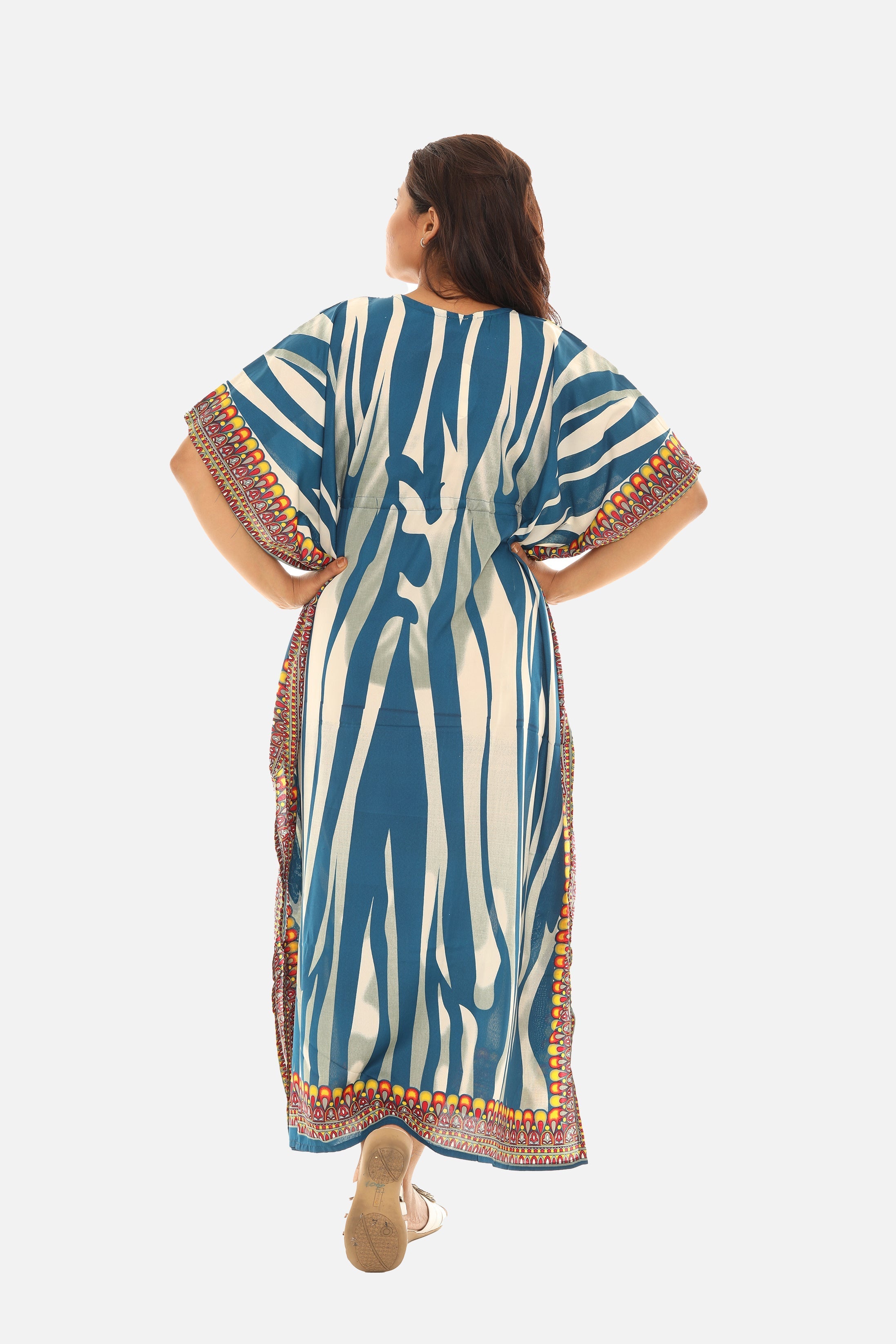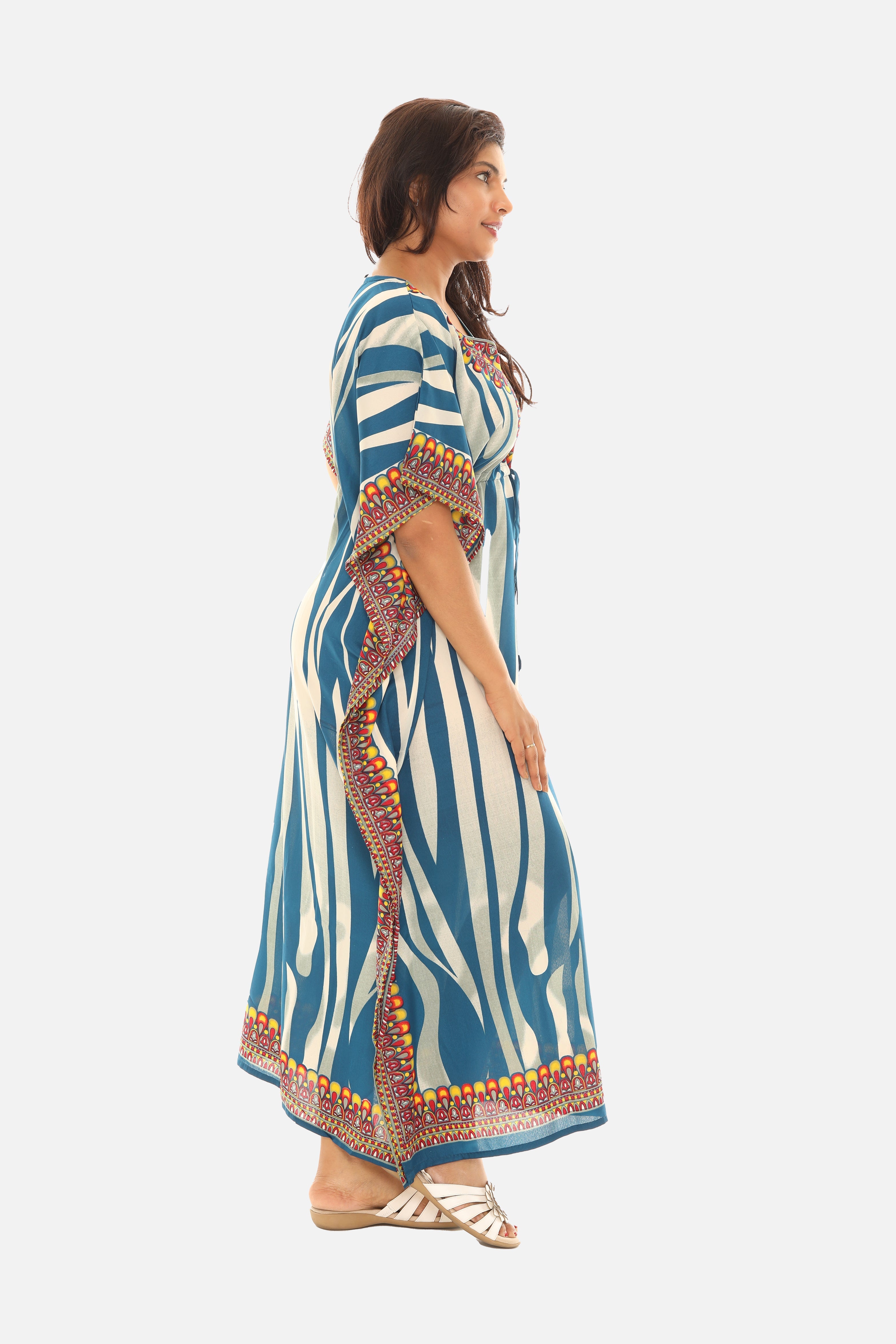 It's summer – trade your day-to-day outfits for this marvelous long printed caftan for women! Made from lightweight, breathable material in a caftan silhouette, this beautiful piece will keep you breezy, cool, and stylish all summer long! With dainty ties and intricate prints, you'll look stunning for any beach outing or romantic evening. Let this long printed caftan for women draw all eyes on you!